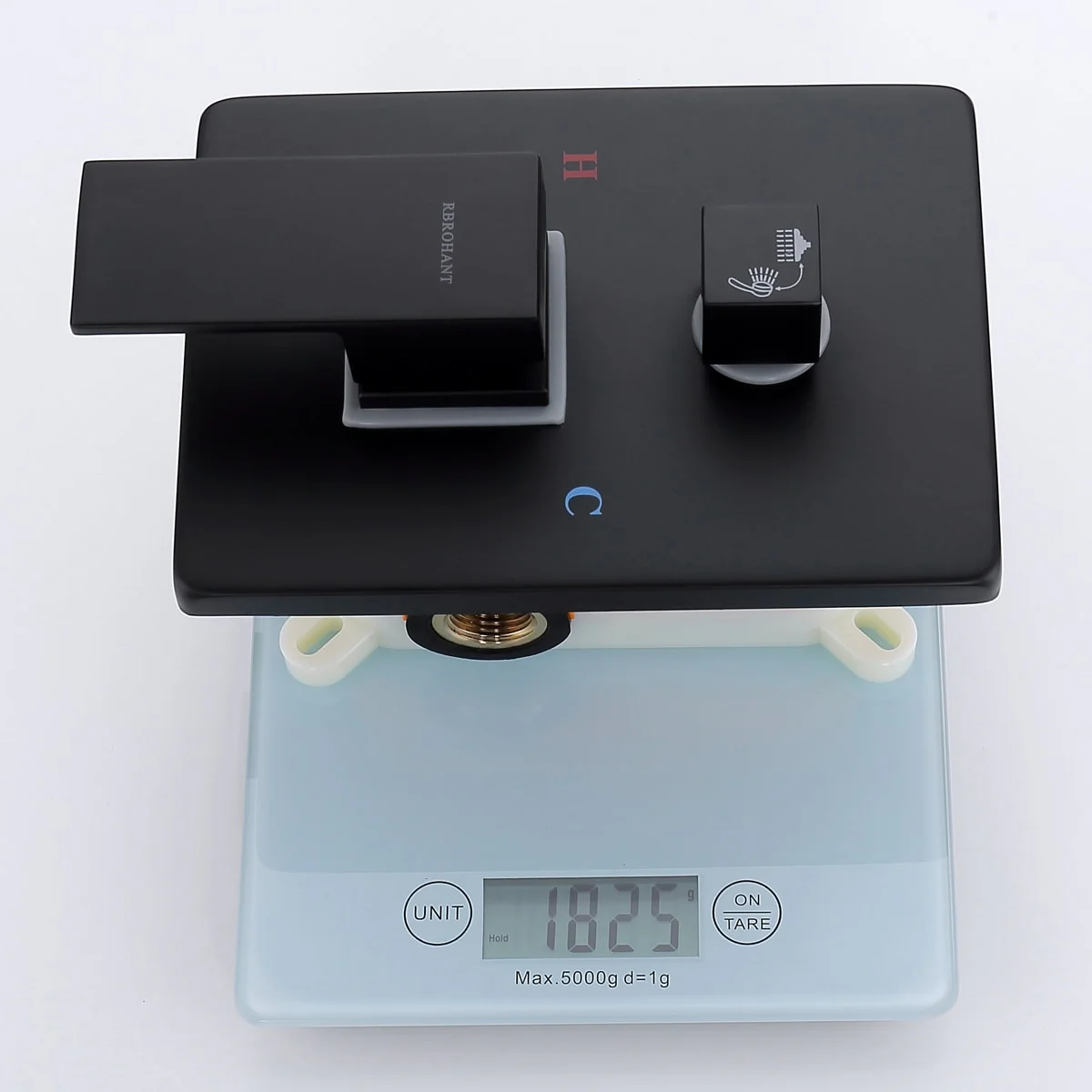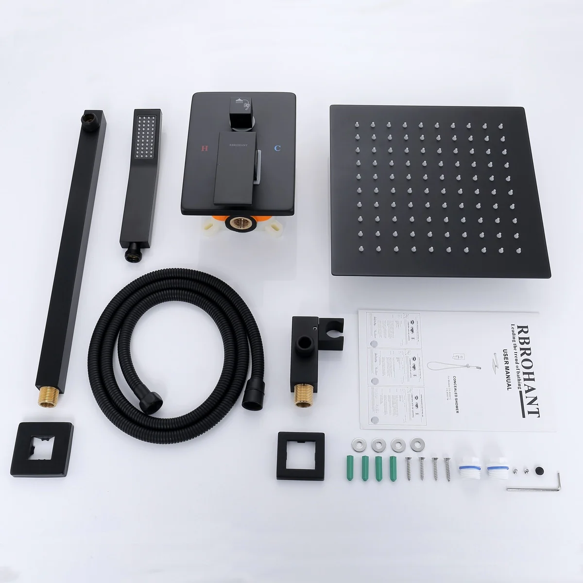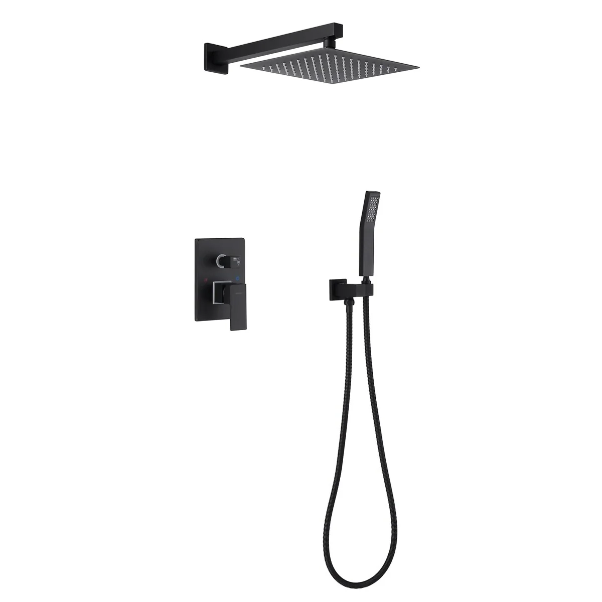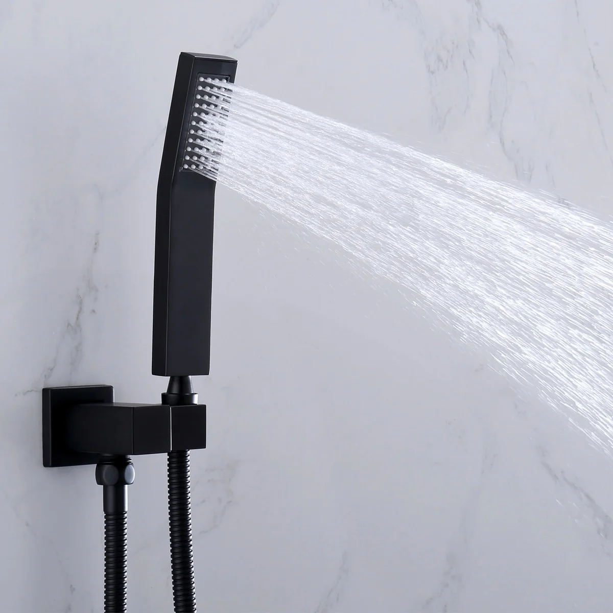 Finish : matte black Valve Type: Ceramic Valve Item Weight (pound) :10 Shower Head(stainless steel) Size: 10*10 inch Shower Arm(brass) Length:15.7INCHES Hand Shower Hose (stainless steel) Length:59 INCHES Connection: Standard NPT 1/2'