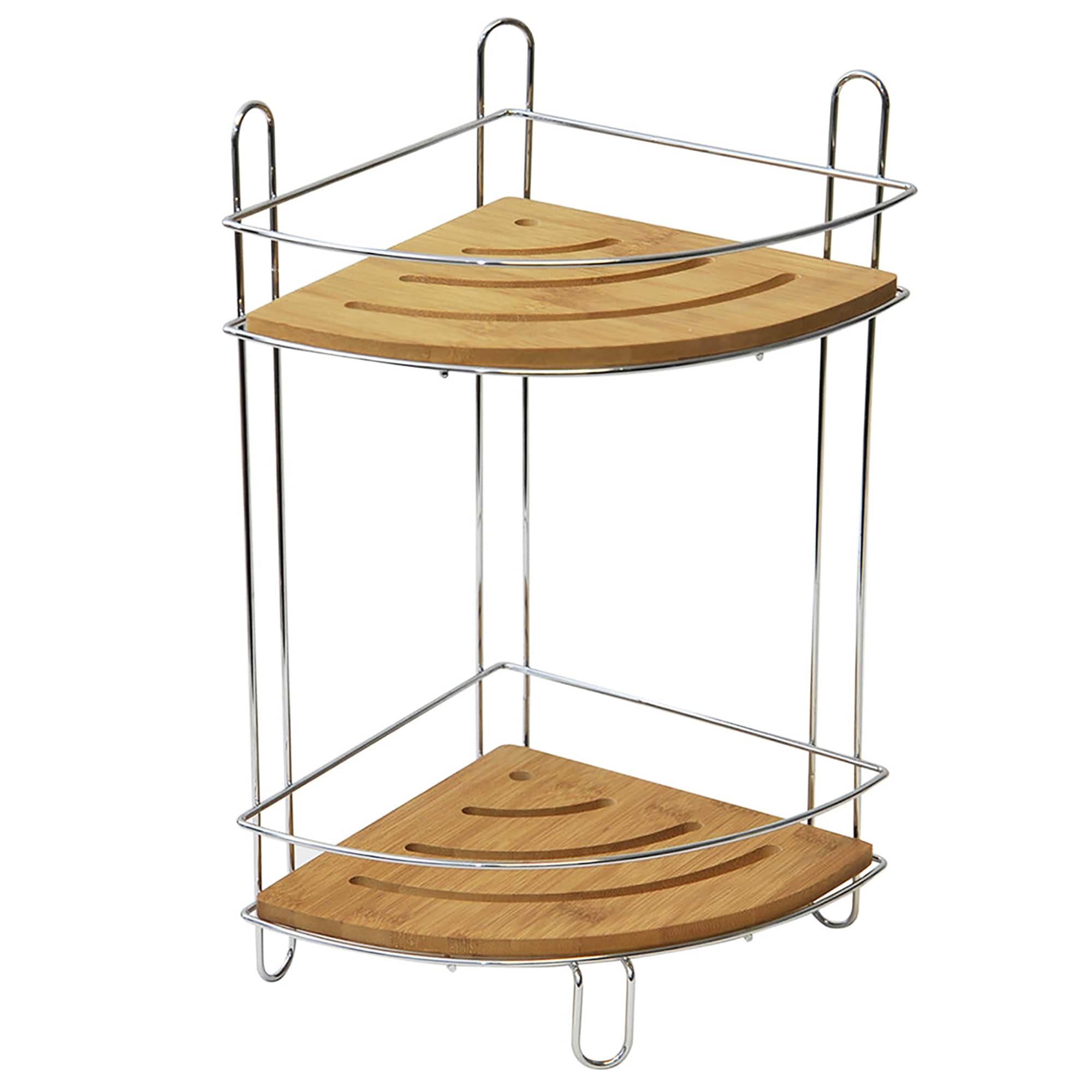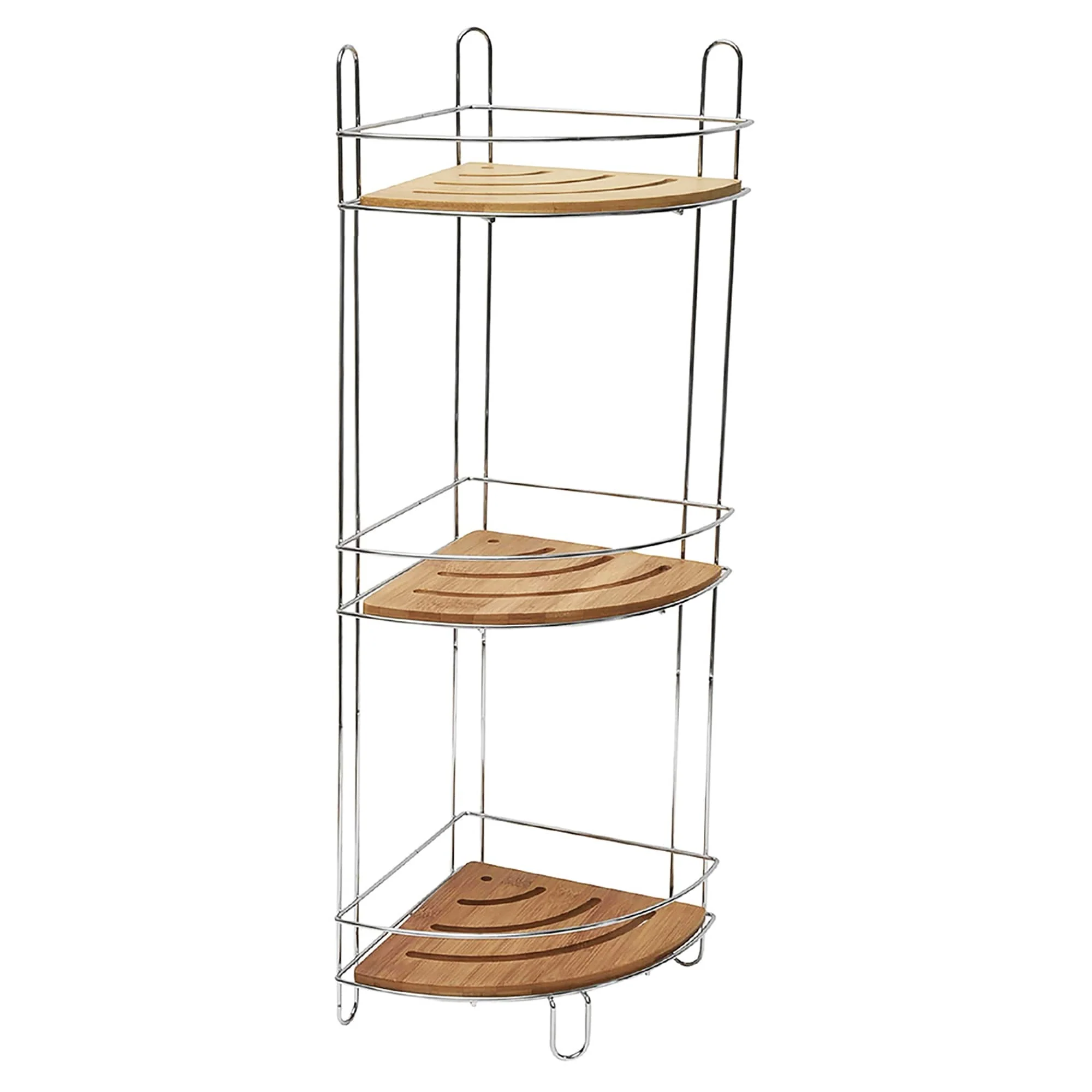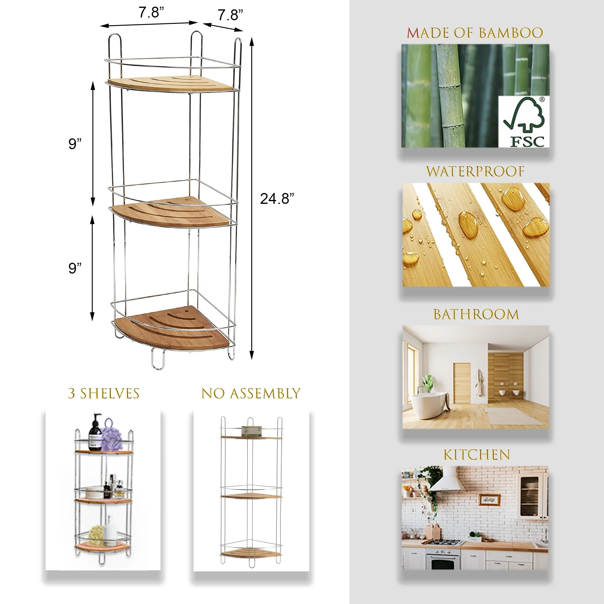 - This bathroom corner organizer is also available in chrome metal and is perfect for your master bathroom, kid's bathroom, guest bathroom, and any room in your house. Please note that bamboo is a living material and the shelves may darken as they age, especially in wet rooms. To slow down this process, we recommend drying the wooden parts with a dry cloth once a week. Get your space in order with our bamboo corner storage tower!