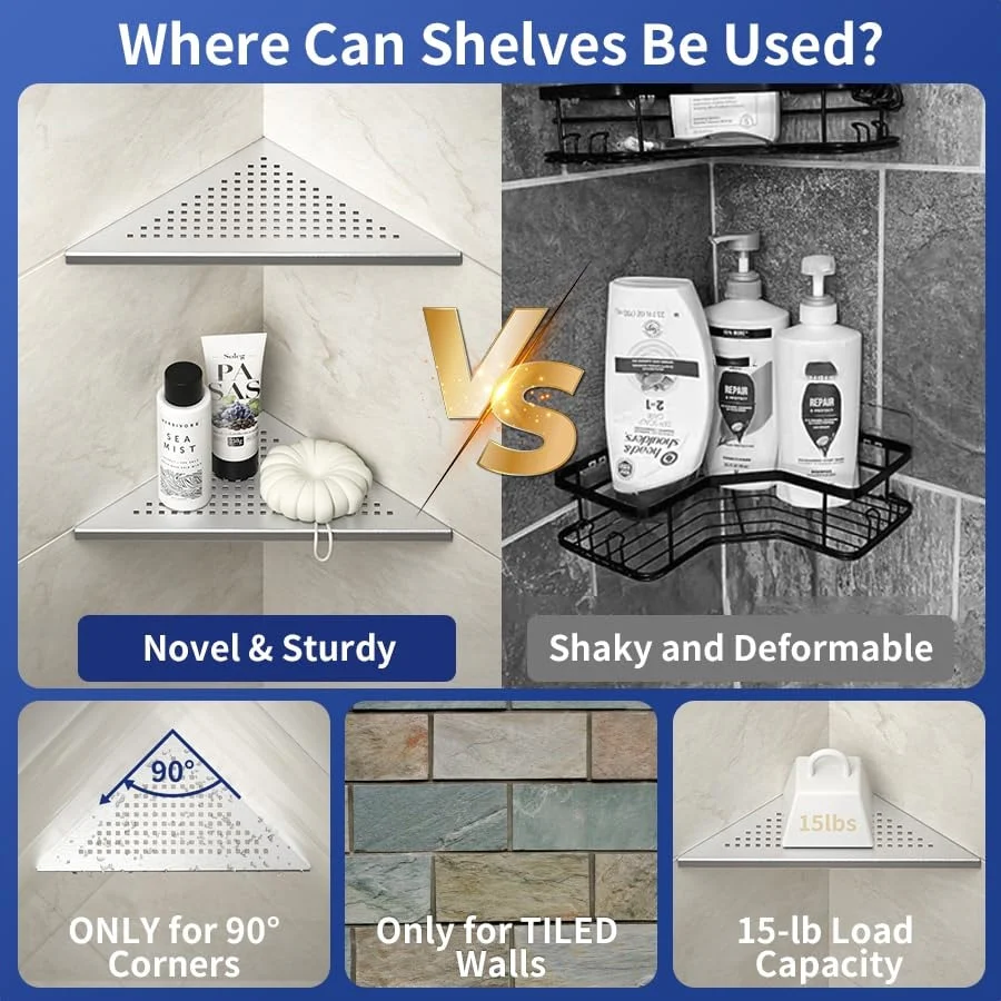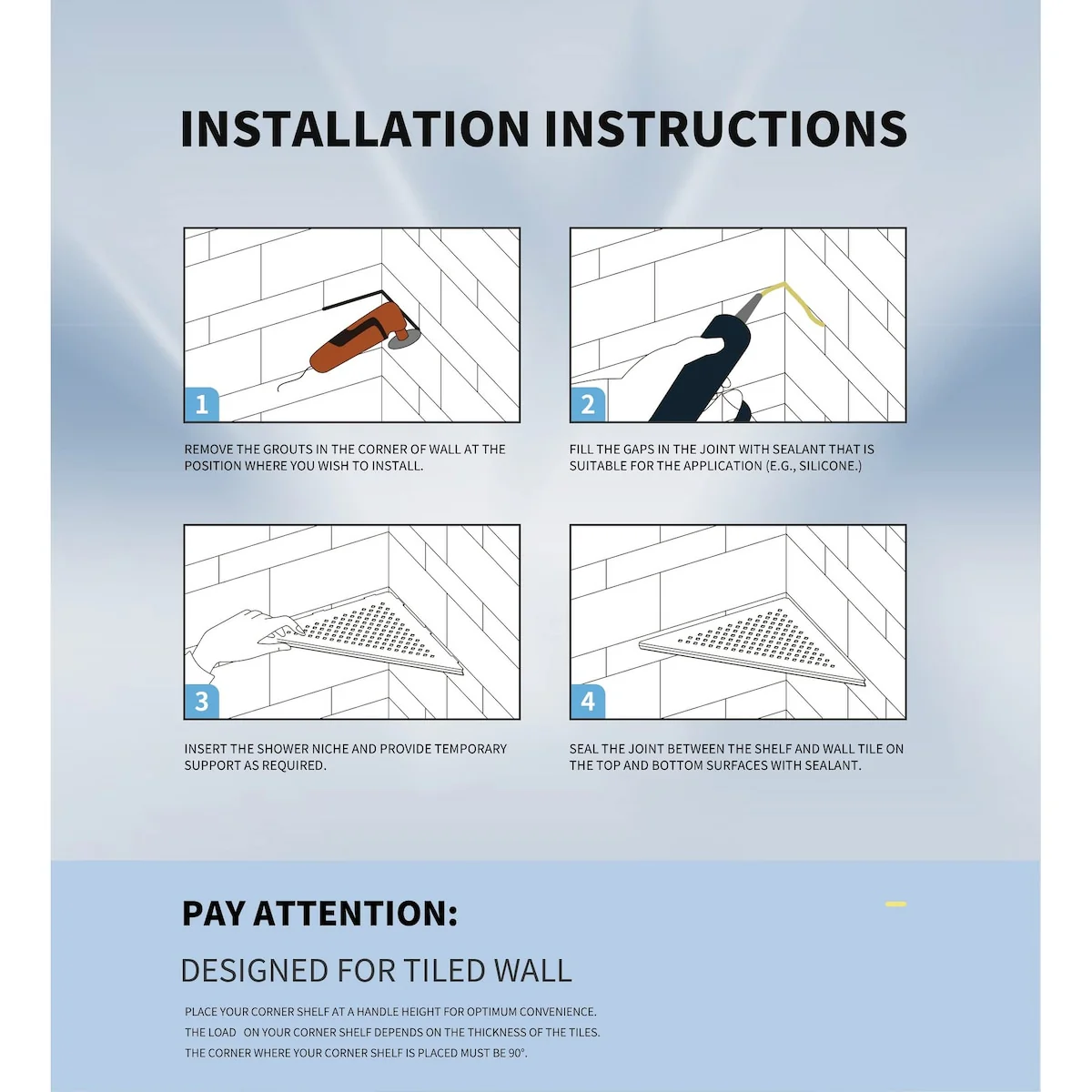 【SUS304 Durable & Heavy Duty】Our bathroom shelves are made of ASTM standard 304 stainless steel, which can protect against corrosion, scratches and rust for long-lasting durability. With 1.5 mm thickness can hold up to 15 pounds per shelf. These shelves are designed for TILED WALL. No drilling or adhesive needed.