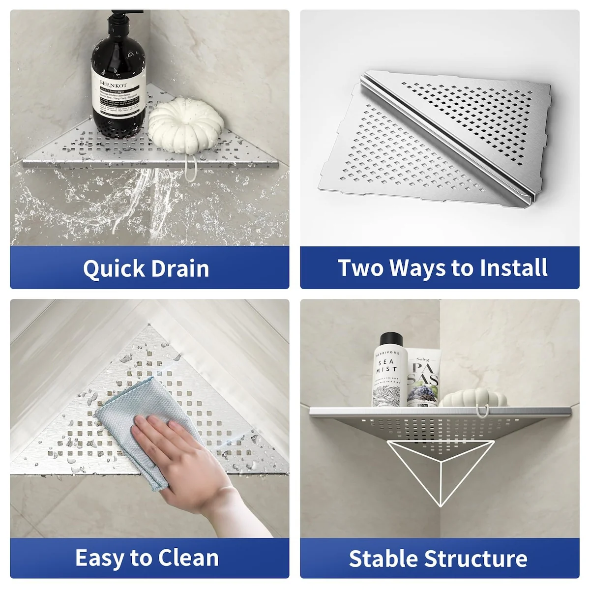 【Rapid Drainage】No water pooling. Slots on corner shelf can make water drain fast and keep your bath products on the shower shelf dry and clean. It can also be used as a footrest when shaving. Matching shower drain grates and shower niches are also available.