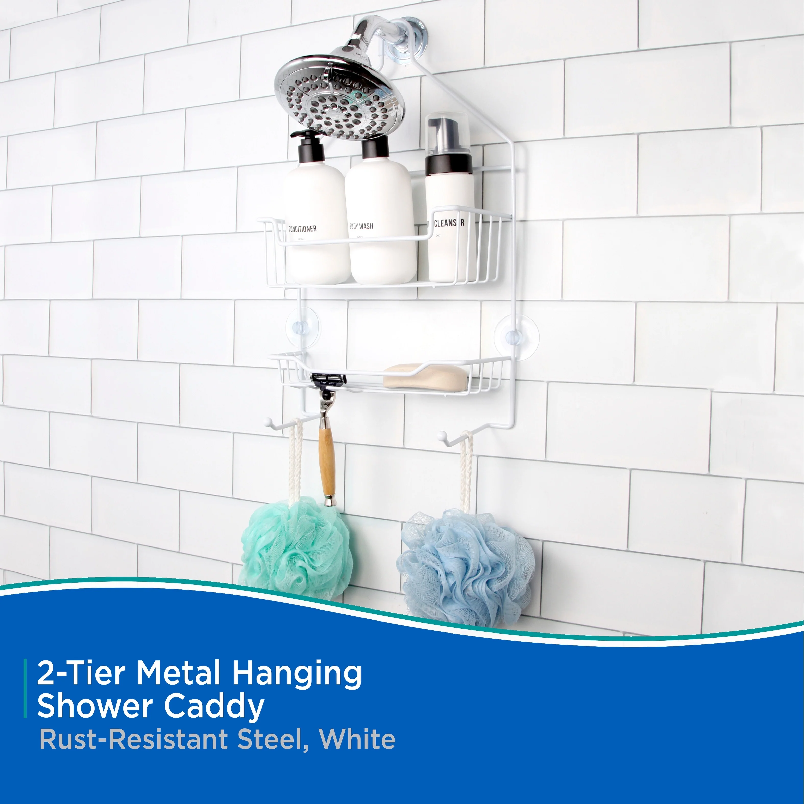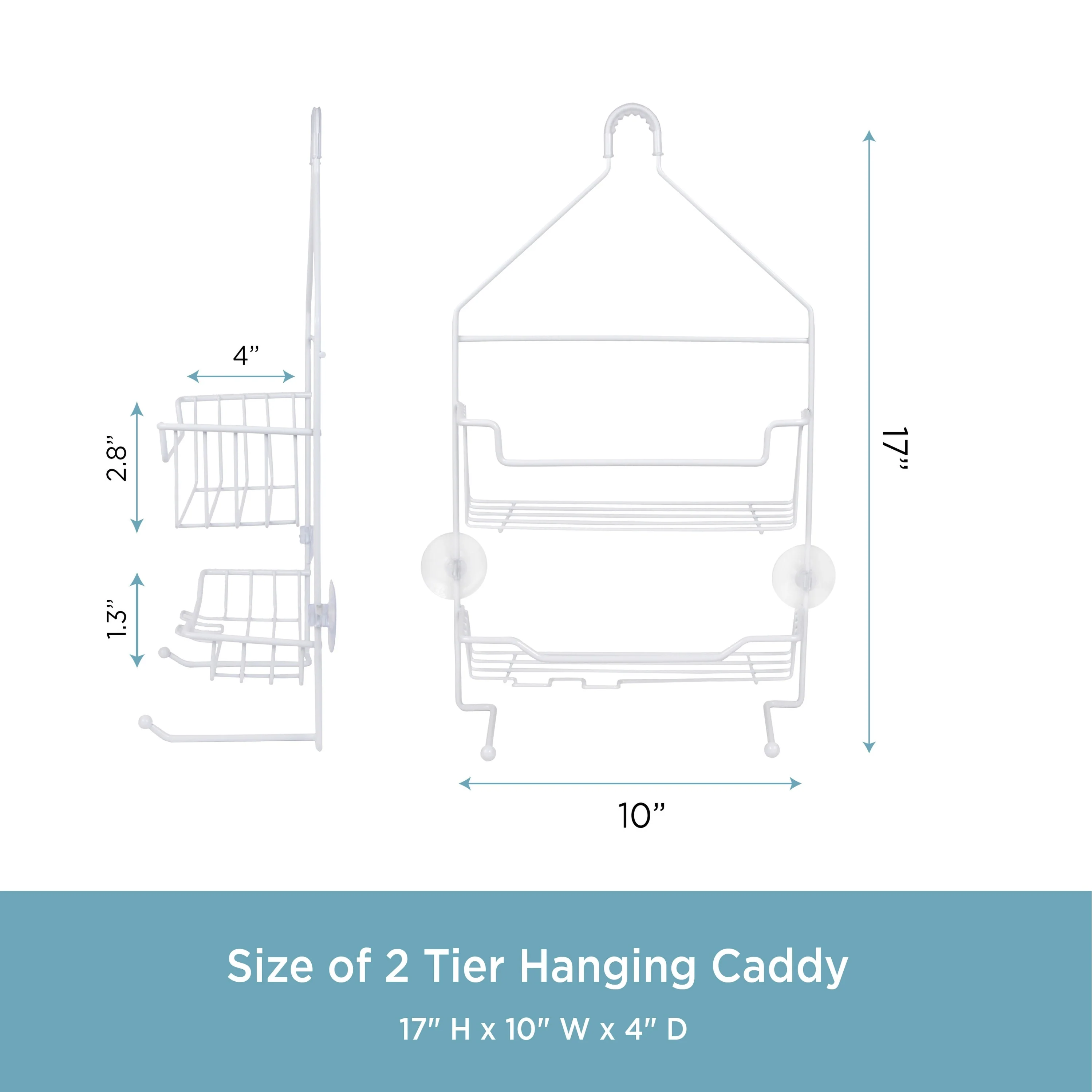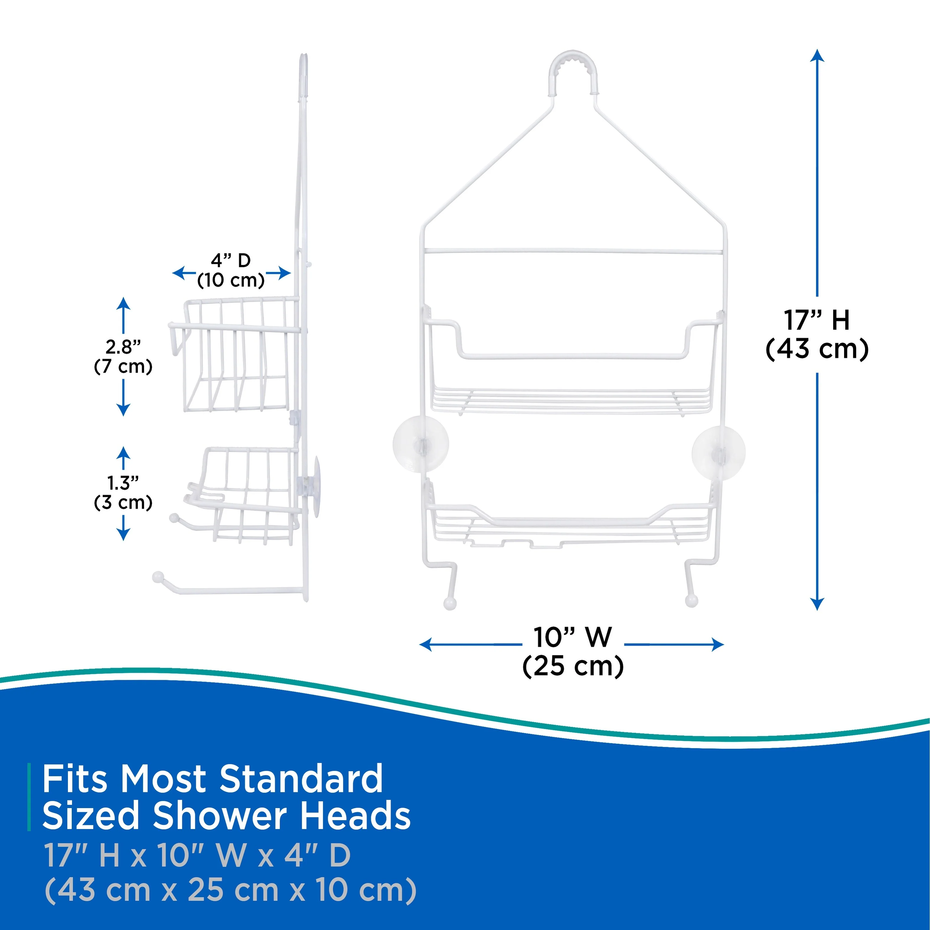 Organize your bath and maximize your storage with the Kenney Rust-Resistant 2-Tier Hanging Shower Caddy. It features two shelves, one razor holder, and two hooks. The razor holder keeps sharp razors out of the way and helps them last longer by letting them dry out after each use. The two hooks are ideal for hanging loofahs, washcloths, or other items such as a waterproof speaker. The caddy comes with a rubber collar and suction cups to help keep it in place. The collar also prevents scratches to your showerhead, and the suction cups reduce the need to balance items. This metal caddy measures 17' H x 10' W x 4' D (43 cm x 23 cm x 10 cm) and can be hung from showerheads with necks up to 0.75' in diameter.