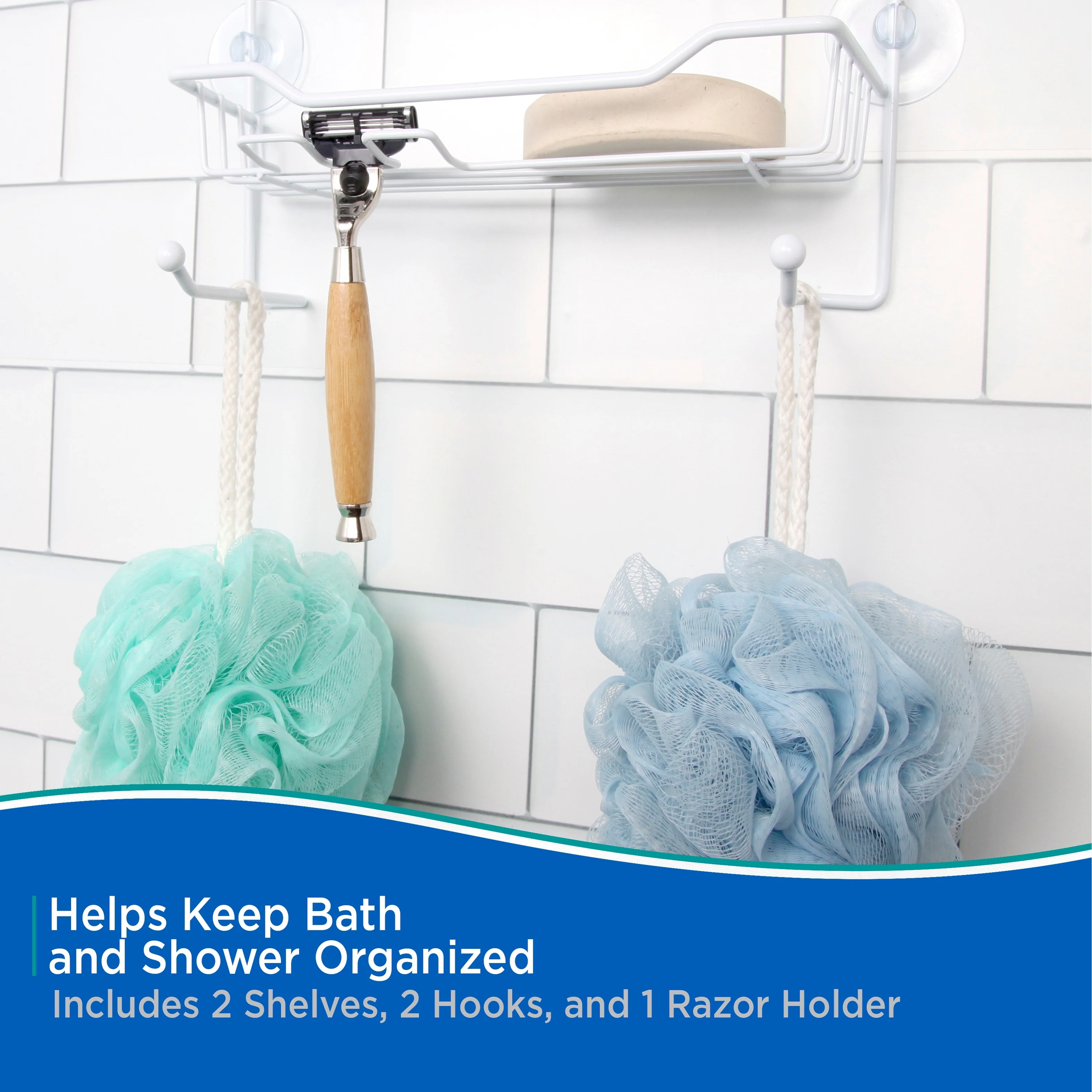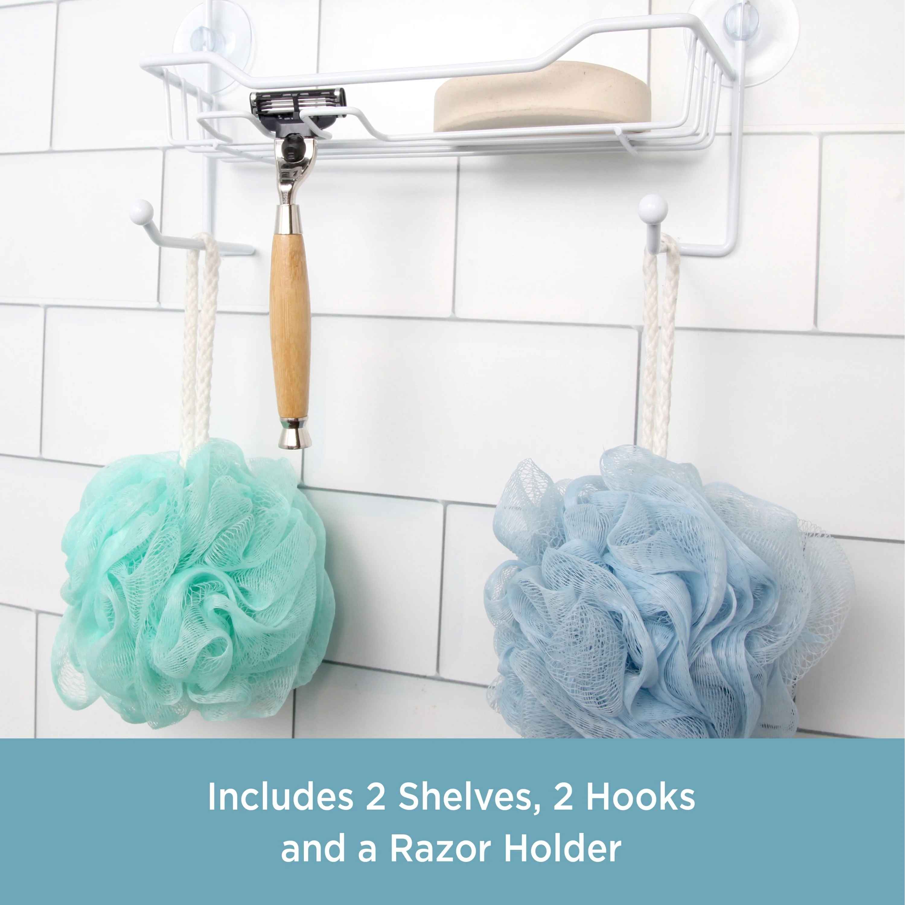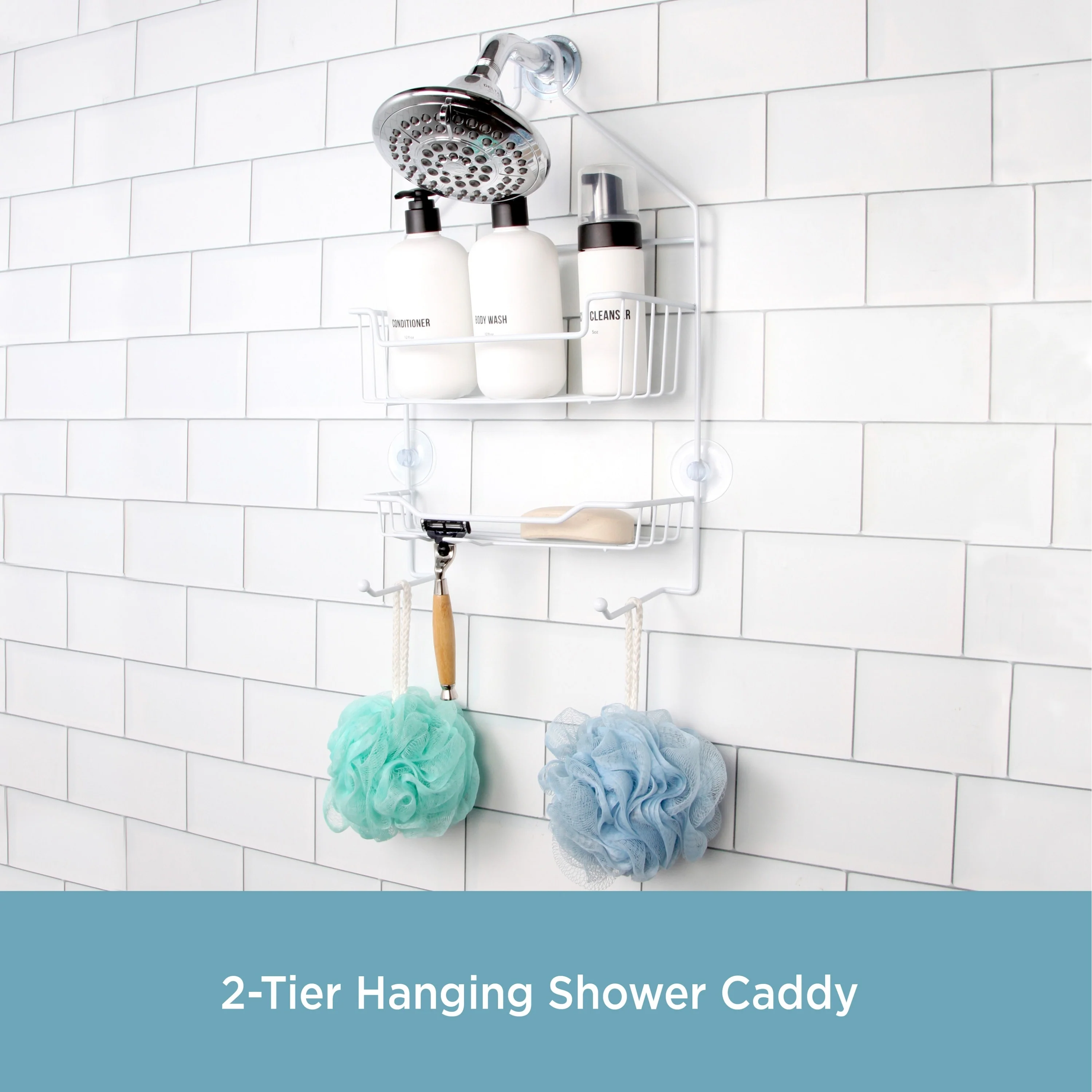 Organize your bath and maximize your storage with the Kenney Rust-Resistant 2-Tier Hanging Shower Caddy. It features two shelves, one razor holder, and two hooks. The razor holder keeps sharp razors out of the way and helps them last longer by letting them dry out after each use. The two hooks are ideal for hanging loofahs, washcloths, or other items such as a waterproof speaker. The caddy comes with a rubber collar and suction cups to help keep it in place. The collar also prevents scratches to your showerhead, and the suction cups reduce the need to balance items. This metal caddy measures 17' H x 10' W x 4' D (43 cm x 23 cm x 10 cm) and can be hung from showerheads with necks up to 0.75' in diameter.