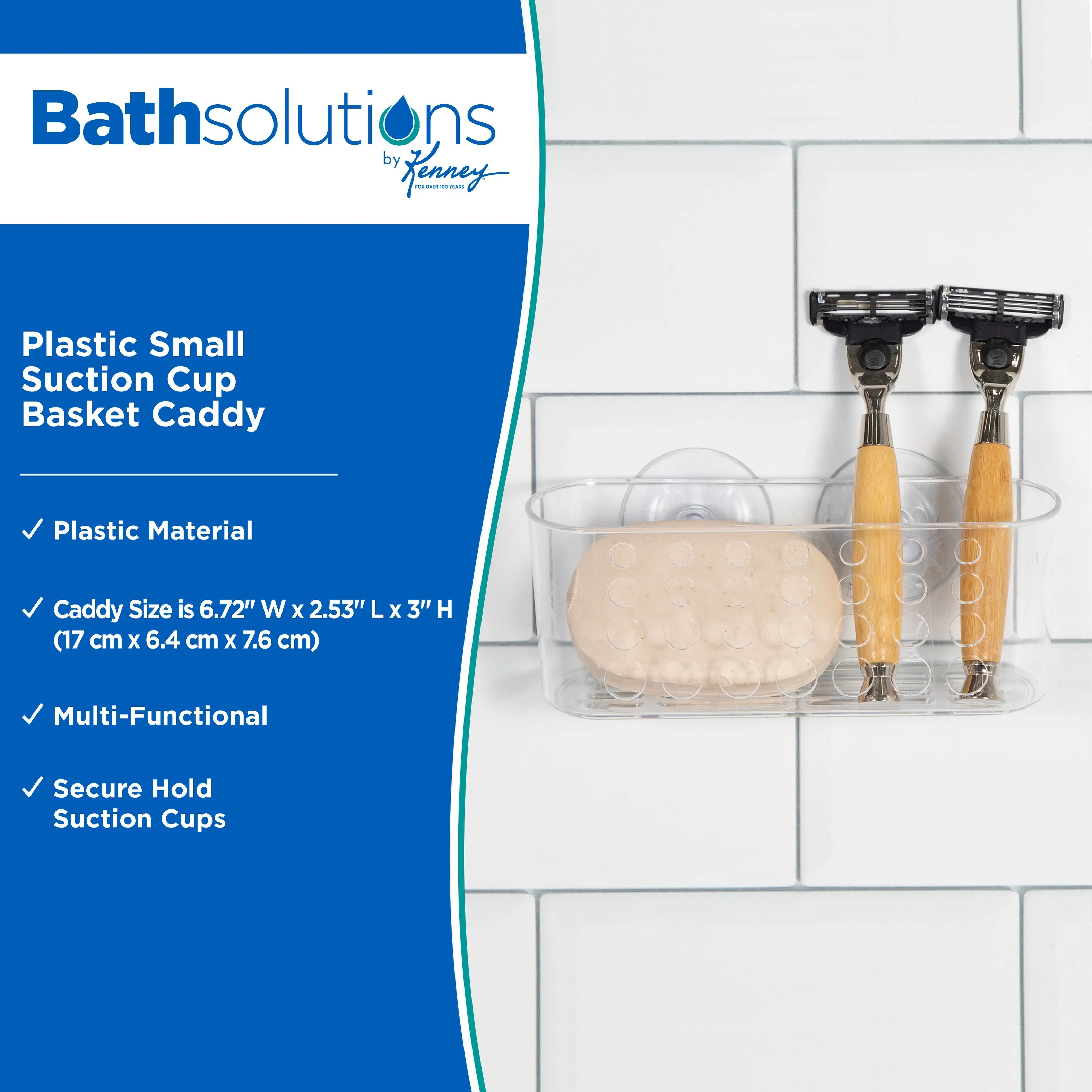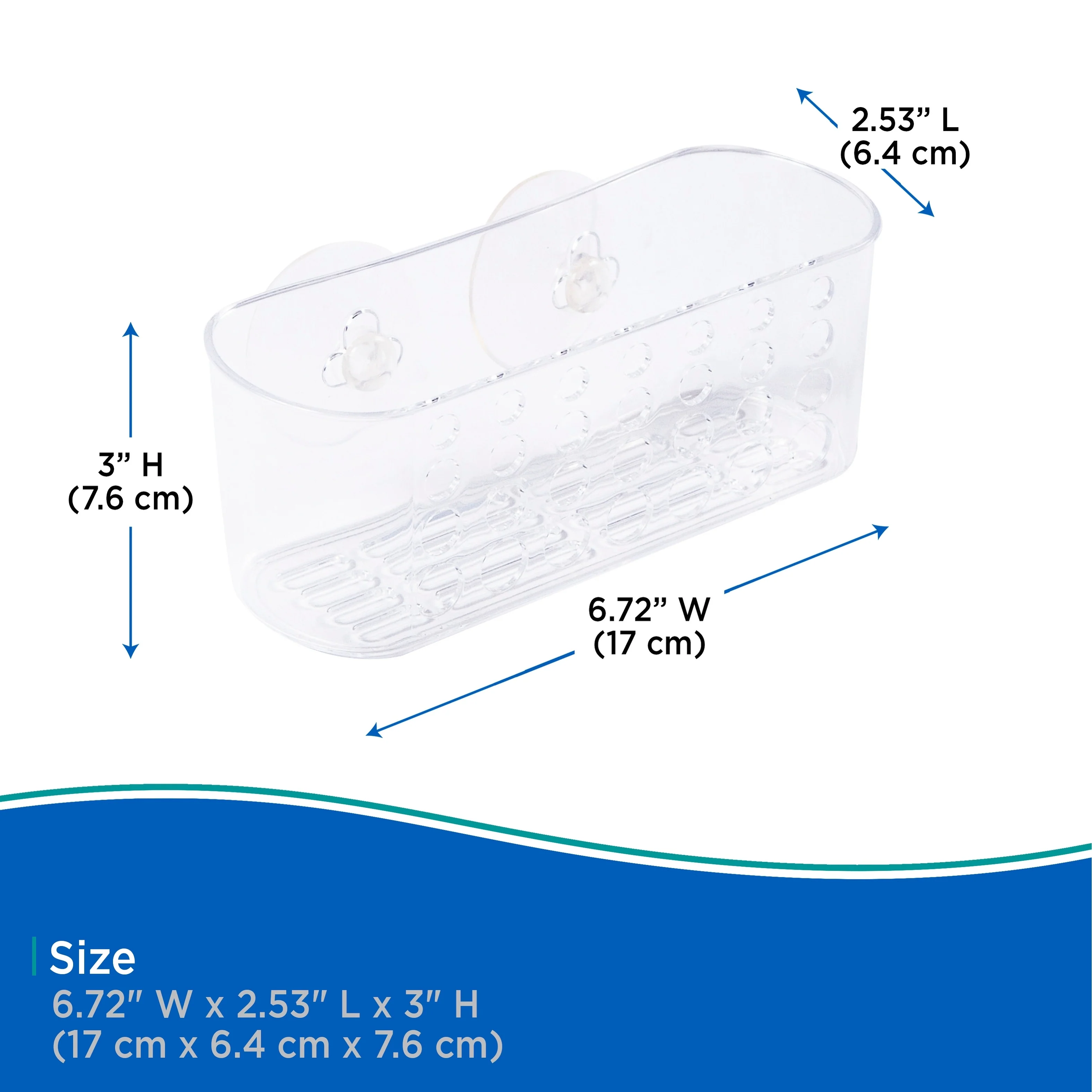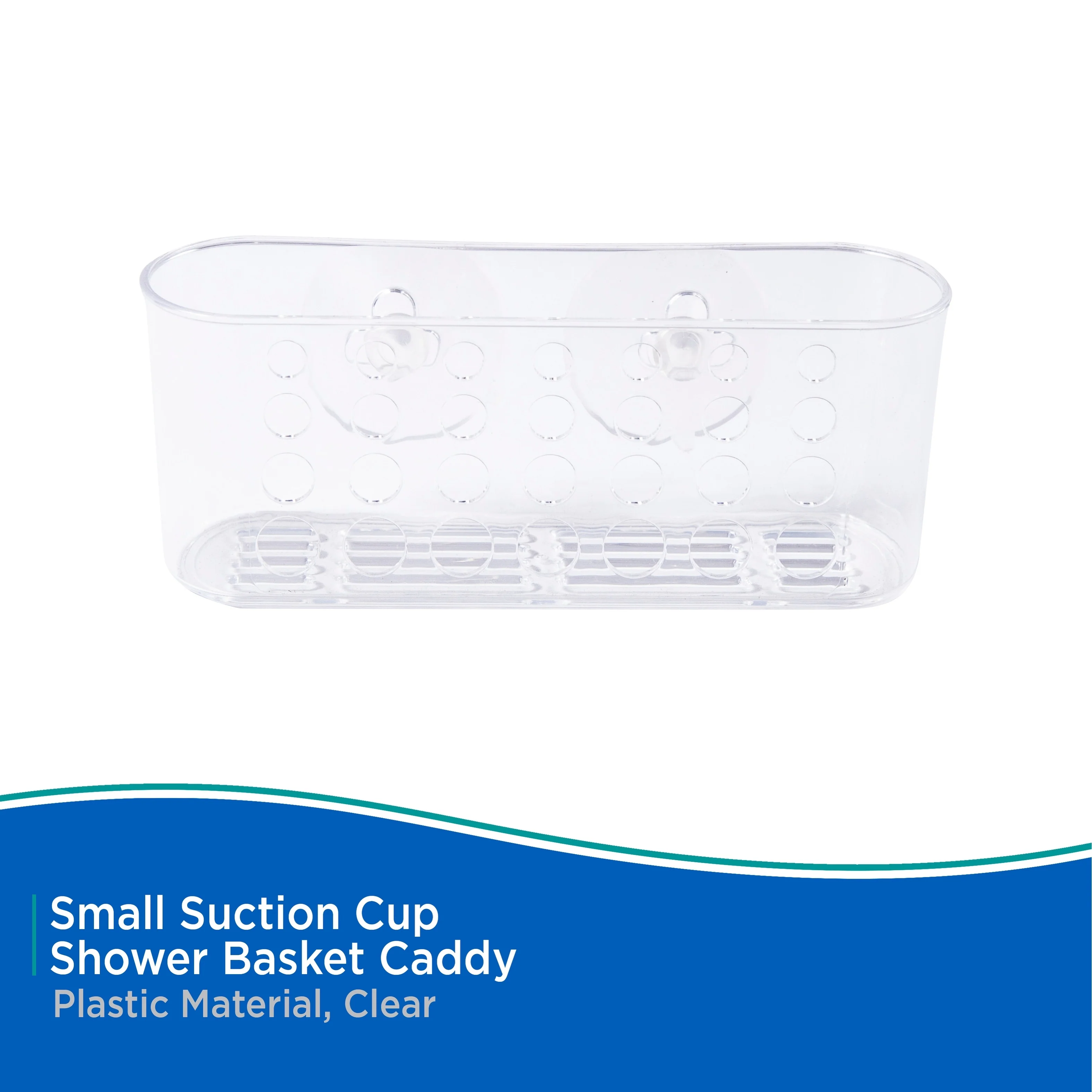 The Kenney Small Suction Cup Basket Caddy gives you a little extra storage where you need it, without the bulkiness of a full-size caddy. Perfect for storing hand soap, bar soap, bath sponges, nail scrub brushes, pumice stones, poufs, leave-in hair oils conditioners, and lotions. Two strong suction cup adhere to any non-porous surface such as tile, glass, fiberglass, and some metals. Constructed of clear durable plastic for years of quality use. To install: clean, moisten and press firmly into place. Care instructions: clean with mild soap and water; do not place in dishwasher. Measures 2.53' L x 6.72' W x 3' H.