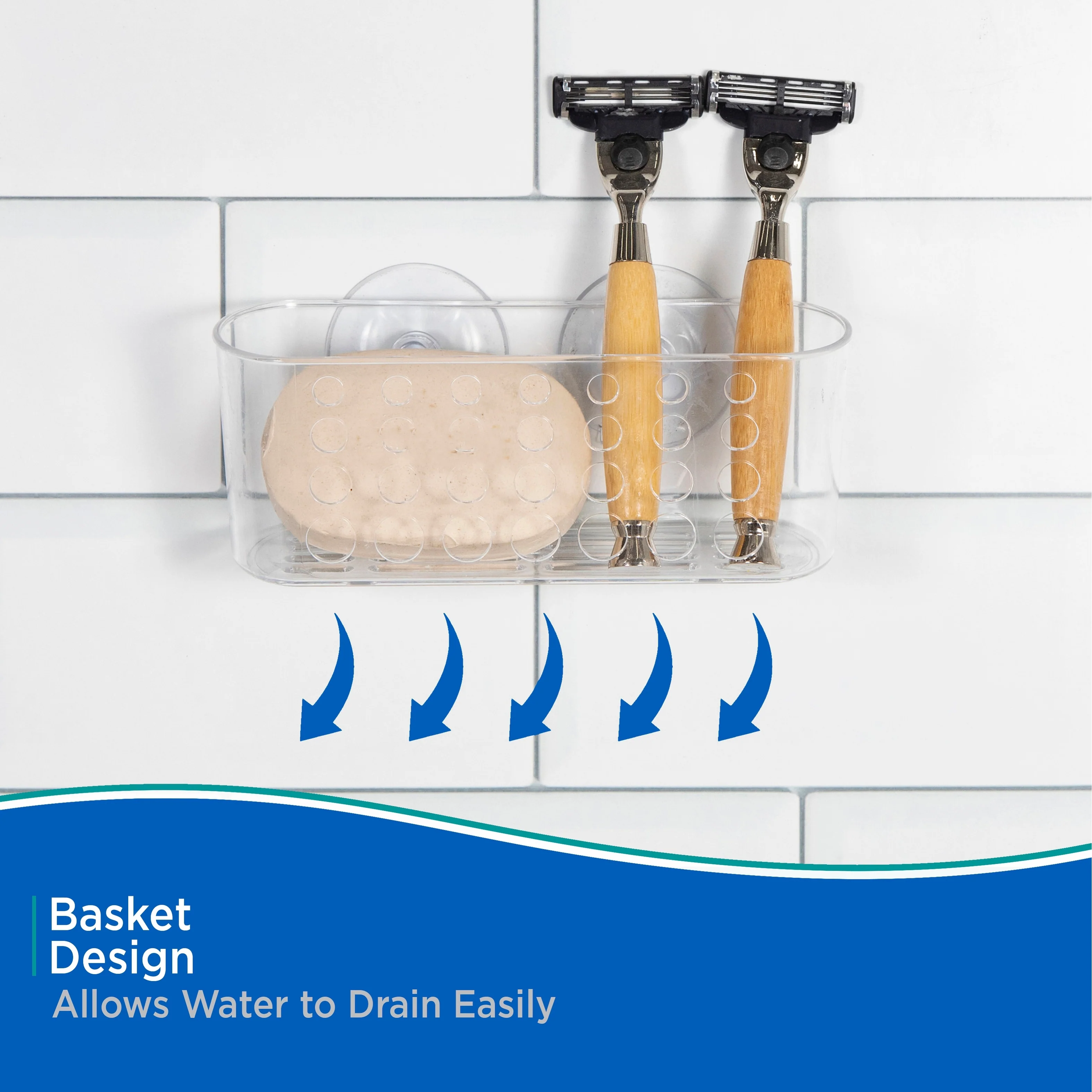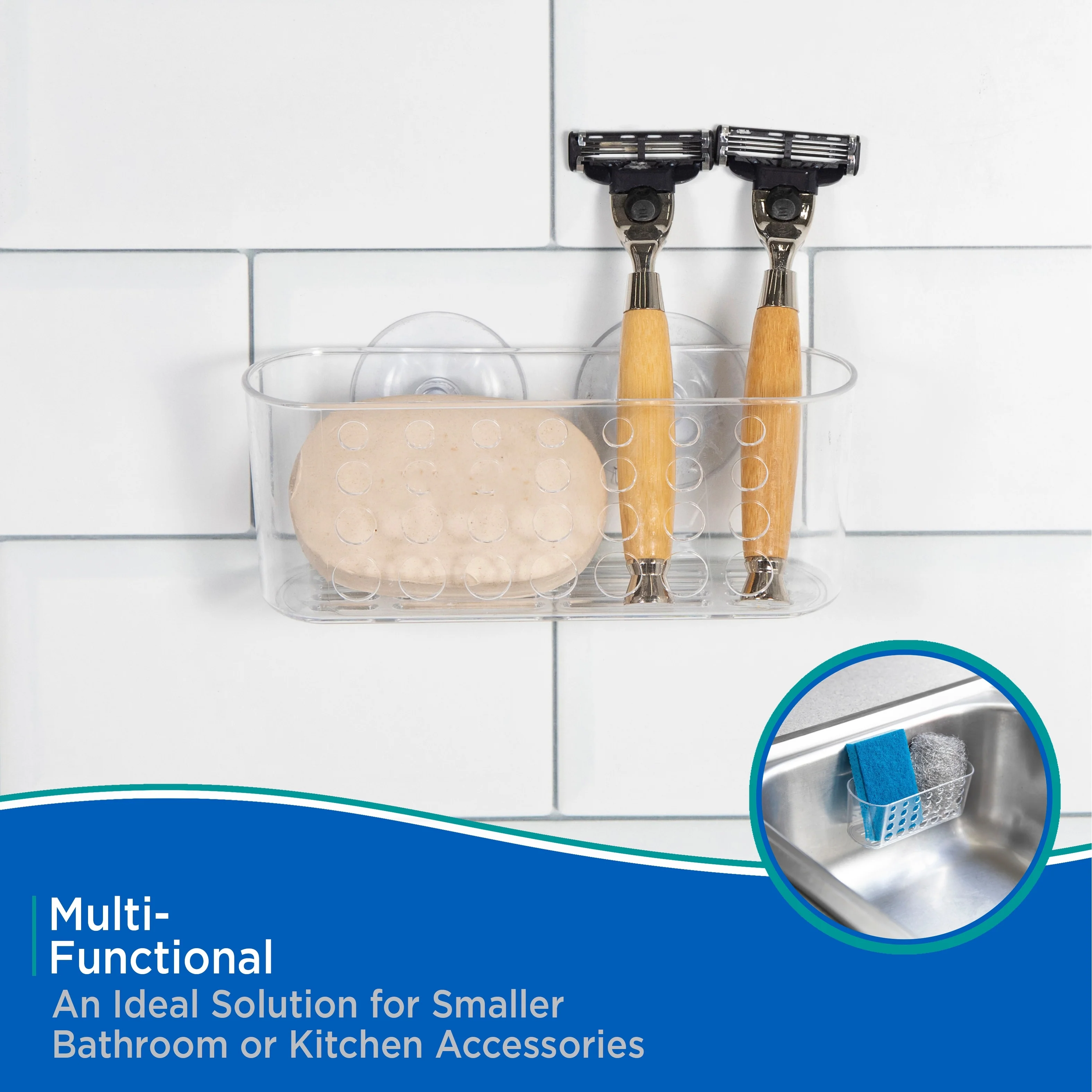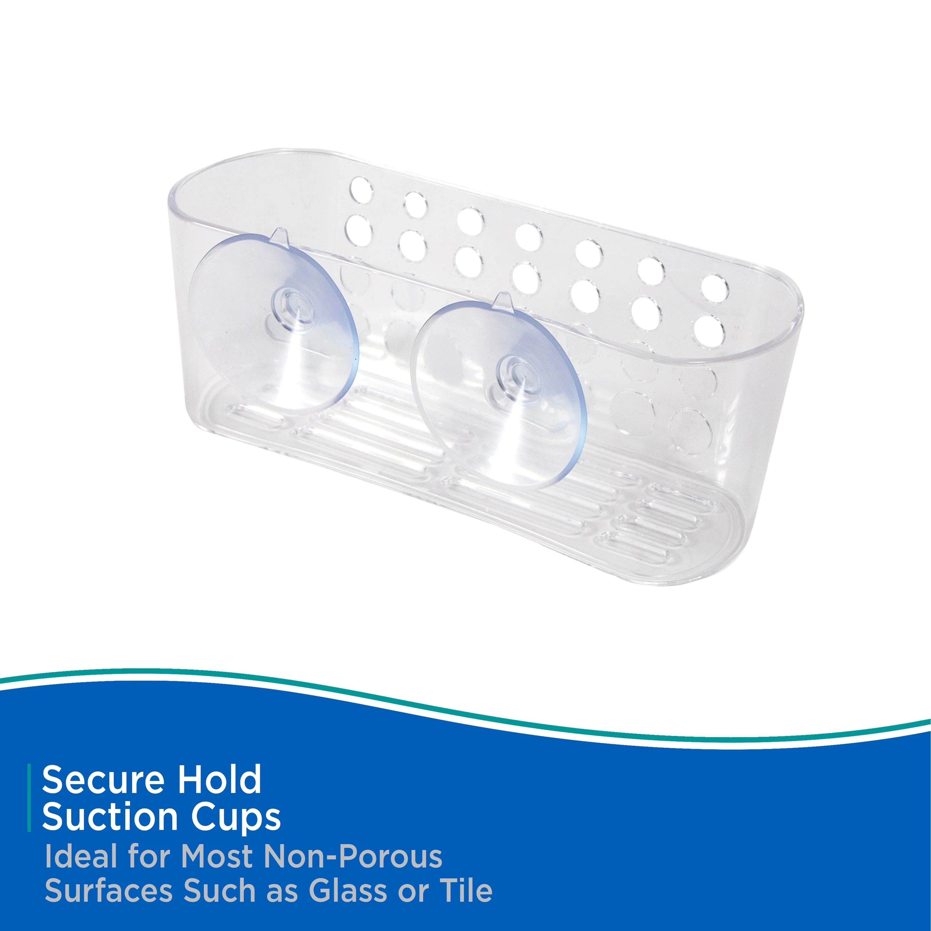 The Kenney Small Suction Cup Basket Caddy gives you a little extra storage where you need it, without the bulkiness of a full-size caddy. Perfect for storing hand soap, bar soap, bath sponges, nail scrub brushes, pumice stones, poufs, leave-in hair oils conditioners, and lotions. Two strong suction cup adhere to any non-porous surface such as tile, glass, fiberglass, and some metals. Constructed of clear durable plastic for years of quality use. To install: clean, moisten and press firmly into place. Care instructions: clean with mild soap and water; do not place in dishwasher. Measures 2.53' L x 6.72' W x 3' H.