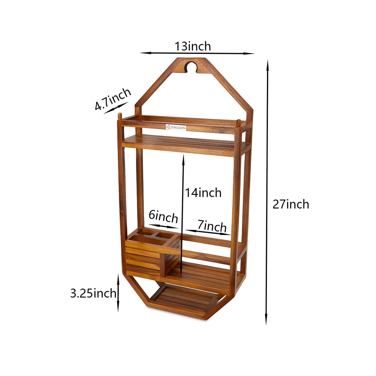 Storage made simple: with this stylish shower and bathtub caddy, all of your necessities will be right there. This particular teak shower organizer has 3 small baskets and 2 hooks. This wood shower caddy also has 2 suction cup that keeps the caddy secure even when the surfaces are wet.Smart design: this organizer has a 3-tier shelf which allows for the storage of products that are of all shapes and sizes. This teak shower caddy for inside a shower will enable you to have all of your showering needs as close to you as possible Also, the 2 hooks are perfect for you to hang washcloths, or loofahsEasy installation: all you have to do is hang the caddy over the shower head and store all of your things. This teak shower caddy can be used with handheld hose-style and rain-style shower heads. There is no hardware or drilling required. You can keep everything secure with the suction cup and the top gripQuality construction: premium grade 100% Indonesian solid teak wood shower caddy. Teak wood which is great for showers, naturally water resistant.Fits most shower heads: the large space at the top is perfect for mounting the caddy. The shower caddy measure 13' x 4.7' x 27' This sturdy premium grade Indonesian solid teak Shower Caddy is a great way to give yourself more bathroom storage. All you have to do is hang it over a shower head and store your showering necessities. This particular teak bathroom caddy has 3 baskets and also comes with extra hooks. The dimensions are 13' x 4.7' x 27. This shower organizer is incredibly sturdy and beautiful. This shower caddy is the perfect size while also still giving plenty of room to store things. Also, this style of wood prevents water buildup. It has been handcrafted so it will last.This Shower organizer resist water naturally and is waterproof. Hang or mount from a shower head. Because of nature of teak wood this shower caddy resist everything naturally. The teak shower caddy freestanding is lightweight but because of it is design it can hold heavy items like ease