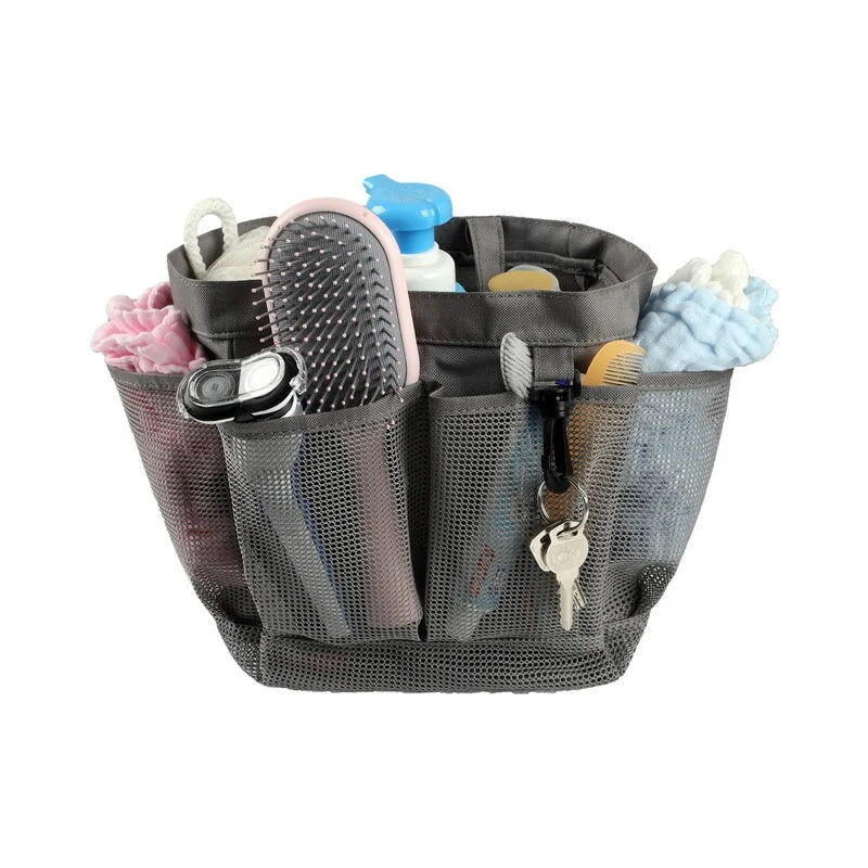 Product contains one mesh portable shower caddy, 1pc clear 3G 71x71 inch PEVA Shower Liner & 12pcs steel shower hooks.STYLISH BAG FOR YOUR ESSENTIALS: Keep your shower essentials organized and handy with this Mesh Portable Shower Caddy. This mesh tote bag is a convenient way to keep your shower essentials organized and within reach. This shower bag features a large compartment and pockets for all your shower needs and has a convenient handle for easy carrying and hanging.QUICK DRYING SHOWER CADDY: With its convenient design, the Mesh Portable Shower Caddy is a suitable storage bag to keep your shower essentials organized and accessible. Made with water-resistant, breathable mesh fabric, this shower caddy is designed to quickly dry after each use. The lightweight design makes it easy to carry and store, while the mesh fabric allows for air circulation to help prevent dirt or mold buildup.WITH MULTIPLE STORAGE SPACES: Make your shower routine easier with this bathroom organizer bag. Featuring one large main storage area and six large pockets, you can easily store all of your shower necessities, including shampoo, conditioner, body wash, and more, in one convenient place. The handle straps make it easy to hang on a shower rod or hook, and the reinforced bottom ensures that your items stay secure.VERSATILE TOTE BAG: Whether you're heading to the gym, beach, or just need a convenient way to store your shower items, the Mesh Portable Shower Caddy is your on-the-go bag. This tote bag is suitable for college dorms, apartments, and any other small space. It's also great for traveling, as it folds up for easy storage and transport, plus a bonus key hook lets you easily hang your bag anywhere!ABOUT US: UTOPIA ALLEY is a woman-owned and operated business. Our goal is to provide our customers with furniture, home decor, essentials, and accessories made with durable products and exceptional craftsmanship. We believe in creating a stylish, comfortable space where you can relax, recharge, and feel inspired. Product Size: Mesh Tote Caddy: 9'x8'. PEVA liner: 3G, 71 x 71'. Shower hook: 1.9'x2.4', 1' space around shower rod.