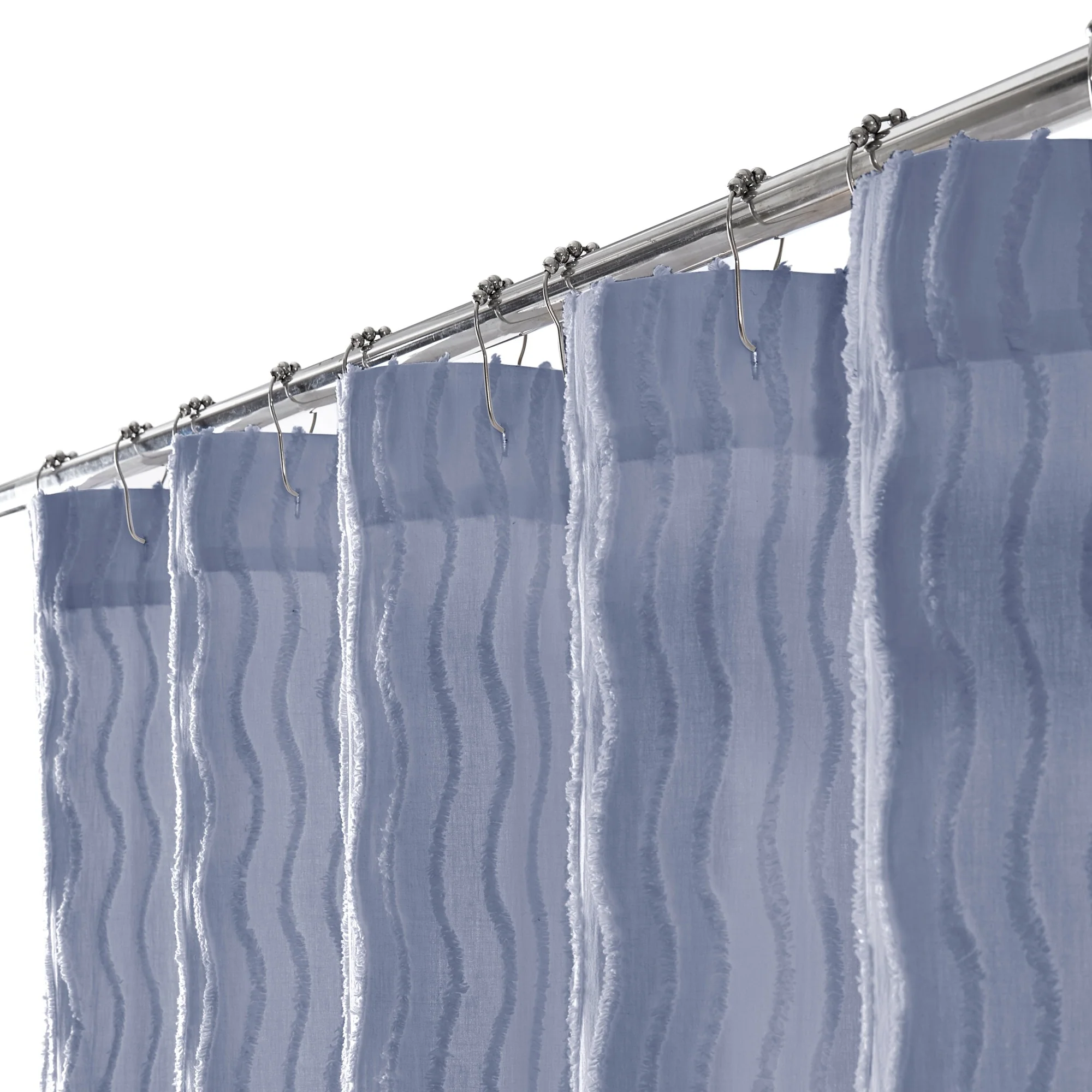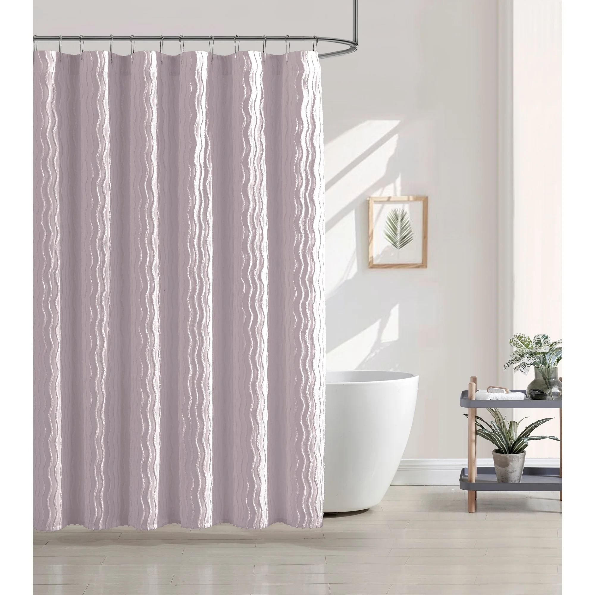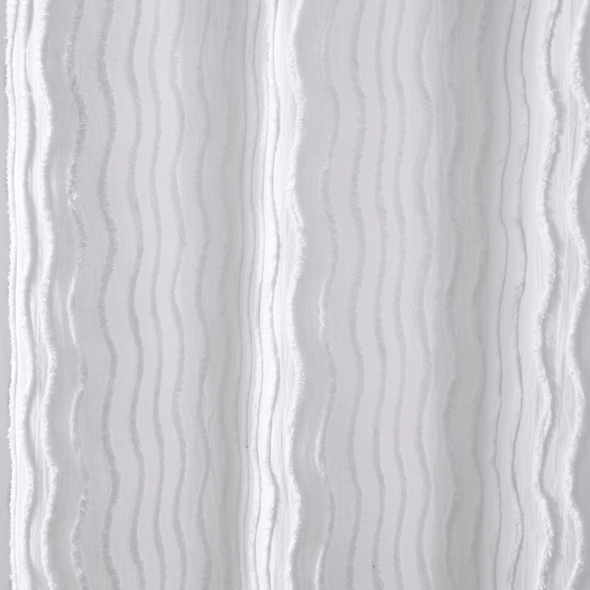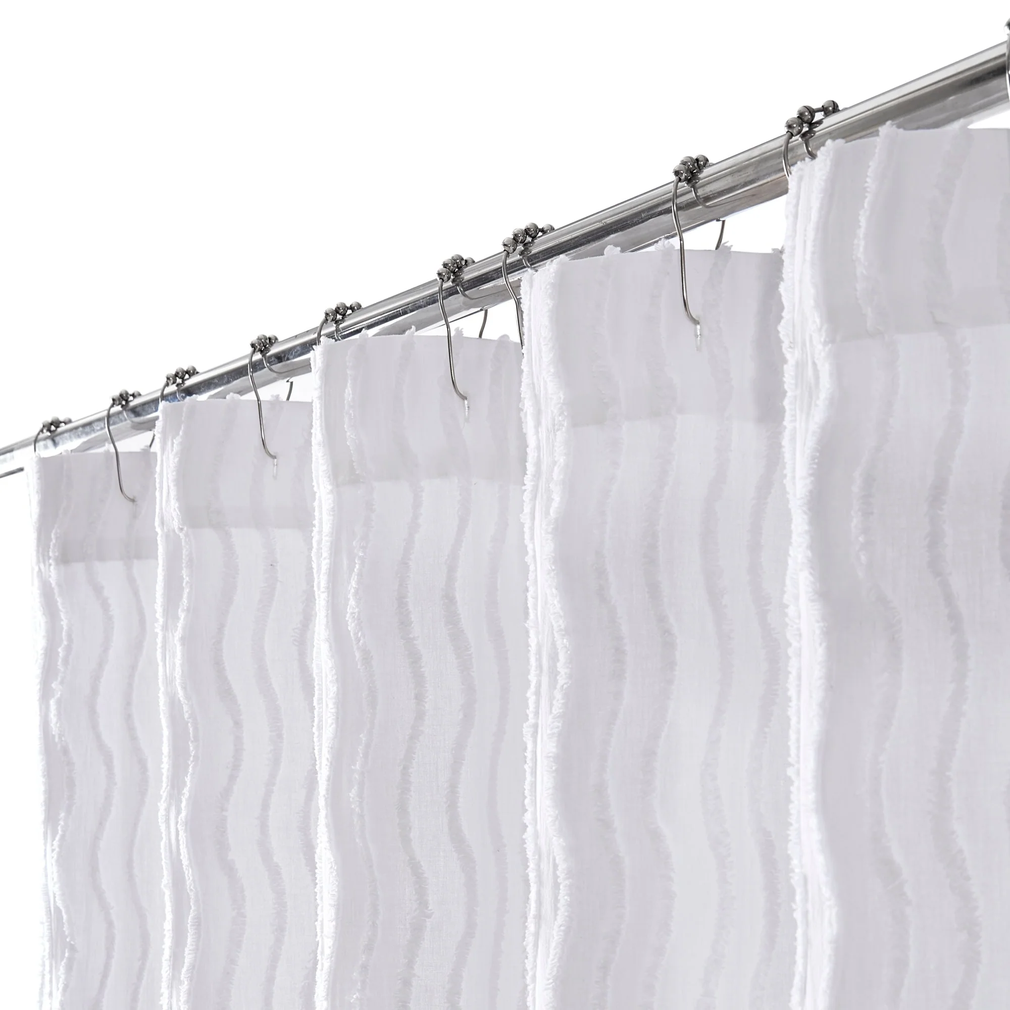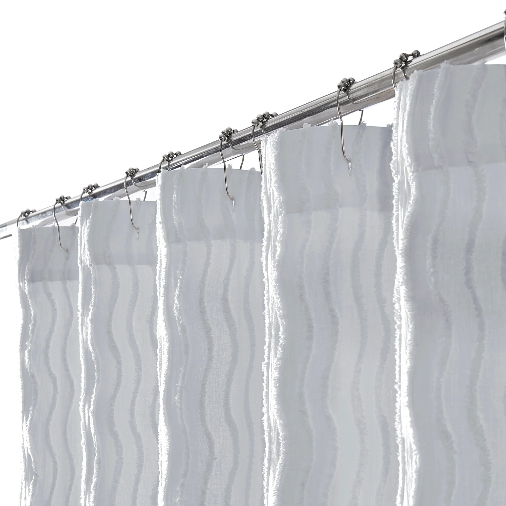 Bring a modern and playful touch to your bathroom decor with the Mabel Textured Solid Shower Curtain from Brielle Home. This white shower curtain features soft decorative tufting in a contemporary wave stripe pattern, adding a whimsical flair to your space. Made from 100% cotton, Mabel is OEKO-TEX Standard 100 certified for chemical-free use. Available in standard and extra-long sizes, shower curtain rings are not included.