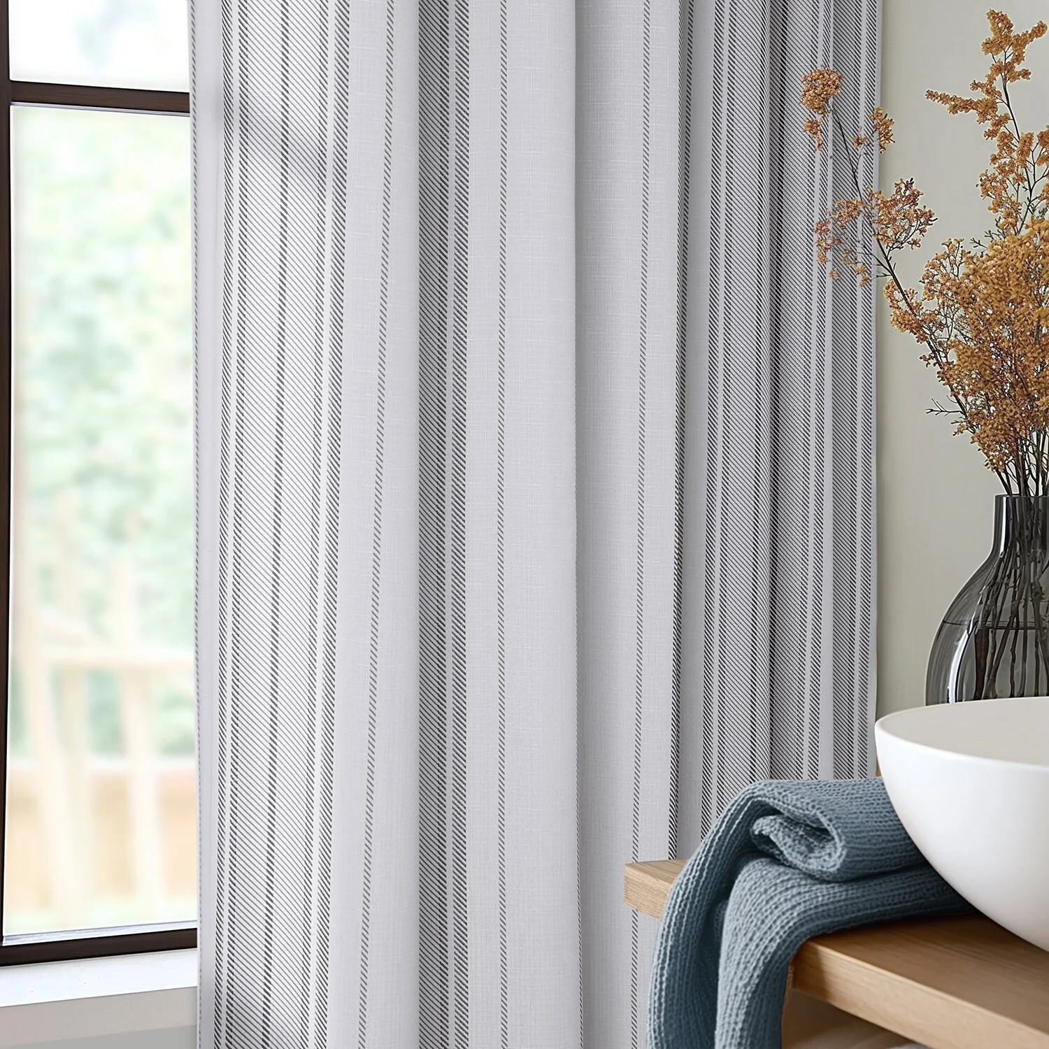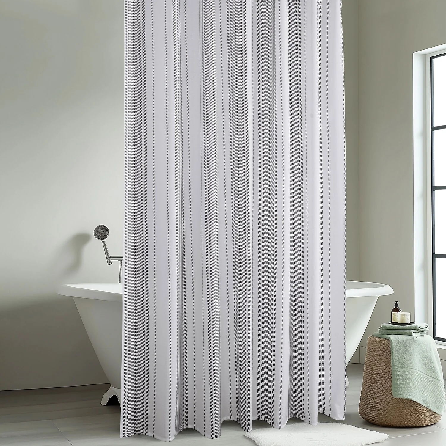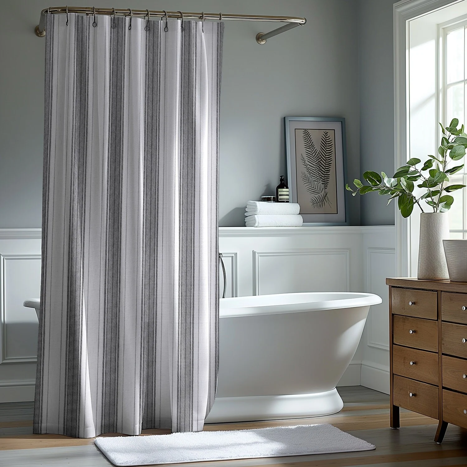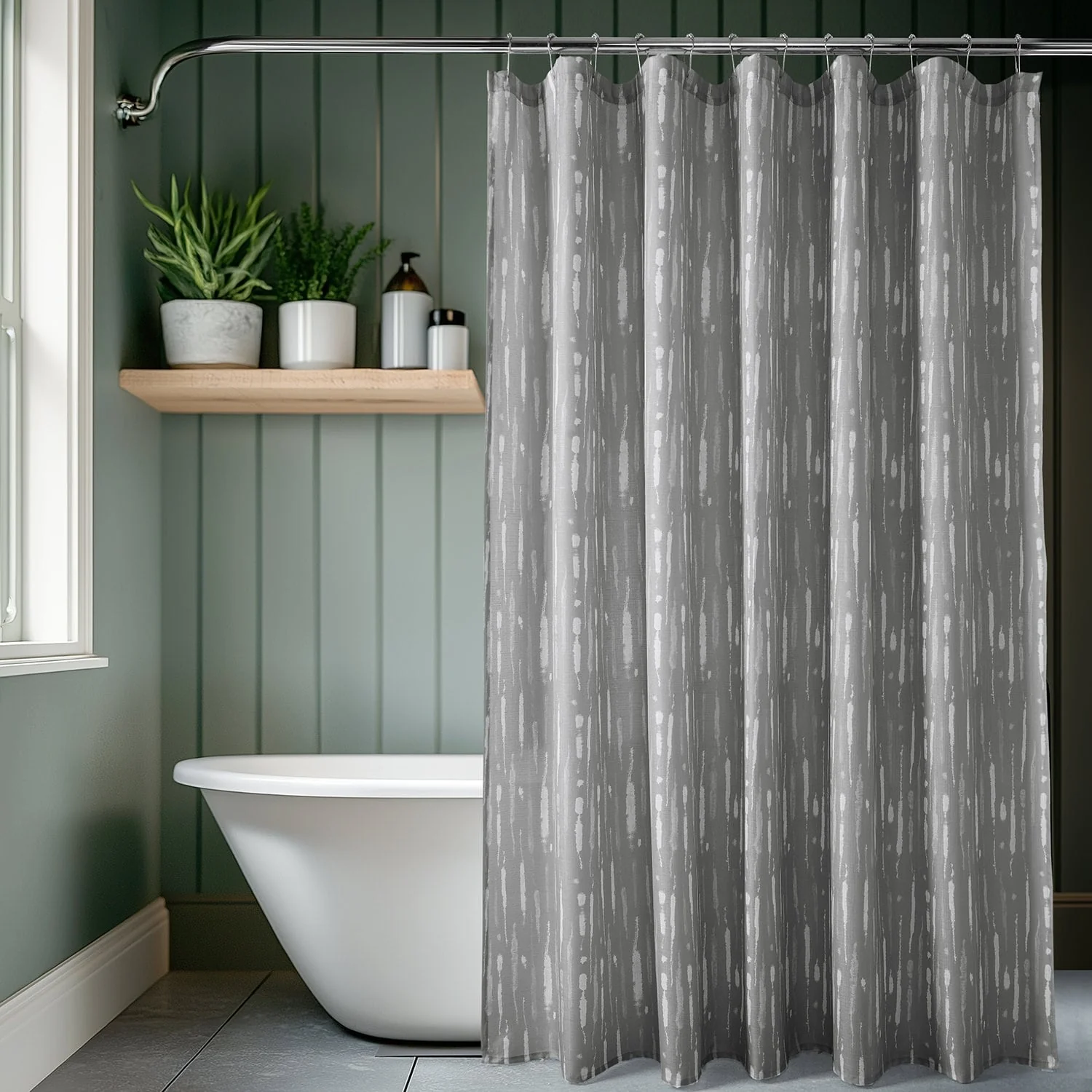 Add a sophisticated touch to your bathroom with these curtains. They are equipped with 12 metal ring grommets at the top for easy hanging and come with 12 metal silver rust less curtain hooks. The textured fabric not only enhances the visual appeal but also provides the durability needed for everyday use. These curtains are machine washable in cold water. Transform your bathroom into a chic and inviting space with this elegantly crafted collection. Care instructions: Machine wash separately in cold water, delicate cycle, do not bleach, tumble dry low.