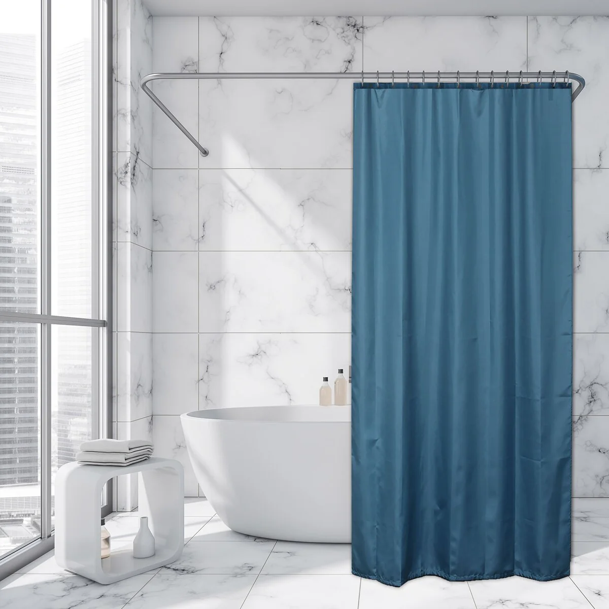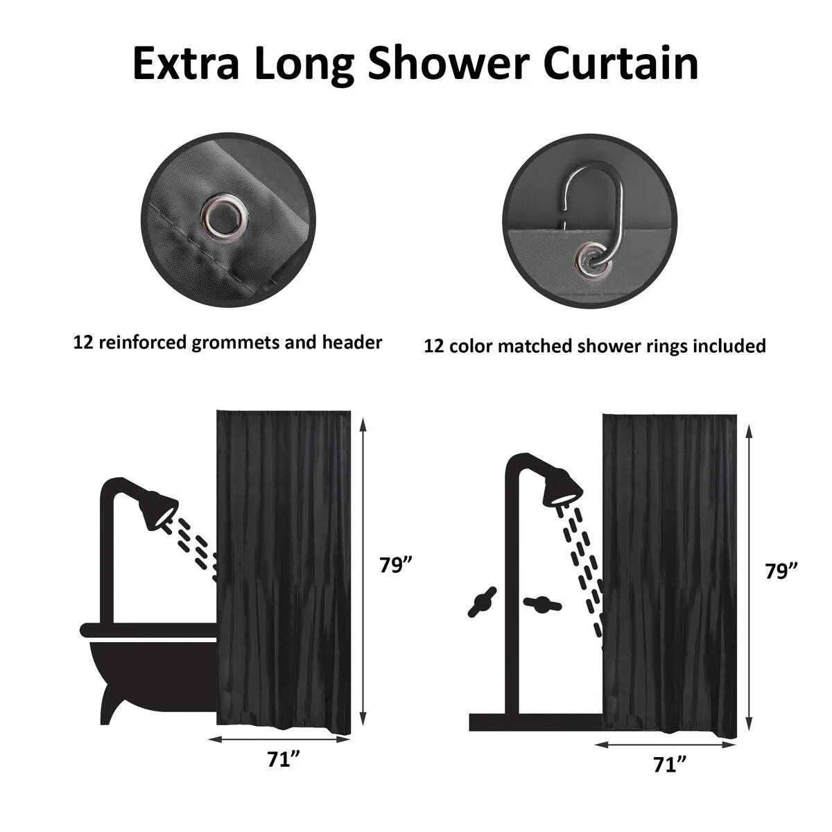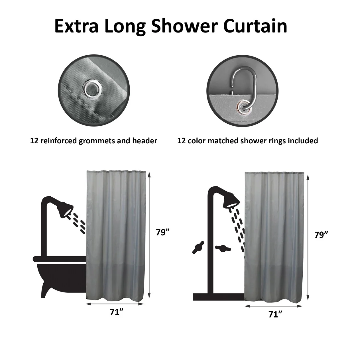 Elevate your shower experience with this Extra Long Shower Curtain. Made of 100% polyester, it is both durable and soft to the touch. With a height of 79 inches and a width of 71 inches, this curtain can fit most shower/tub combinations, making it a convenient addition to your bathroom. The waterproof material keeps water inside the shower and the cold air out, while the included 12 rustproof metal rings make installation a breeze. Choose from a variety of colors to add a personal touch to your space.