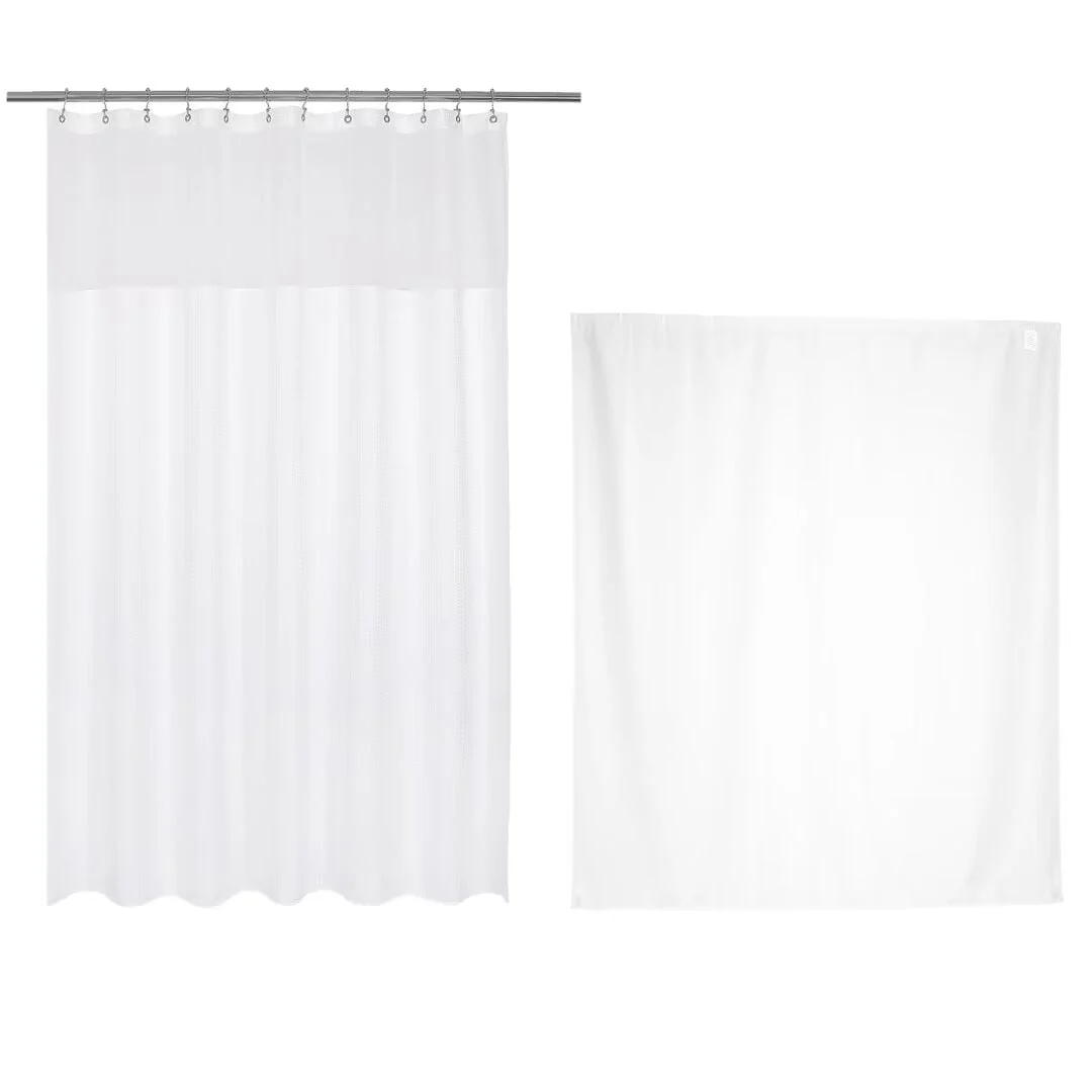 This white polyester fabric snap-in liner is easy to remove on/off for cleaning and replacing. Featuring the waterproof treatment, this liner well protects your outer decorative shower curtain and extends its life. 2 weighted bottom corner magnets help the shower curtain liner in place.The size 70x54 fits the standard size 71x74(no hooks needed) and 71x72(hooked) shower curtains with window. The size 70x66 fits the standard size 71x86(no hooks needed) and 71x84(hooked) shower curtains with window.