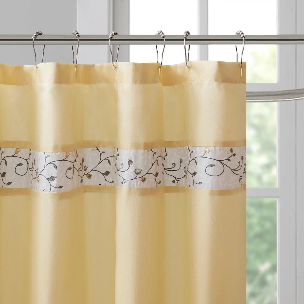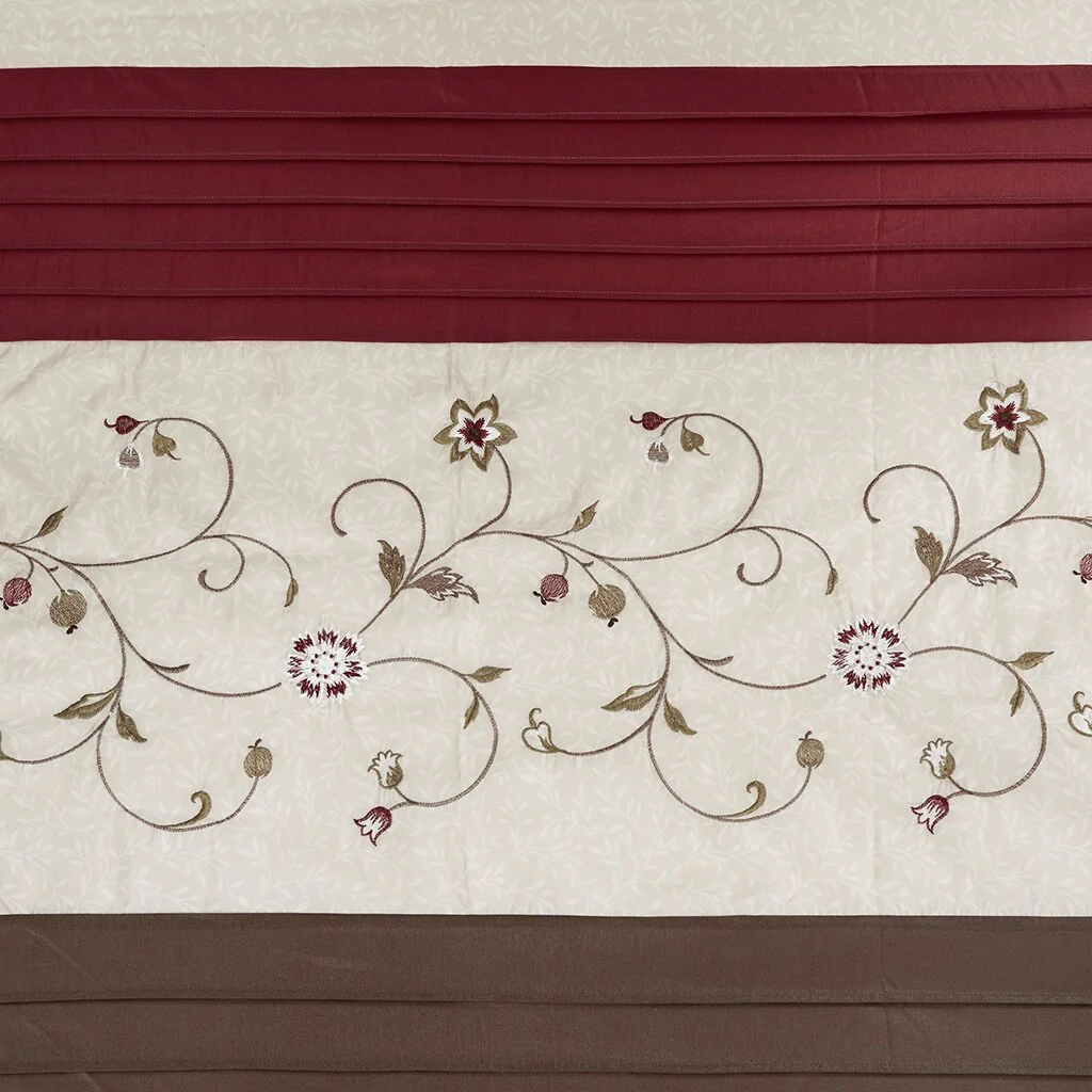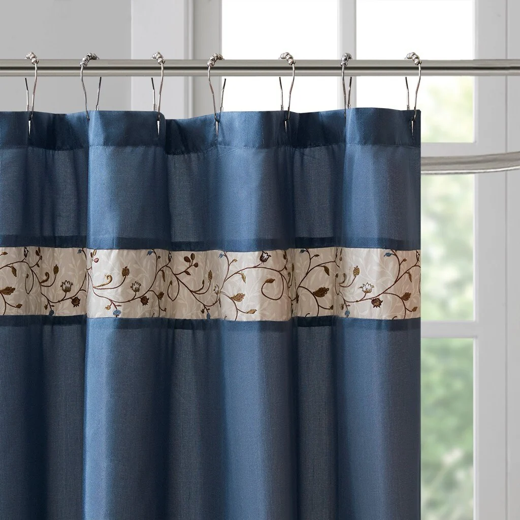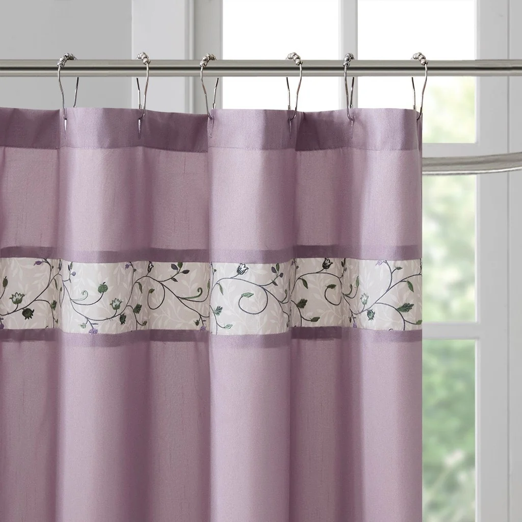 Add an elegant addition to your bathroom with the Madison Park Serene shower curtain. Its rich red and delicate embroidery are the perfect combination. This shower curtain is machine washable for easy care. Various sizes are available to fit any bathroom space.Complete the look with coordinating bedding available and sold separately.