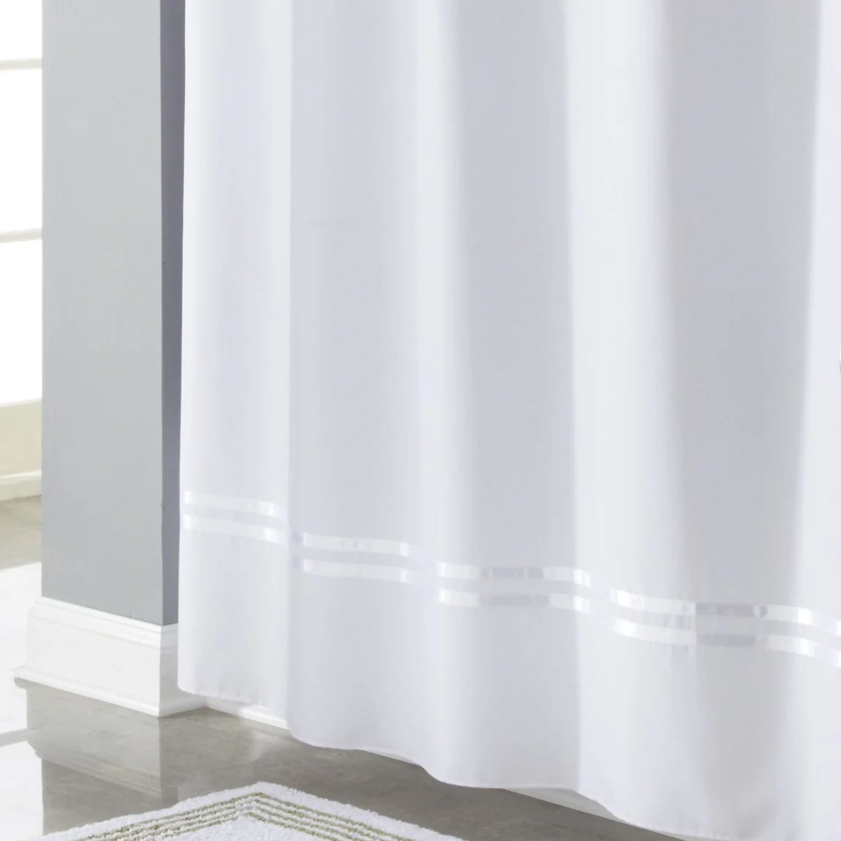 The innovative Hookless Escape Shower Curtain is designed to bring a spa-like ambiance effortlessly. The bathroom curtain set includes the fabric shower curtain, built-in rings, fabric liner, and a sheer window, providing a complete solution for your bathroom. This shower curtain set offers a 3-in-1 value, transforming your bathroom decor in seconds without the hassle of hooks. With no need to remove the rod, the shower curtain slides right on with its FLEX-ON built-in rings that won't rust. The It’s A Snap! shower liner, is made of polyester fabric, and snaps on and off easily for quick replacements and water repellence. Our shower curtain features a sheer window for natural light, maintaining privacy while reducing humidity and moisture. Our OEKO-TEX certified Hookless shower curtains, are crafted with safety in mind. Maintenance of these bath curtains is also a breeze; simply shake off excess water after each use and hang the curtain to air dry. For cleaning, machine wash the curtain and liner on a gentle cycle and replace the liner as needed. After each use shake off the water let the curtain hang freely outside the tub and allow it to air dry.