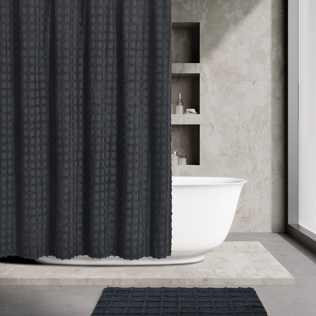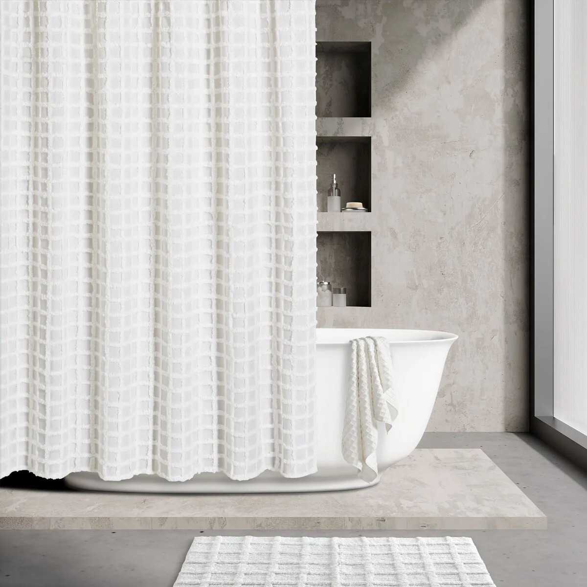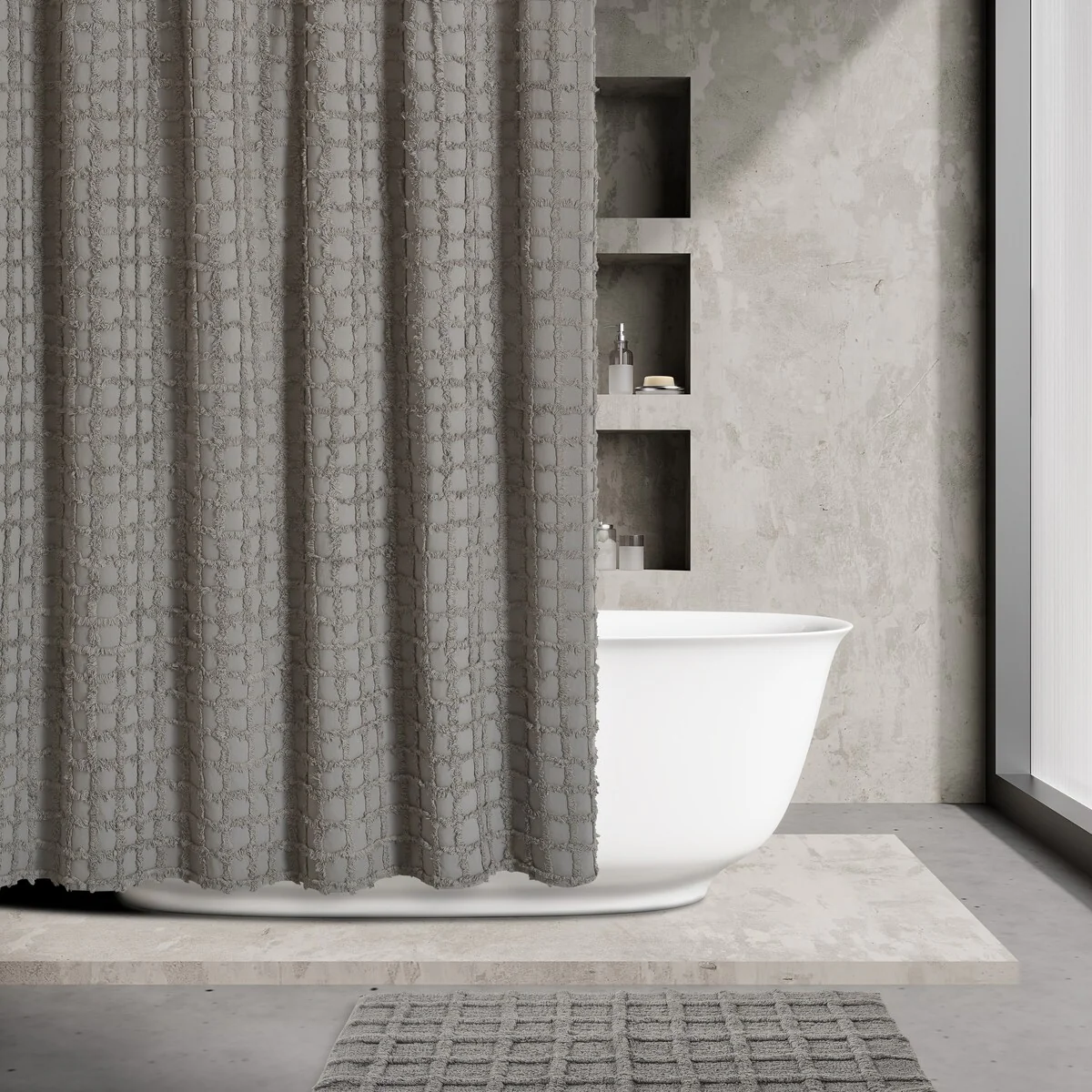 Add a tasteful touch of modern simplicity to your bathroom decor with the Cameron Shower Curtain 100% Cotton shower curtain. The sophisticated tufted tonal shower curtain is available in multiple color options and offers lovely texture and surface interest to your bathroom. This standard size 72'x72' shower is durable and machine washable, making it easy to clean. Shower liner is recommended. Pair this curtain with the bath rug to complete the modern look (each sold separately).