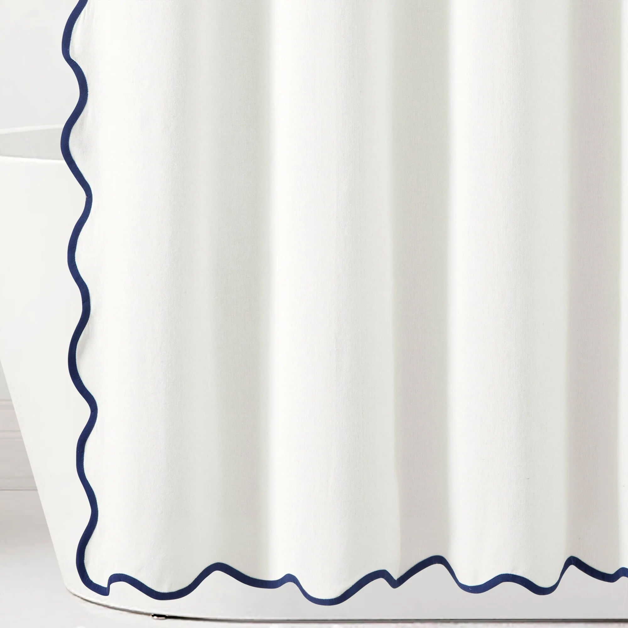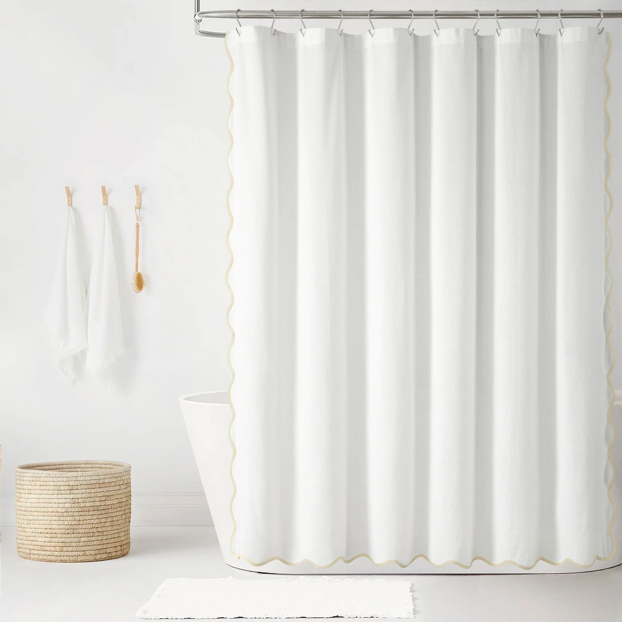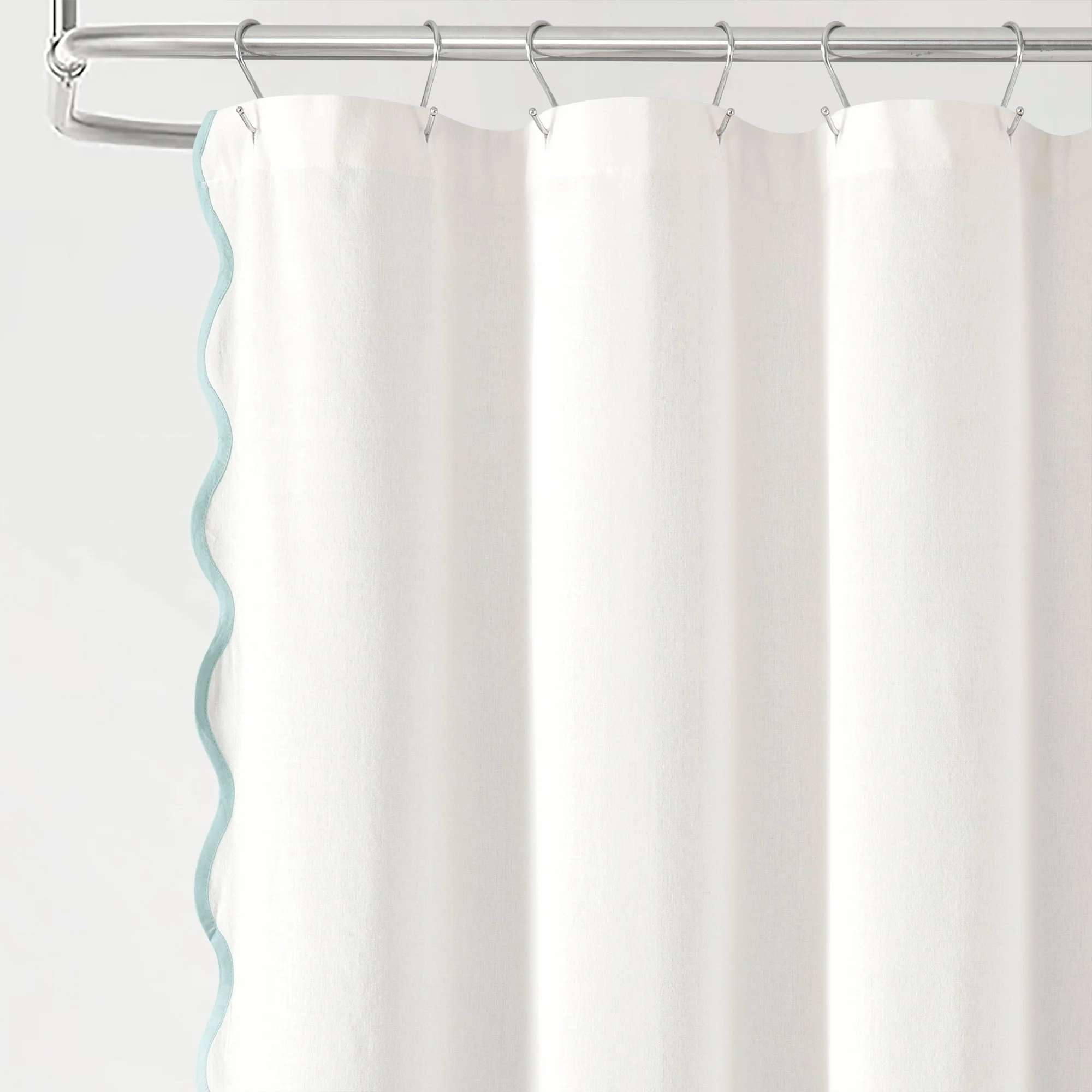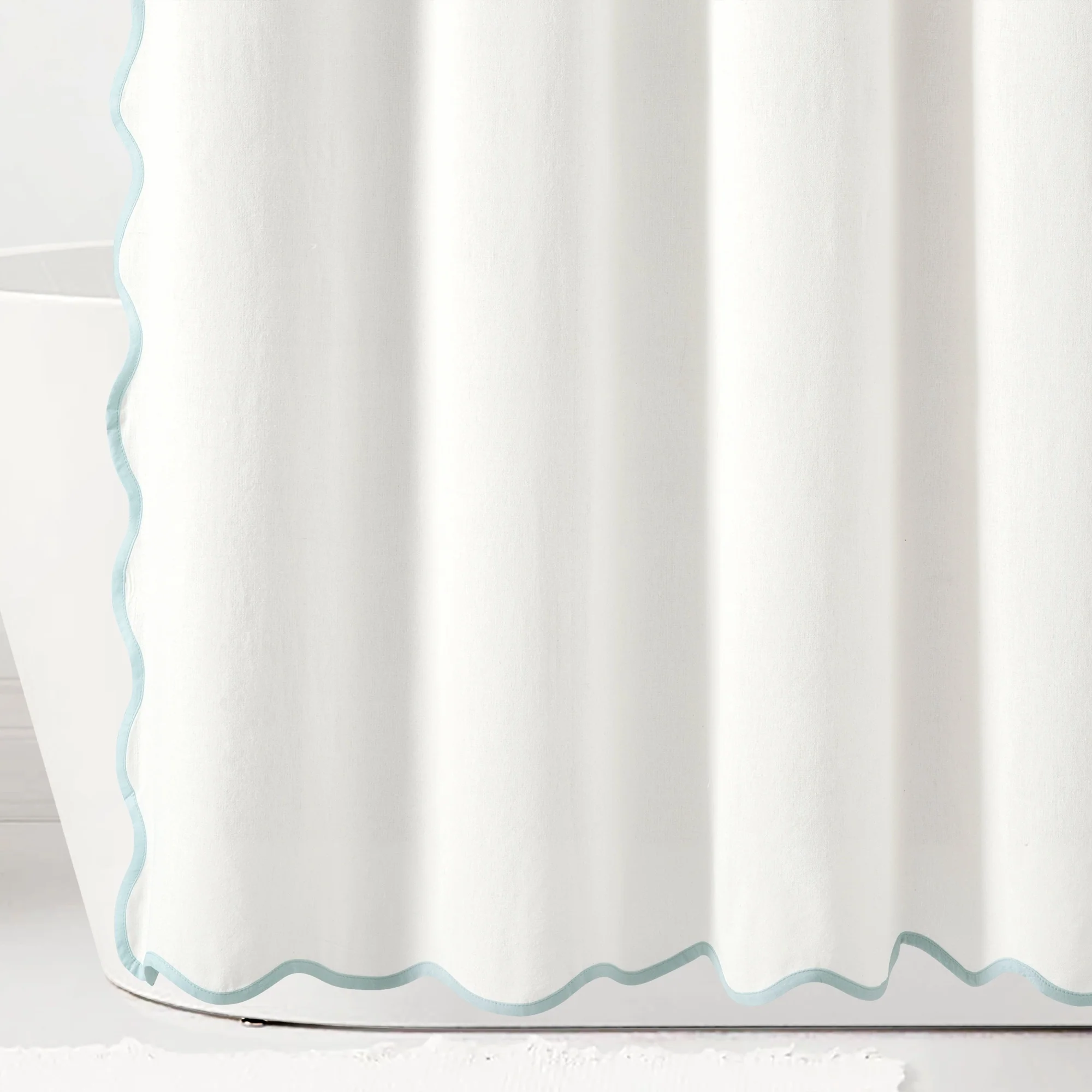 - Chic Decor: Bring a blend of seaside charm and style to your space with this Coastal Chic Scallop Edge Shower Curtain. The scalloped edge design is reminiscent of rolling waves along the shoreline, infusing your bathroom with a tranquil coastal ambiance.