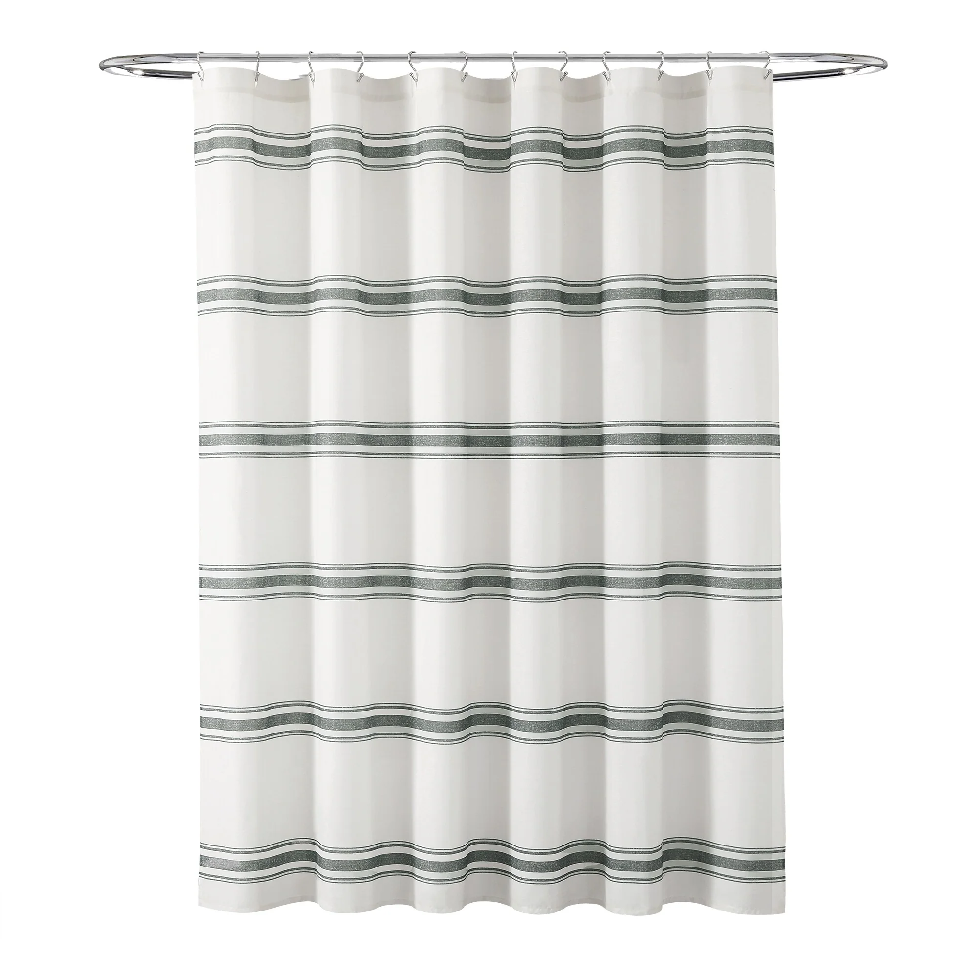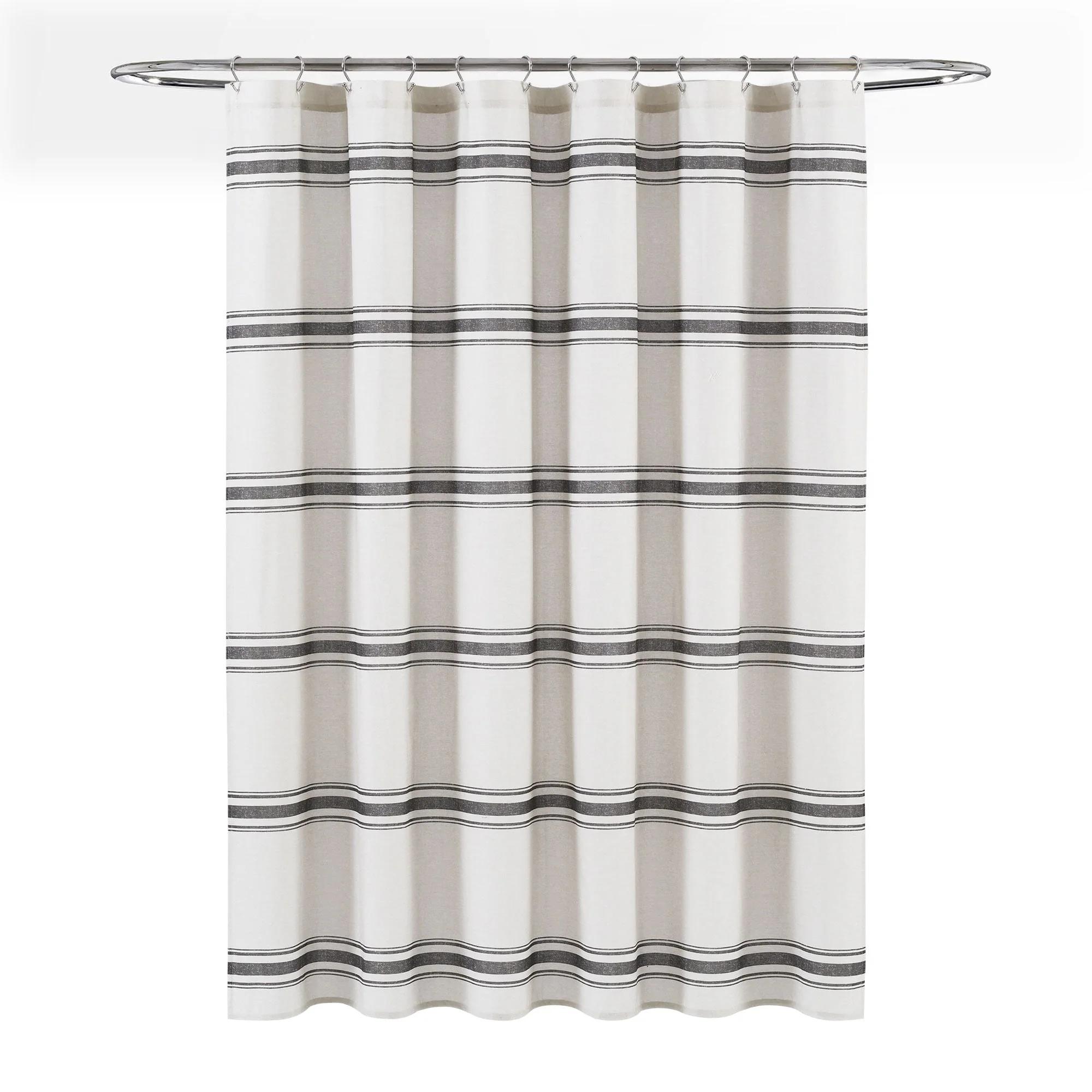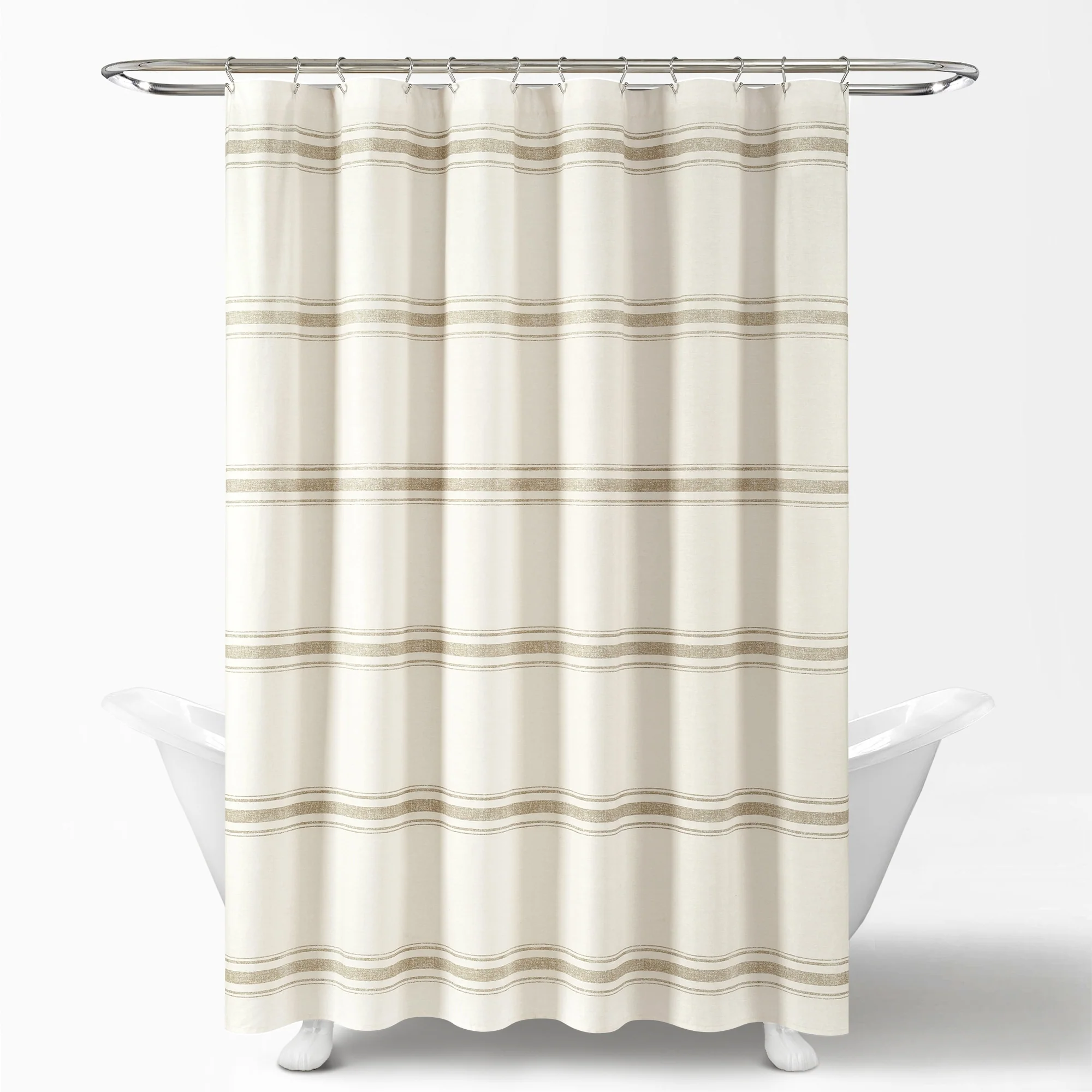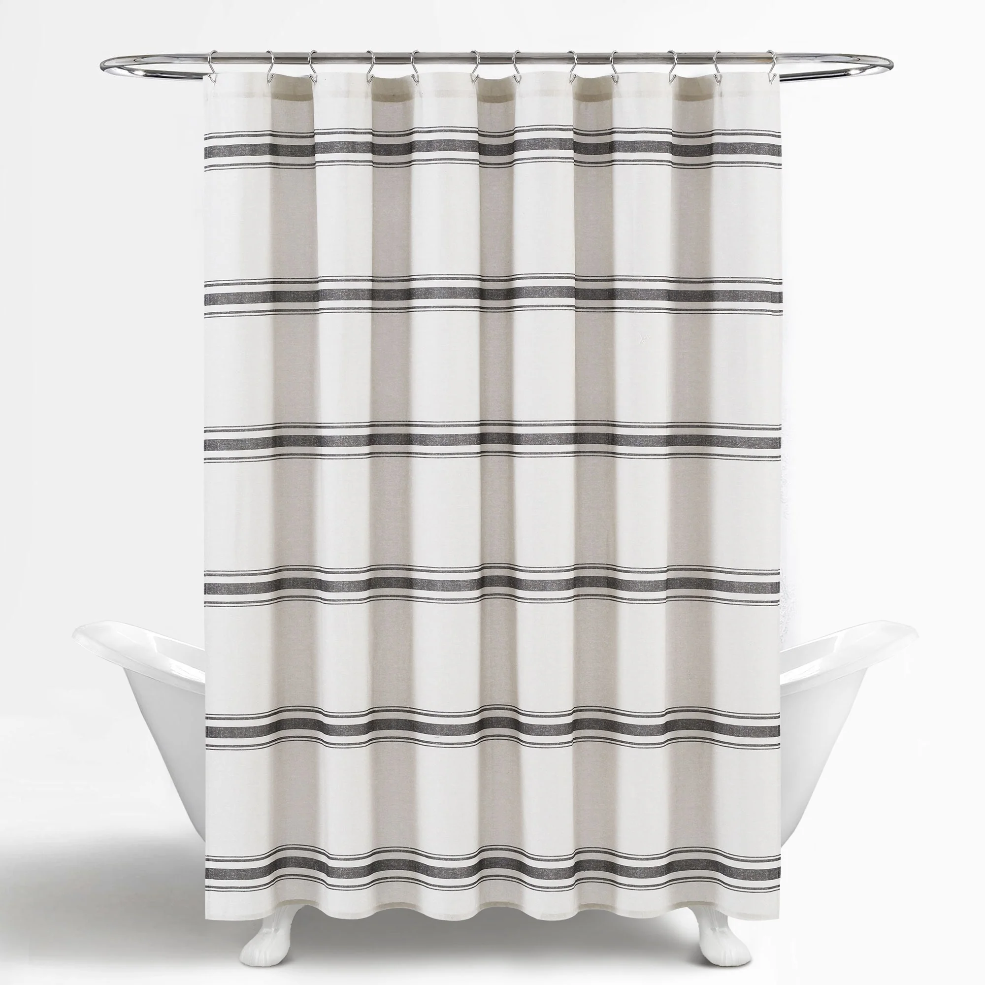 This shower curtain is OEKO-TEX Standard 100 certified, which means the fabric, dyes and all components have been tested in an independent laboratory and certified against a list of more than 350 harmful substances. This farmhouse style shower curtain is ideal for your master bathroom or guest bathroom. The printed stripes look great against a beige background. Either of our color options will surely enhance any bathroom. This striped cotton shower curtain will add style without overwhelming the space. Its simple yet fabulous design will create a fresh and beautiful look for your bathroom makeover. Measuring 72 inches long and 72 inches wide, the size and the modern farmhouse look of this shower curtain will fit nearly any bath. It hangs easily with any standard shower curtain hooks or rings, which are sold separately. This shower curtain is safe to machine wash. Please refer to the product label for full care instructions.