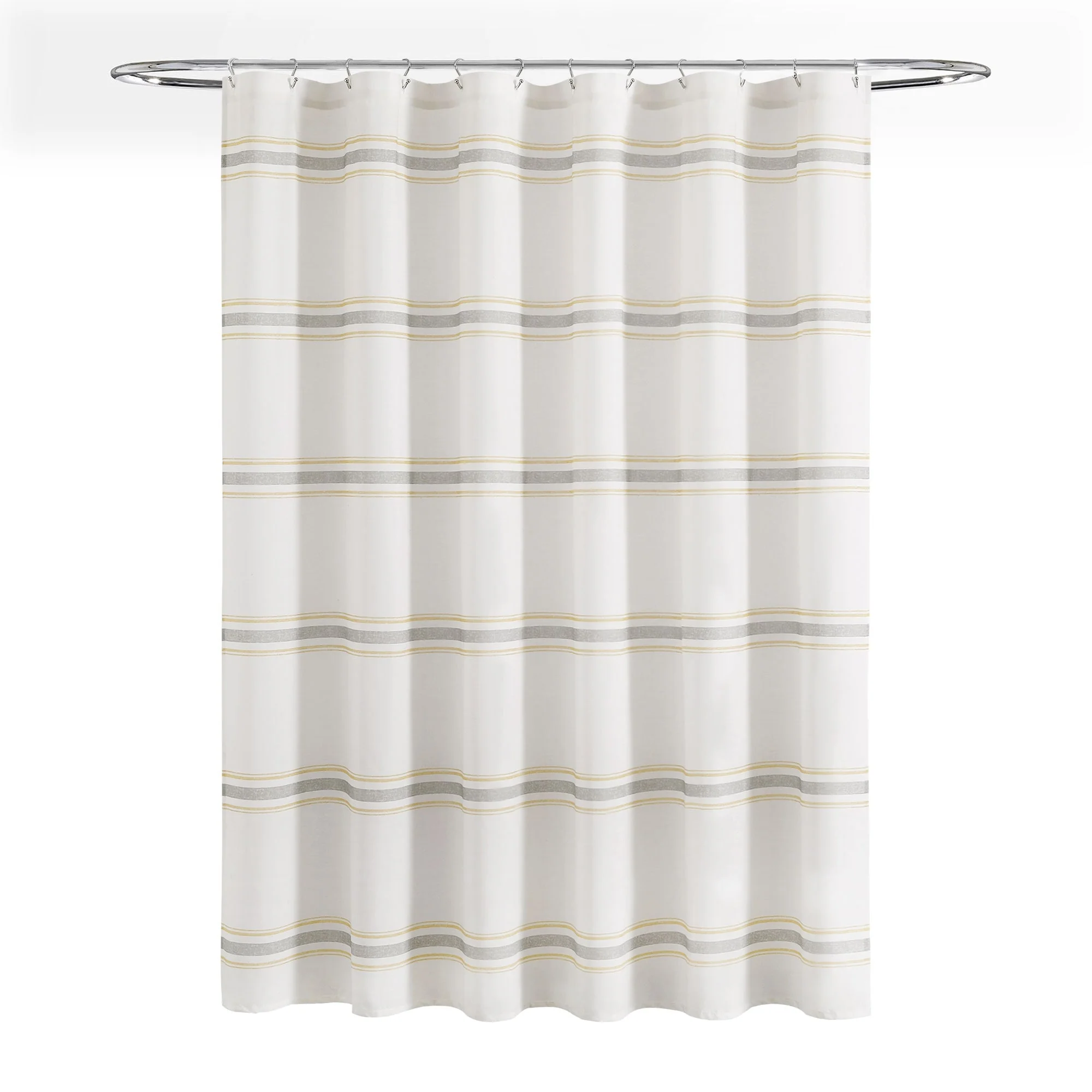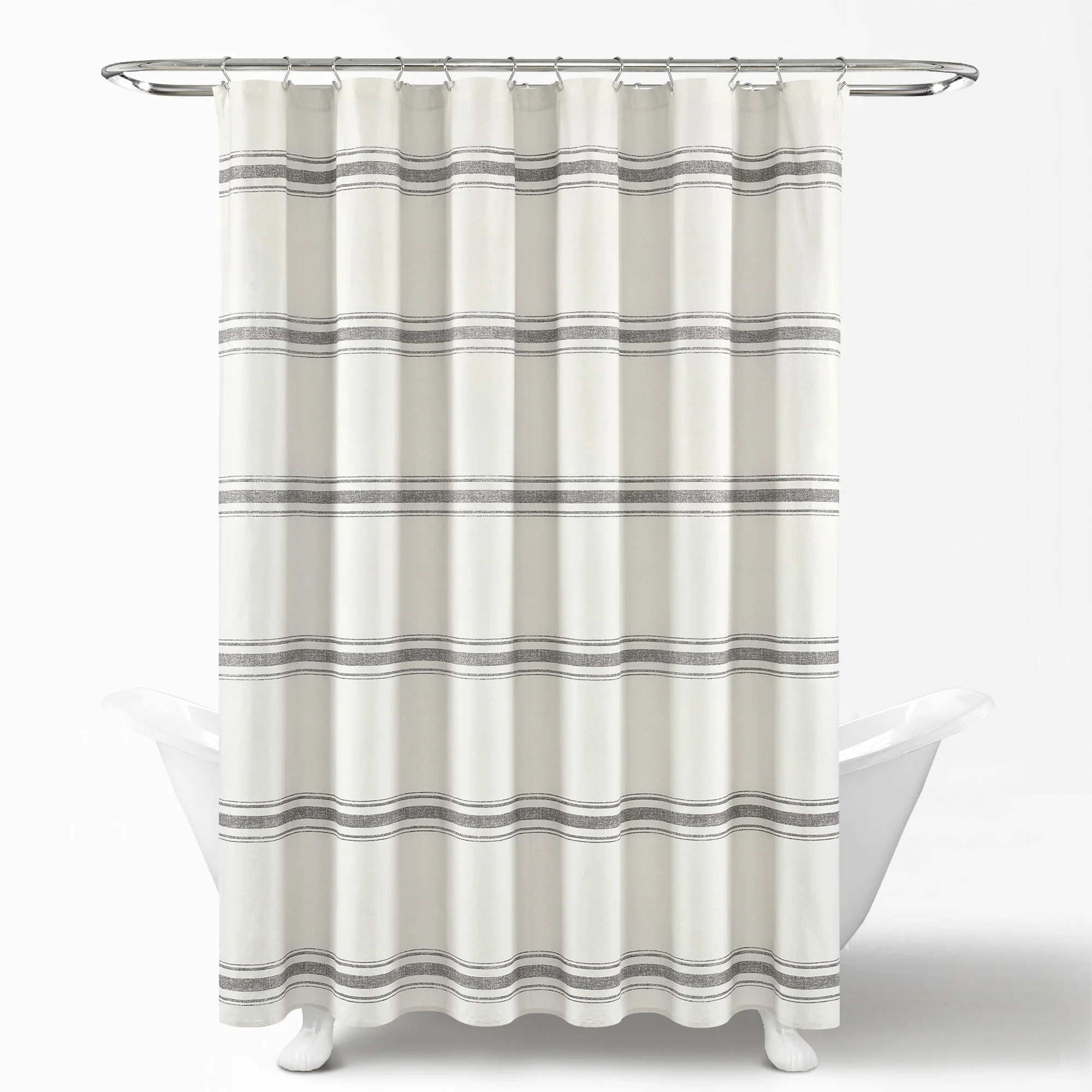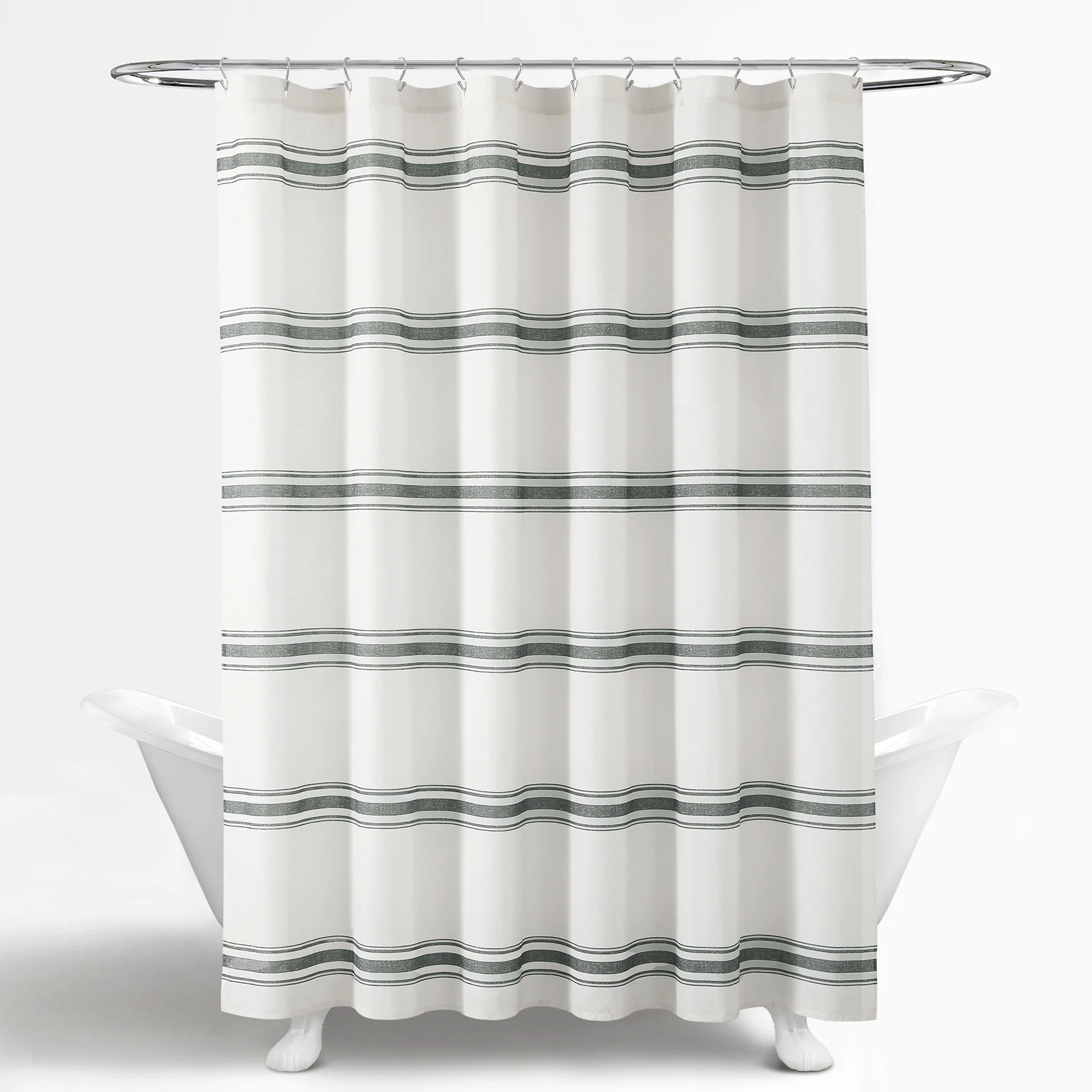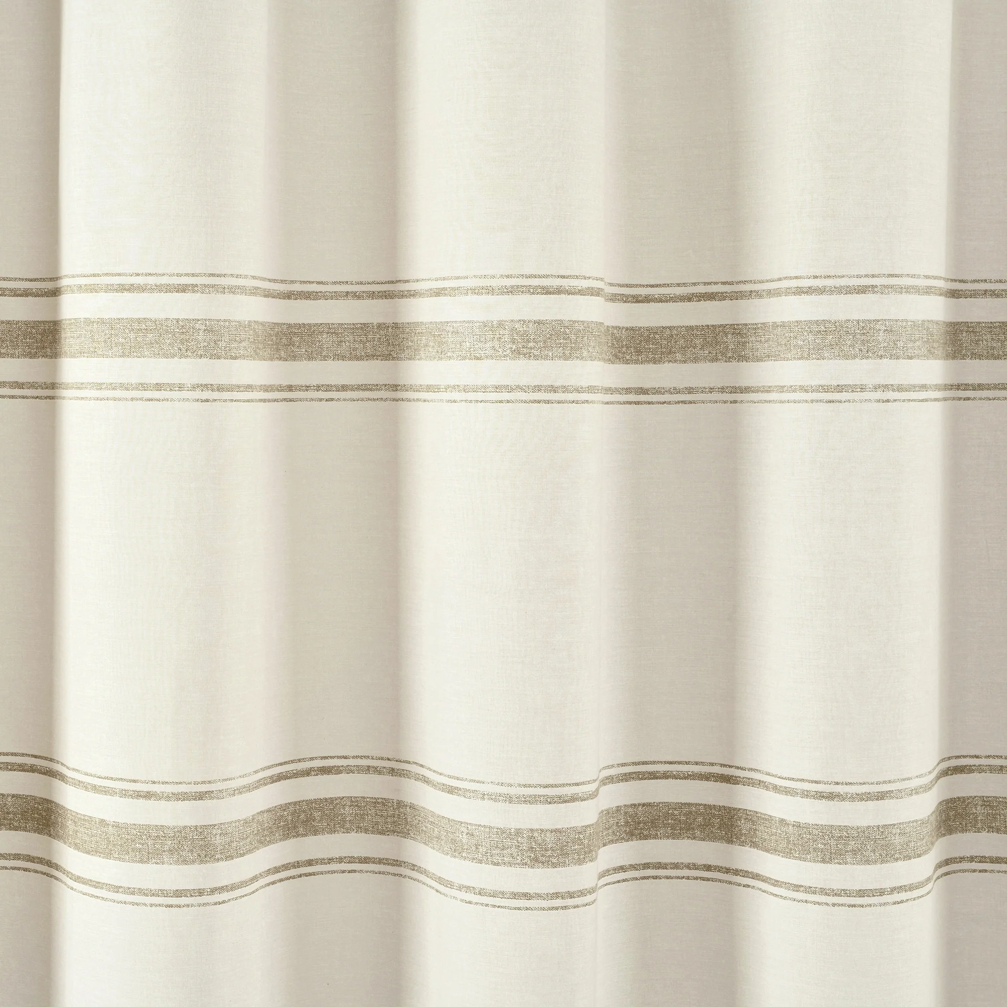 This shower curtain is OEKO-TEX Standard 100 certified, which means the fabric, dyes and all components have been tested in an independent laboratory and certified against a list of more than 350 harmful substances. This farmhouse style shower curtain is ideal for your master bathroom or guest bathroom. The printed stripes look great against a beige background. Either of our color options will surely enhance any bathroom. This striped cotton shower curtain will add style without overwhelming the space. Its simple yet fabulous design will create a fresh and beautiful look for your bathroom makeover. Measuring 72 inches long and 72 inches wide, the size and the modern farmhouse look of this shower curtain will fit nearly any bath. It hangs easily with any standard shower curtain hooks or rings, which are sold separately. This shower curtain is safe to machine wash. Please refer to the product label for full care instructions.