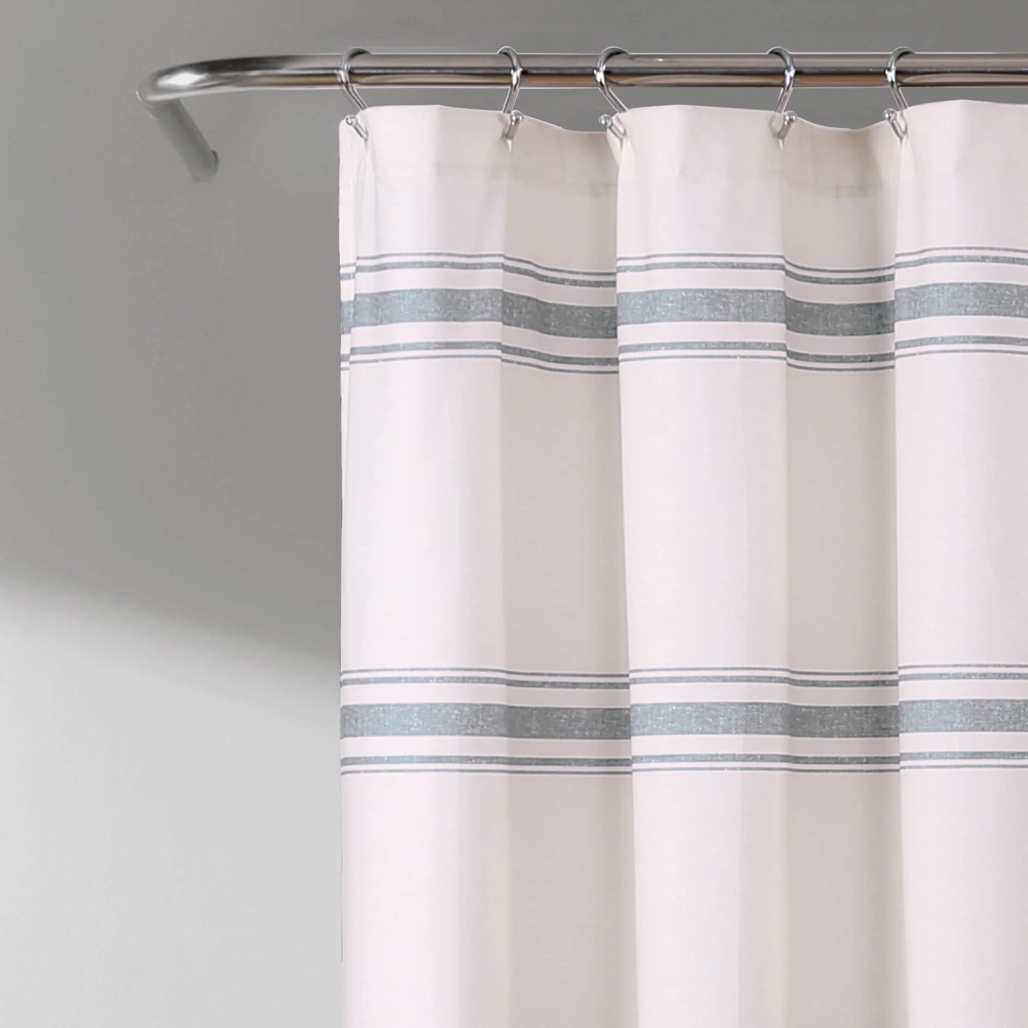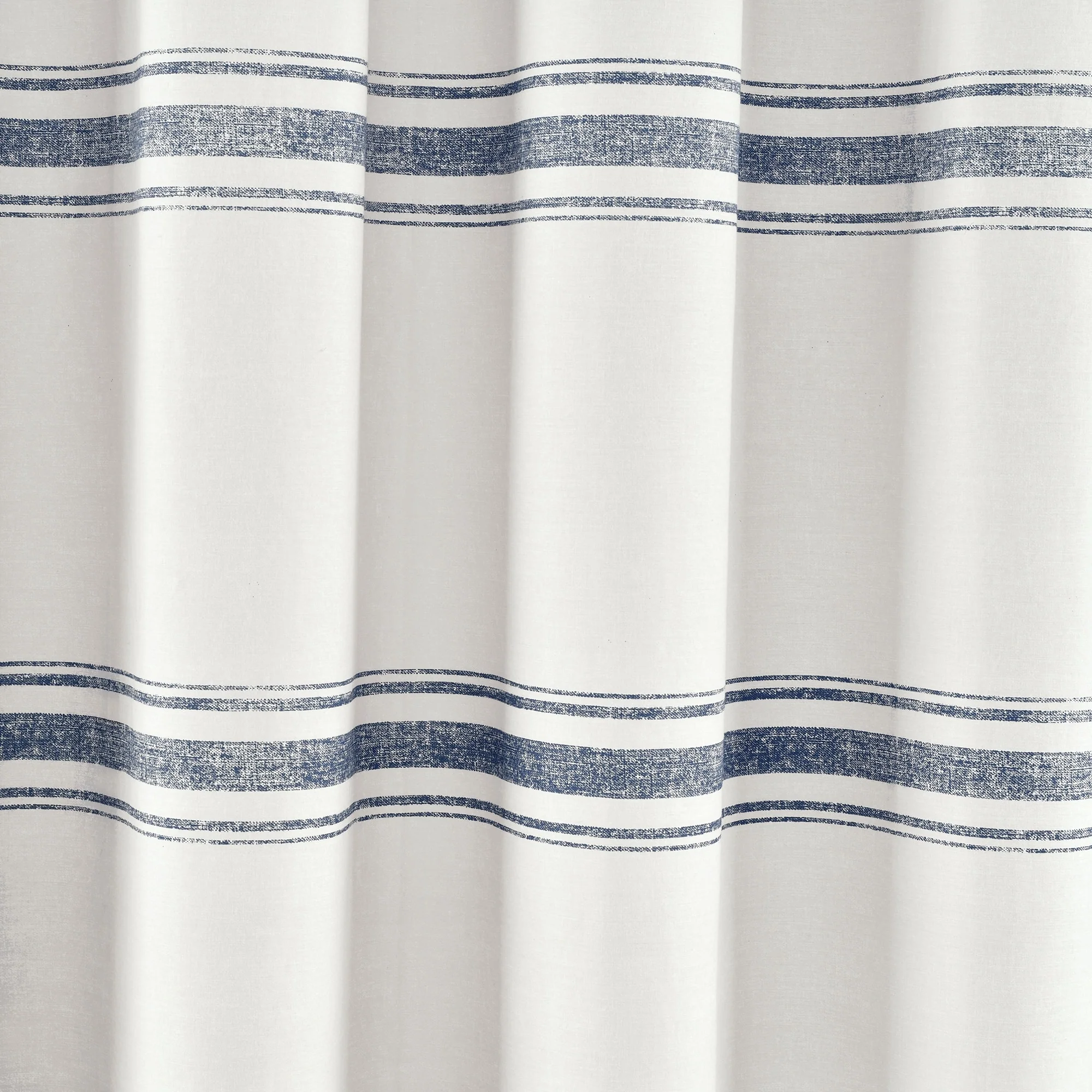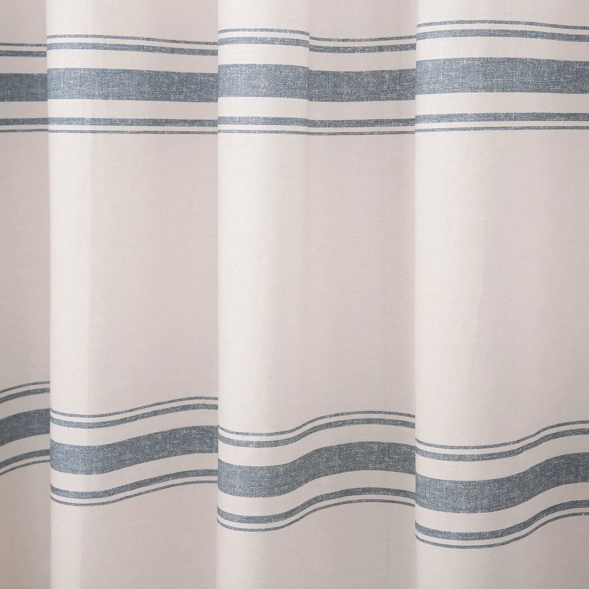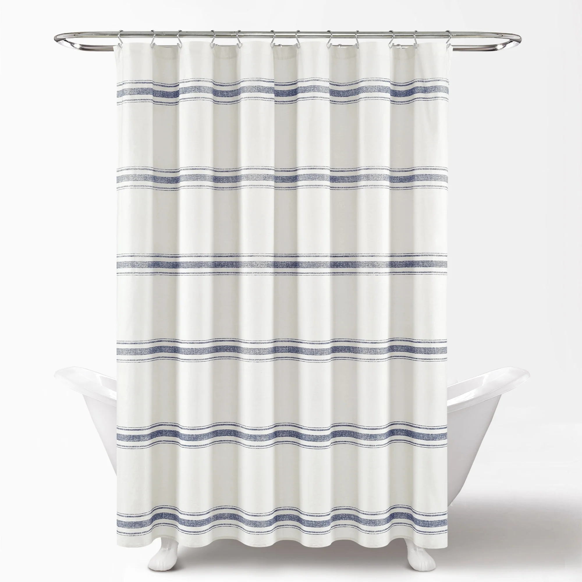 Introduce a farmhouse theme into your bathroom by hanging this chic shower curtain. A series of small holes along the curtain's upper edge allows you to attach your existing rings. Horizontal blue lines adorn the front of the curtain, creating a simple pattern that helps add a calming mood to the room.