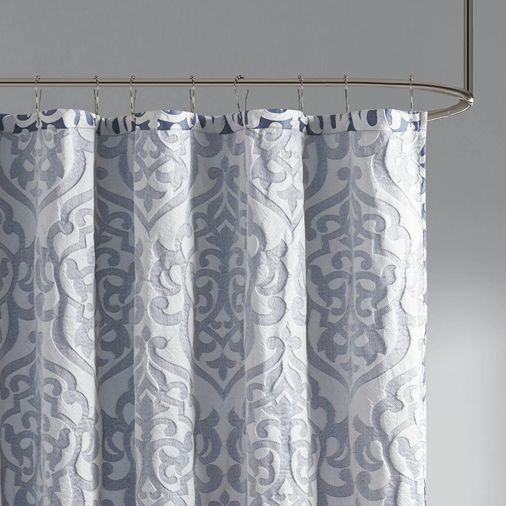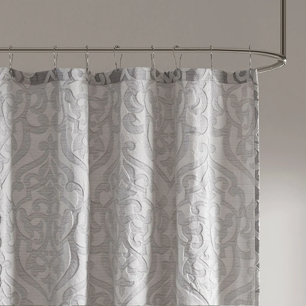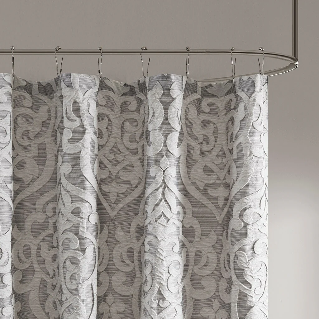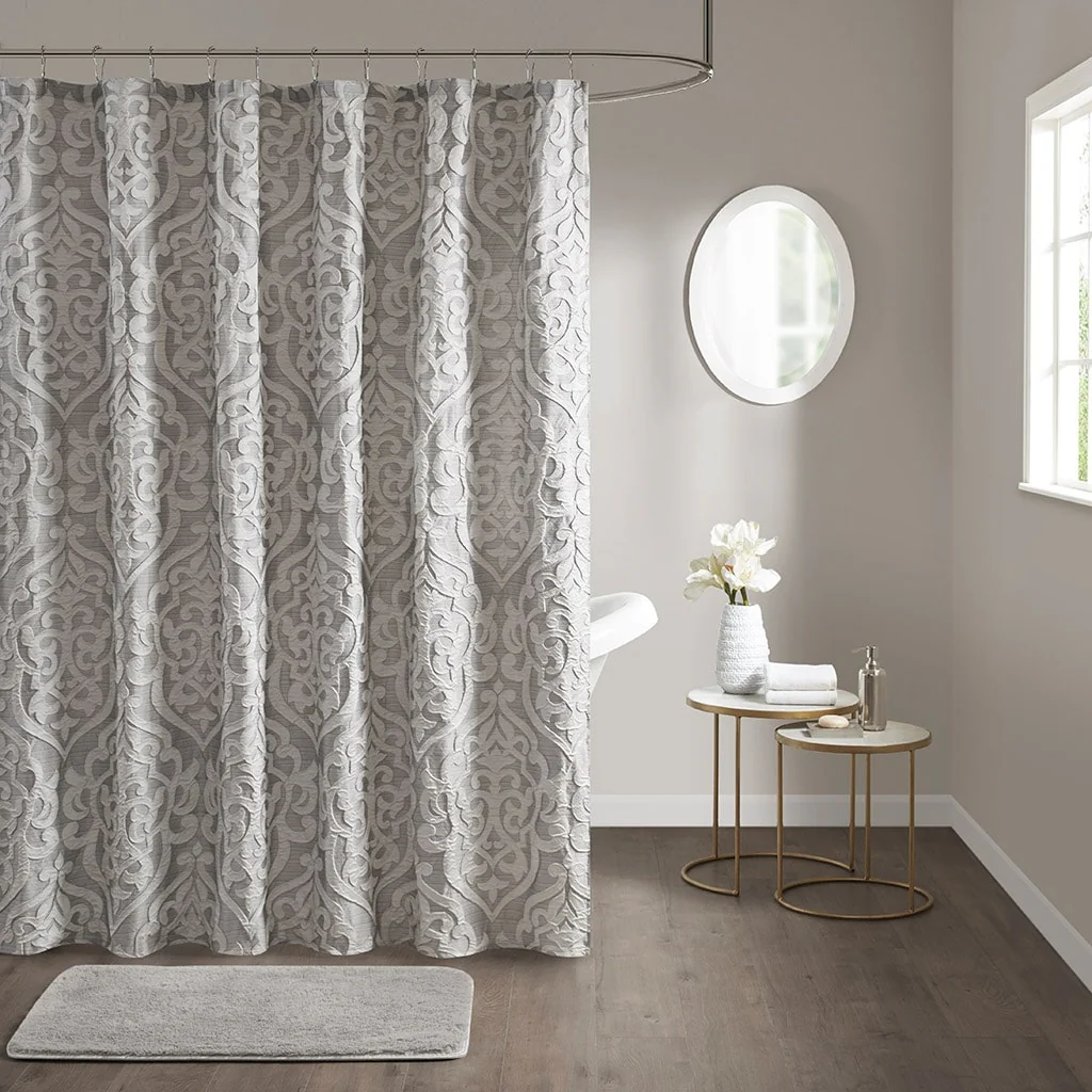 Add a touch of class to your bathroom with our Madison Park Odette Jacquard Shower Curtain. This luxurious textured shower curtain flaunts a gorgeous silver damask medallion design on a stria grey jacquard ground that adds rich texture and dimension to the lavish look. Measuring 72x72', each shower curtain is finished with 12 button holes on top making it easy to assemble hooks and hang onto rod (hooks and rod not included). To better preserve this beautiful shower curtain, a water repellant liner is highly recommended and can be purchased separately (liner not included). Machine washable for easy care; complete the collection with coordinate matching bedding, alas available and sold separately.