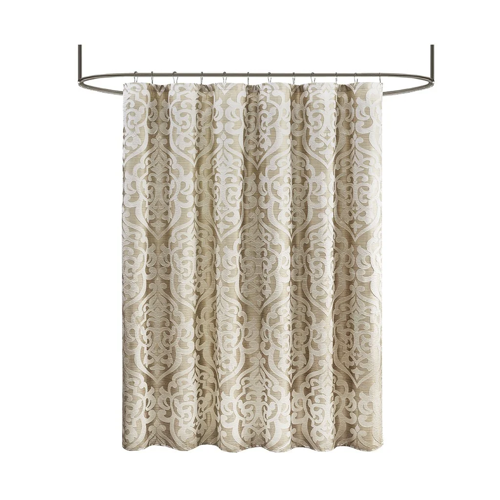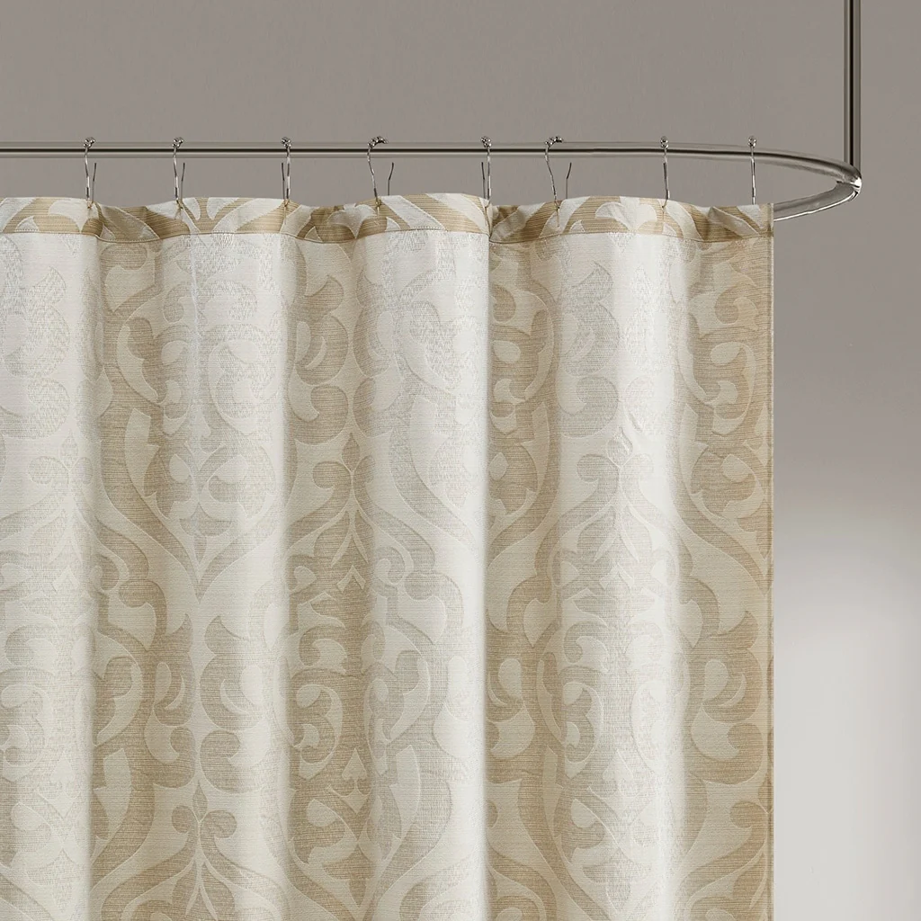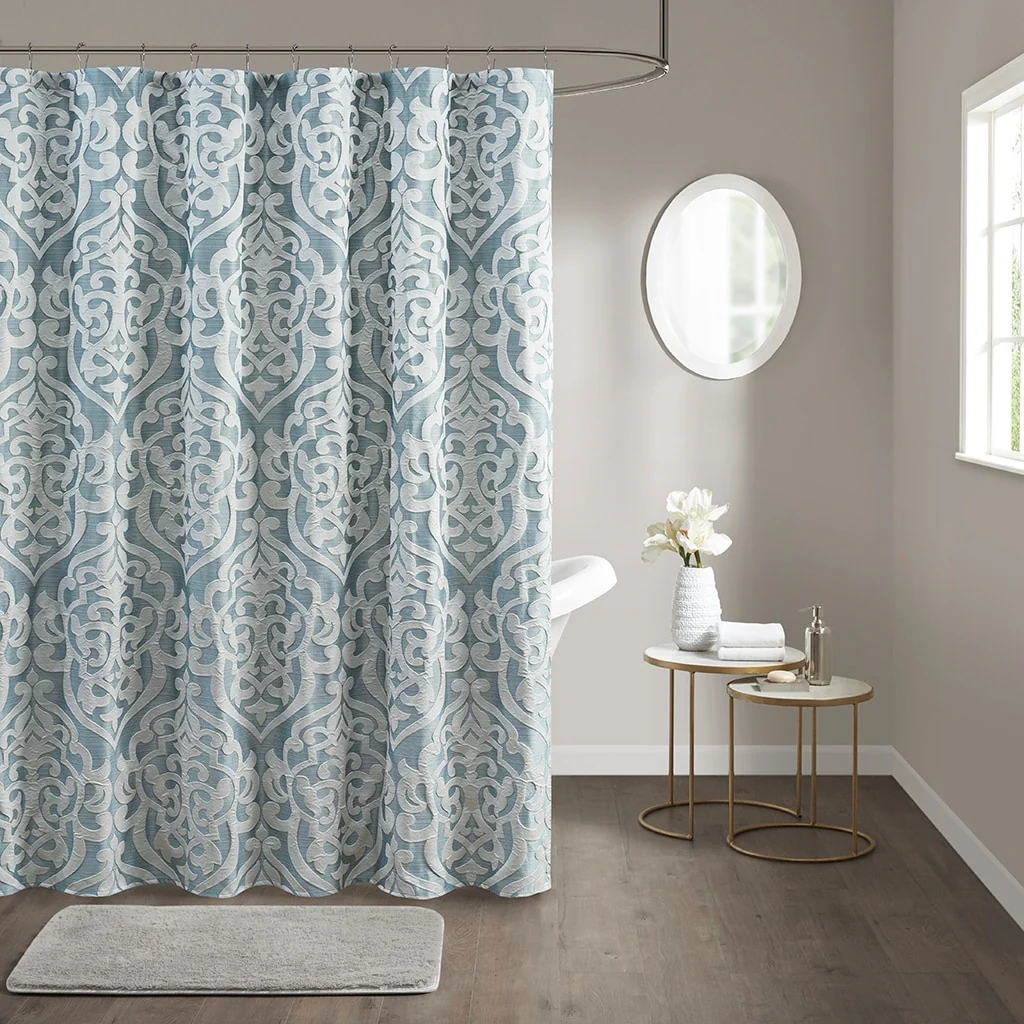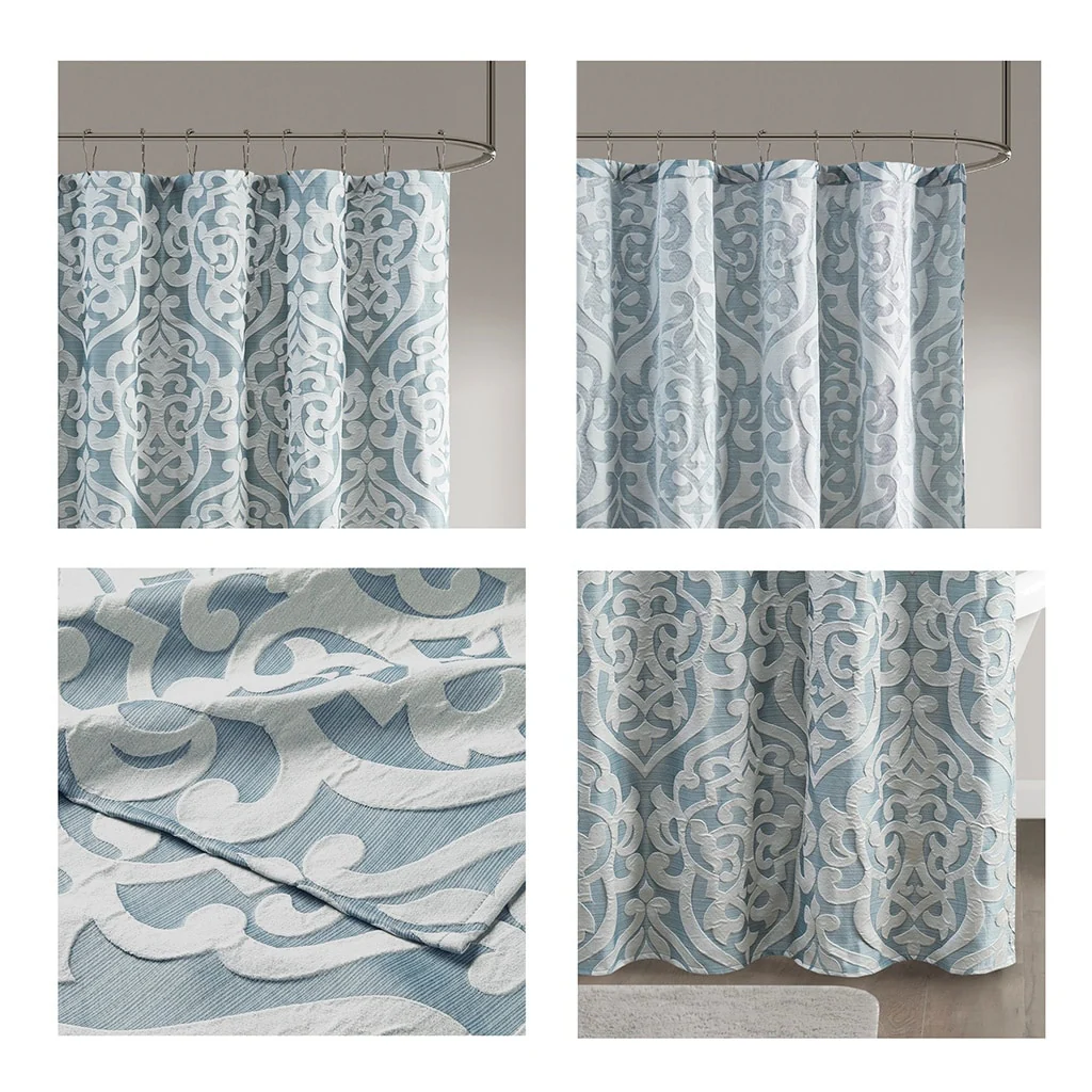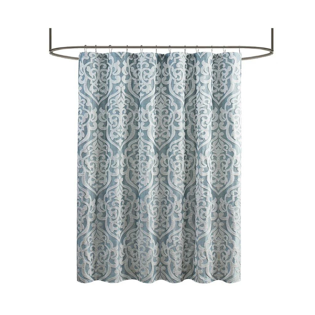 Add a touch of class to your bathroom with our Madison Park Odette Jacquard Shower Curtain. This luxurious textured shower curtain flaunts a gorgeous silver damask medallion design on a stria grey jacquard ground that adds rich texture and dimension to the lavish look. Measuring 72x72', each shower curtain is finished with 12 button holes on top making it easy to assemble hooks and hang onto rod (hooks and rod not included). To better preserve this beautiful shower curtain, a water repellant liner is highly recommended and can be purchased separately (liner not included). Machine washable for easy care; complete the collection with coordinate matching bedding, alas available and sold separately.