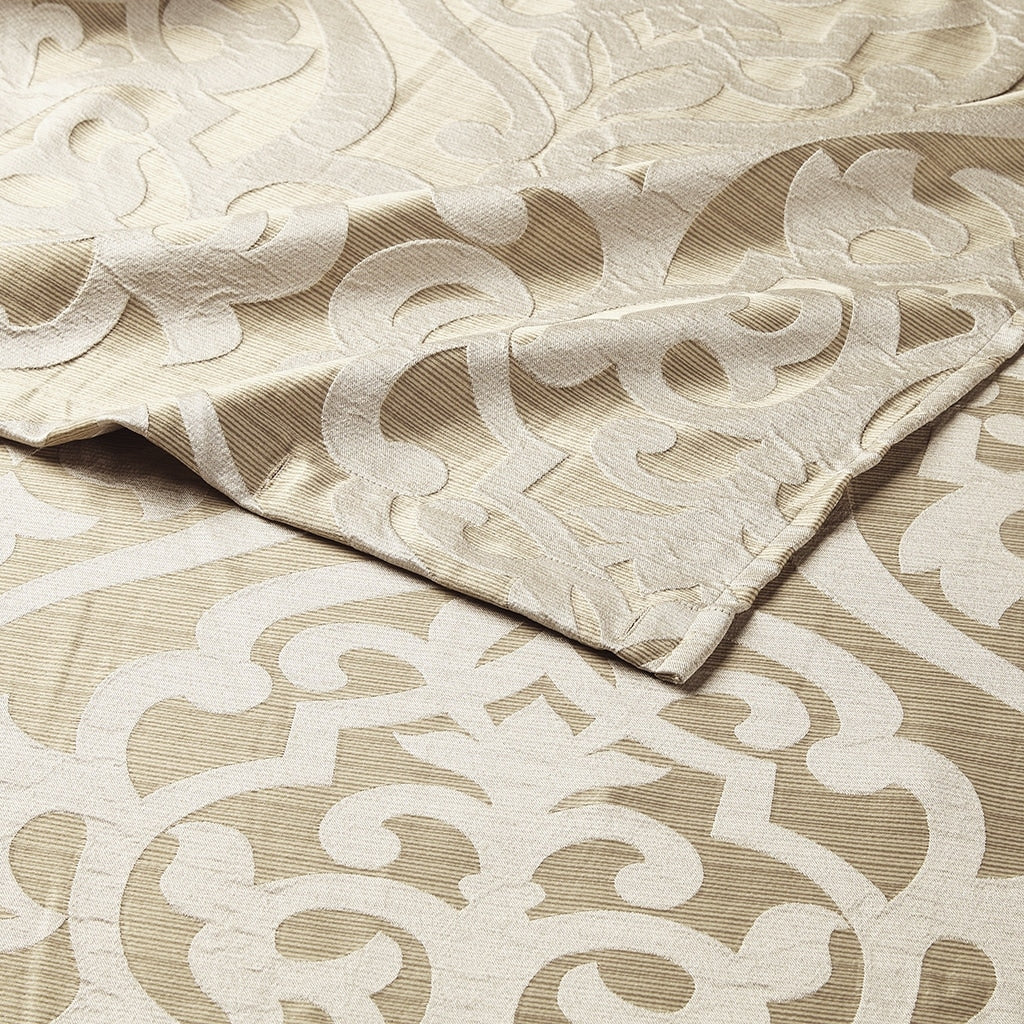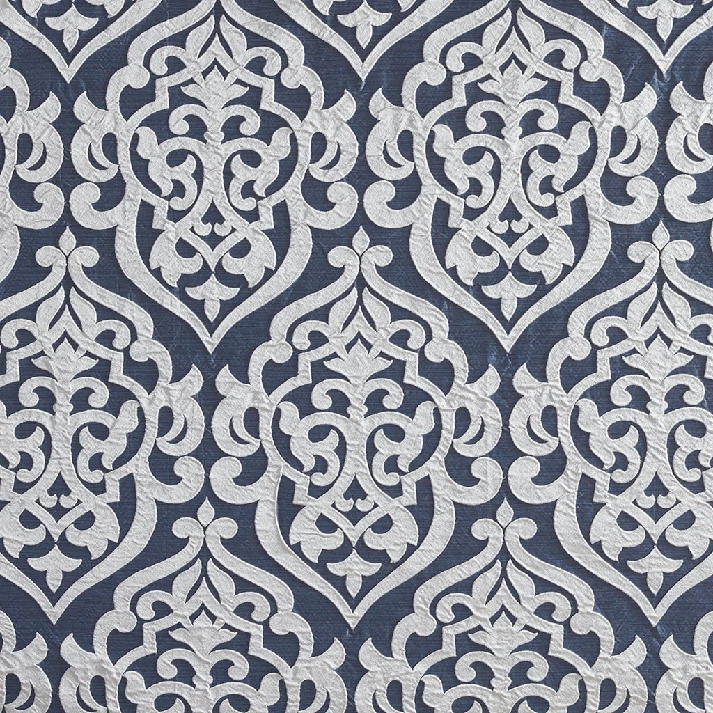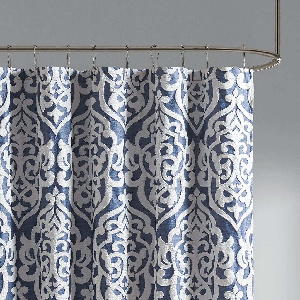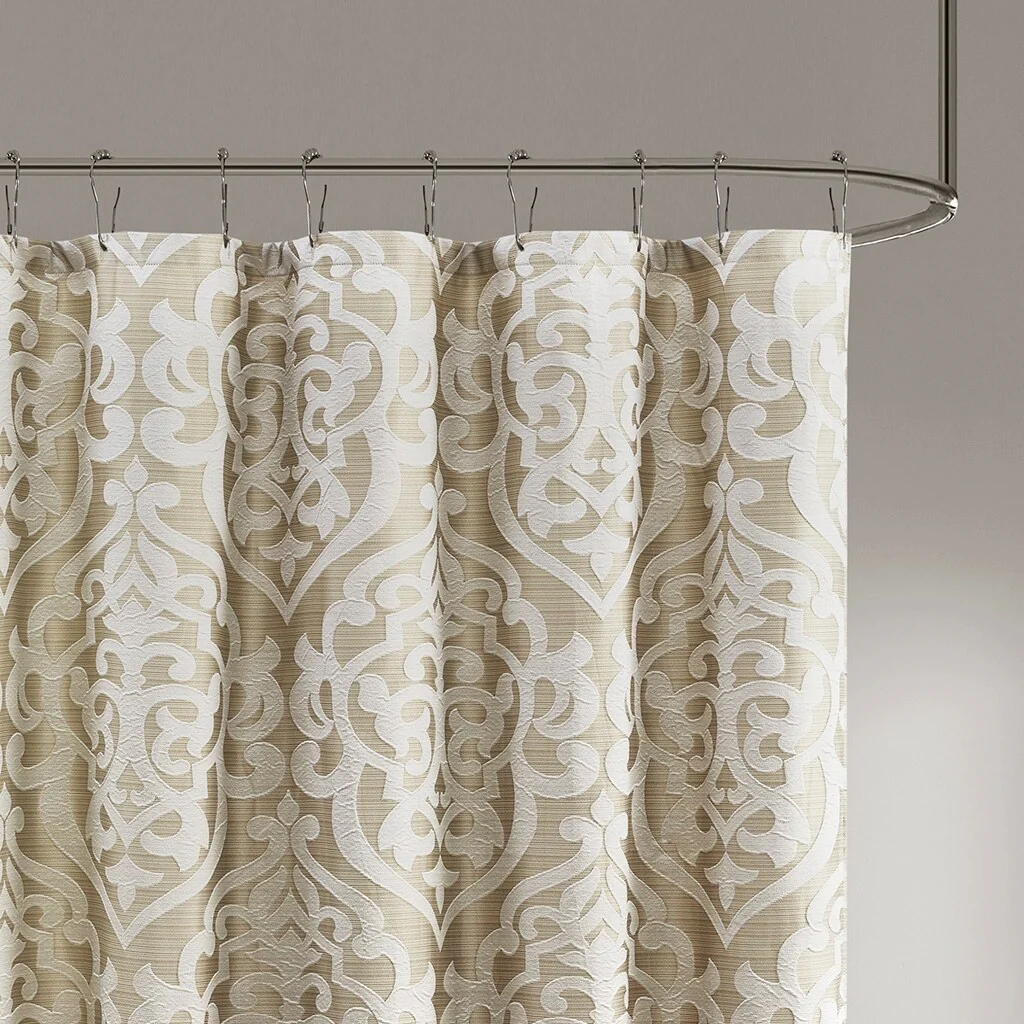 Add a touch of class to your bathroom with our Madison Park Odette Jacquard Shower Curtain. This luxurious textured shower curtain flaunts a gorgeous silver damask medallion design on a stria grey jacquard ground that adds rich texture and dimension to the lavish look. Measuring 72x72', each shower curtain is finished with 12 button holes on top making it easy to assemble hooks and hang onto rod (hooks and rod not included). To better preserve this beautiful shower curtain, a water repellant liner is highly recommended and can be purchased separately (liner not included). Machine washable for easy care; complete the collection with coordinate matching bedding, alas available and sold separately.