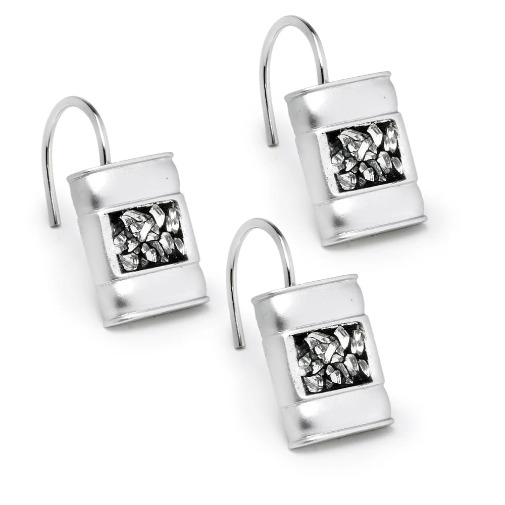 Upgrade your bathroom with this stunning and contemporary luxury shower curtain and hooks set or separates. The lightweight polyester and poly-cotton curtain features an embroidered pattern with horizontal stripes and a crack glass design, all in a metallic silver color. The hooks, made of resin and metal, offer durability and strength. Choose from options including hooks only, hooks and curtain or curtain only, and enjoy easy machine-washable care. Please note that a waterproof liner is required (not included) to complete the look.