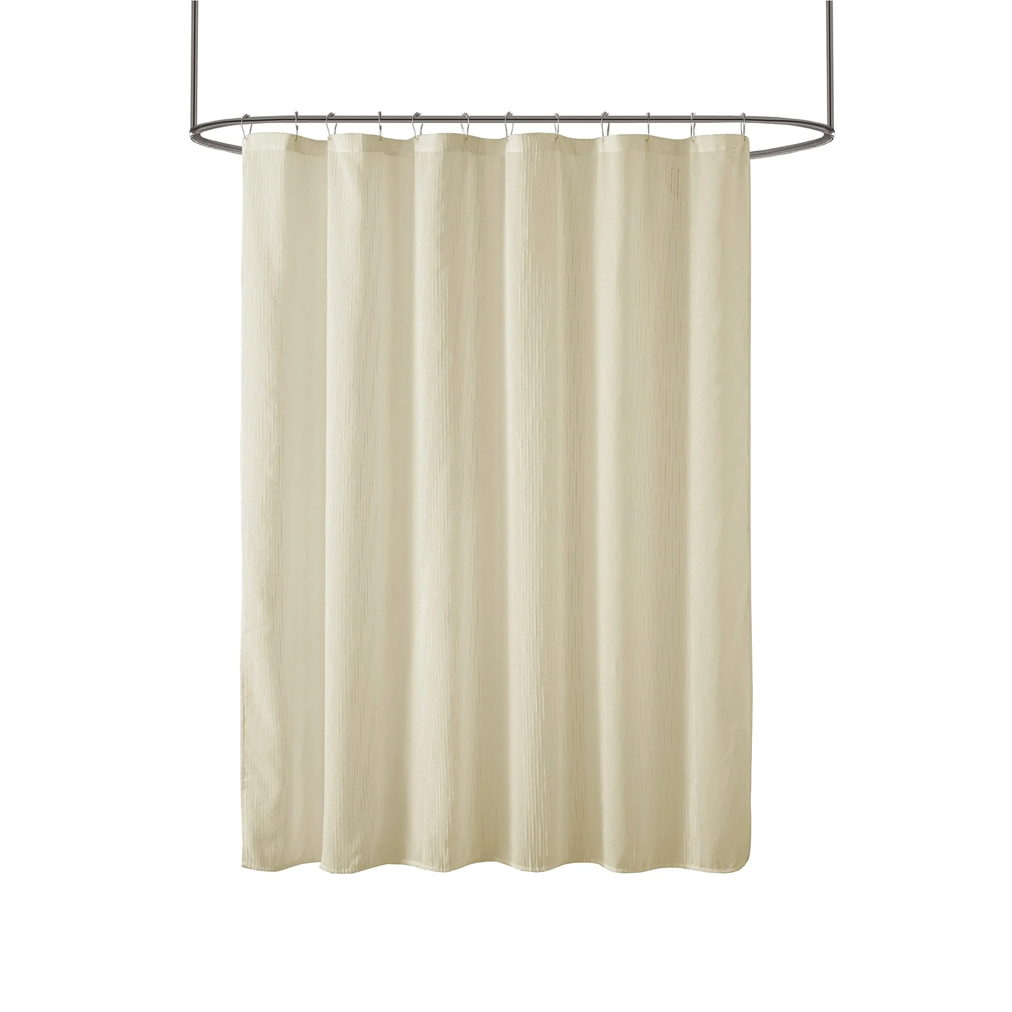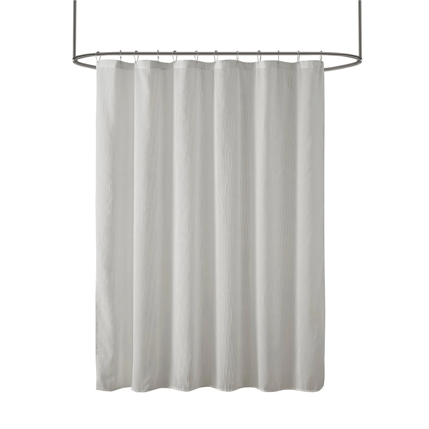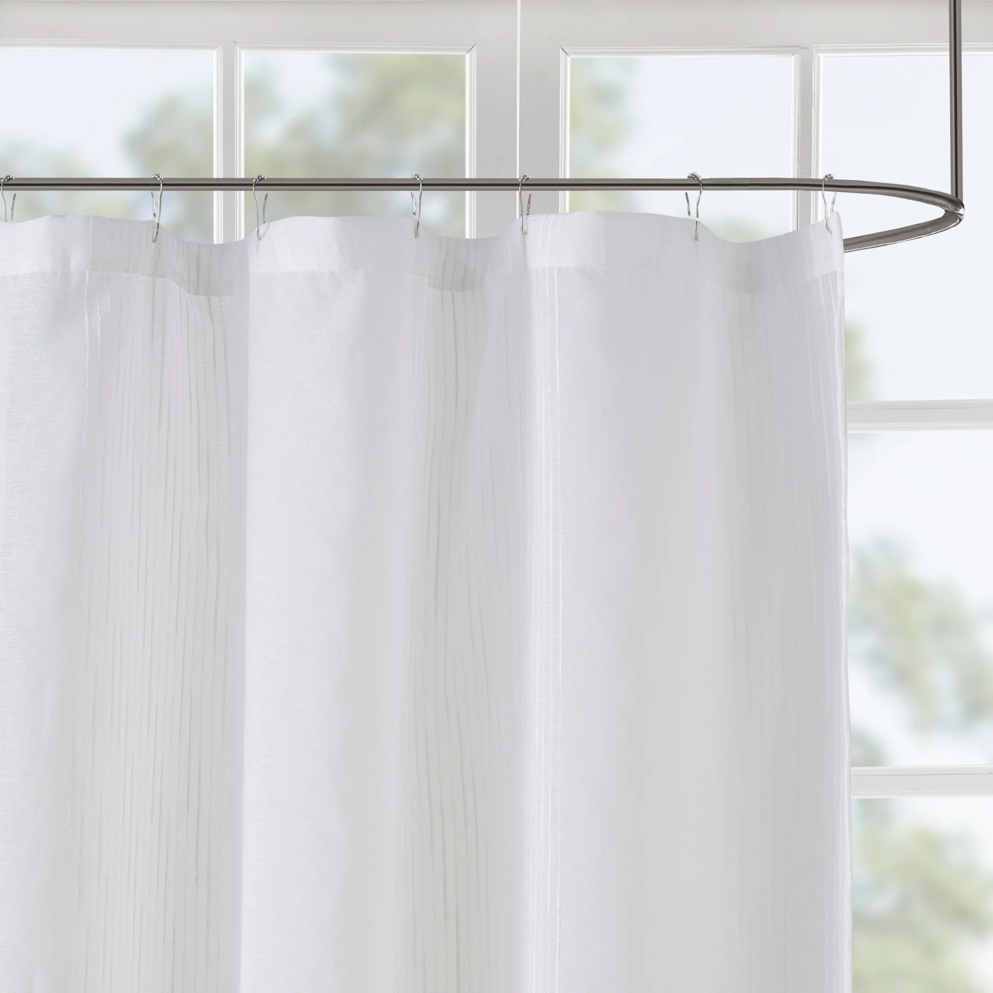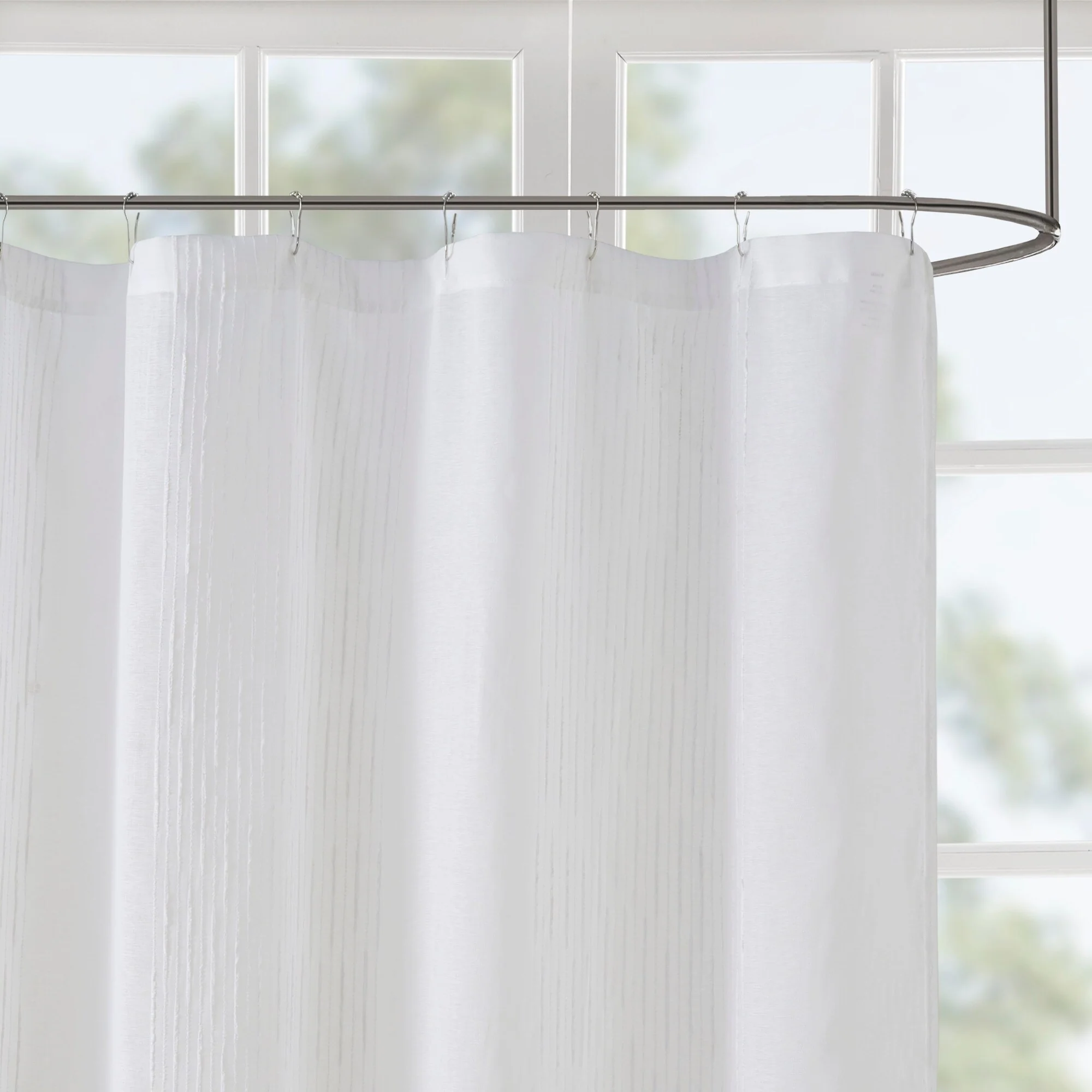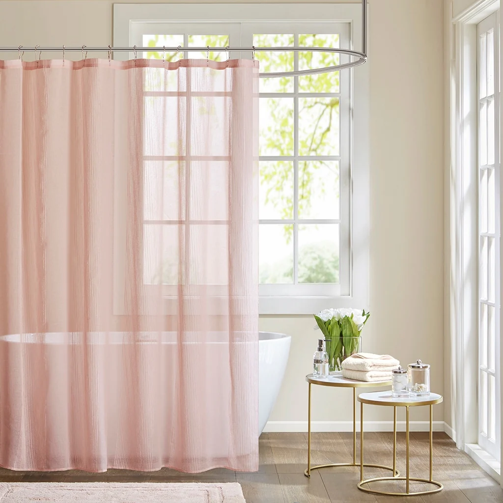 Tweak bathroom decor down to the detail with this sheer shower curtain by Madison Park. This curtain provides a sheer, luxurious top layer for your shower curtain installation, with polyester construction for softness and durability. A textured stripe pattern gives this curtain some visual nuance, and neutral color options harmonize readily with a wide variety of palettes.