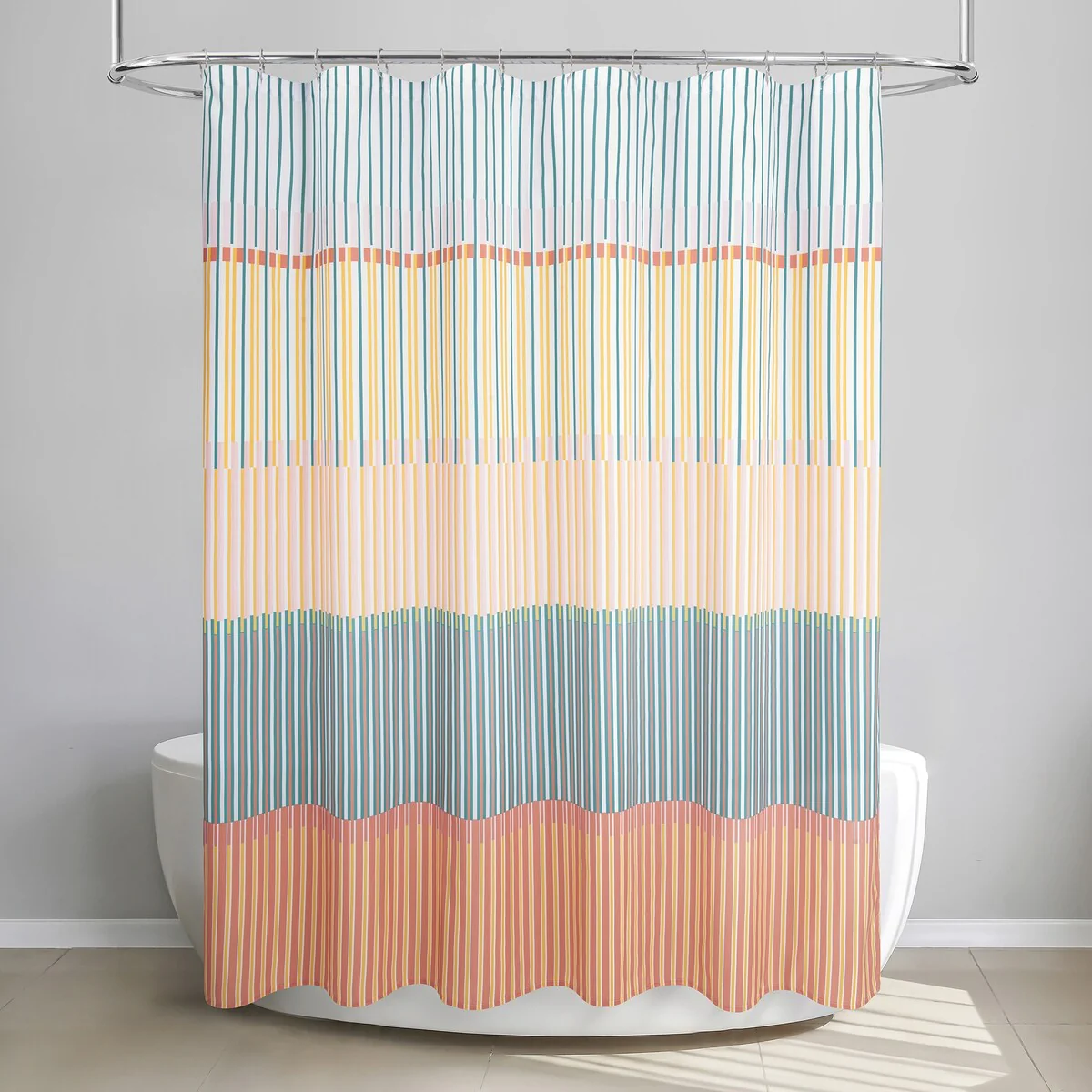 Bring the perfect blend of eye-catching style and refreshing color to your bathroom with the Market Stripe Shower Curtain by Allure Home Creation. This artful design is printed on 100% easy care plain weave polyester featuring a variegated stripe in a medley of warm contrasting colors on a white background. It measures 70' x 72' and will fit most standard sized tubs and shower areas. The reinforced buttonhole top works with standard shower hooks and curtain rods. Not only will this shower curtain fashionably dress your bathroom, but it will also help prevent water from splashing outside of your tub or shower stall. Use of a liner is recommended. Use alone or coordinate with other matching pieces in the Market Stripe Bath Collection. Machine wash cold and tumble dry on low heat.