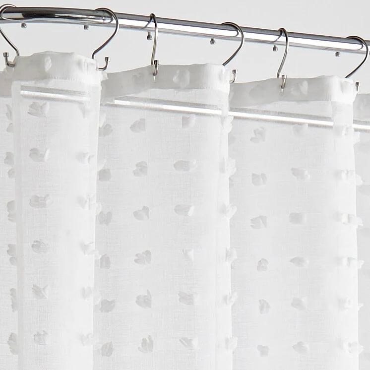 Create a luxurious and stylish bathroom with the Grand Avenue Payton Pom Pom Sheer Buttonhole Shower Curtain. The shower curtain comes in solid white or grey, showcasing a modern and sophisticated touch. Its woven fabric construction with pom-poms adds a light and elegant look to your shower space. Measuring 72' side-to-side x 72' top-to-bottom, this shower curtain is perfect for most bathtubs and shower stalls. Experience a clean and fresh look in your bathroom with this beautifully draping shower curtain.