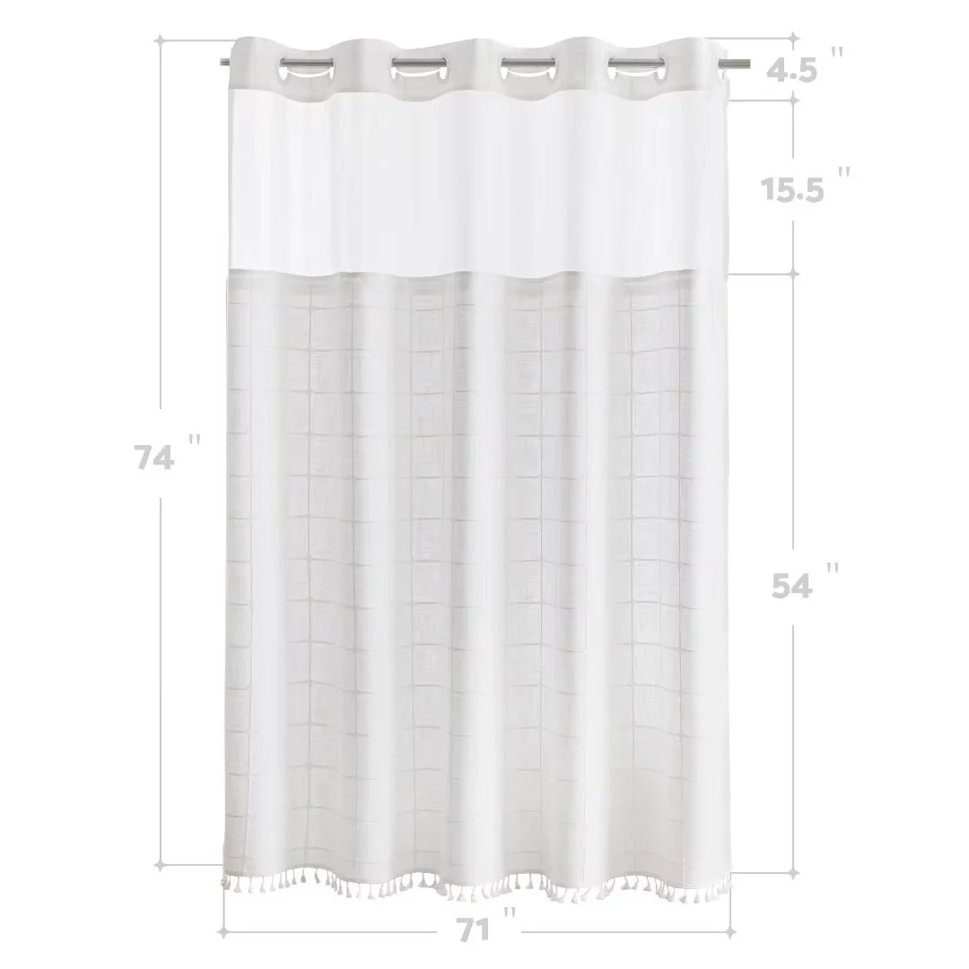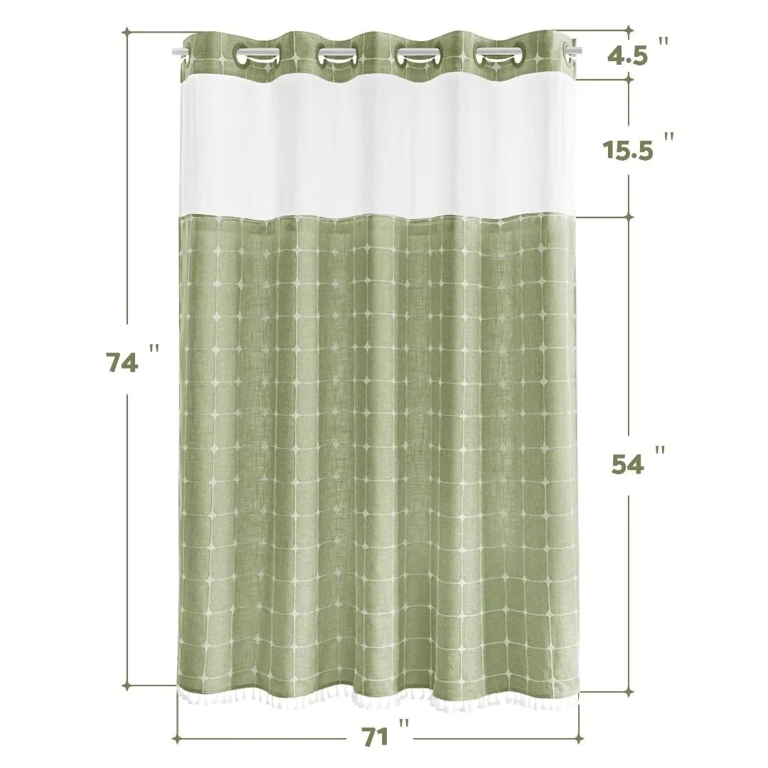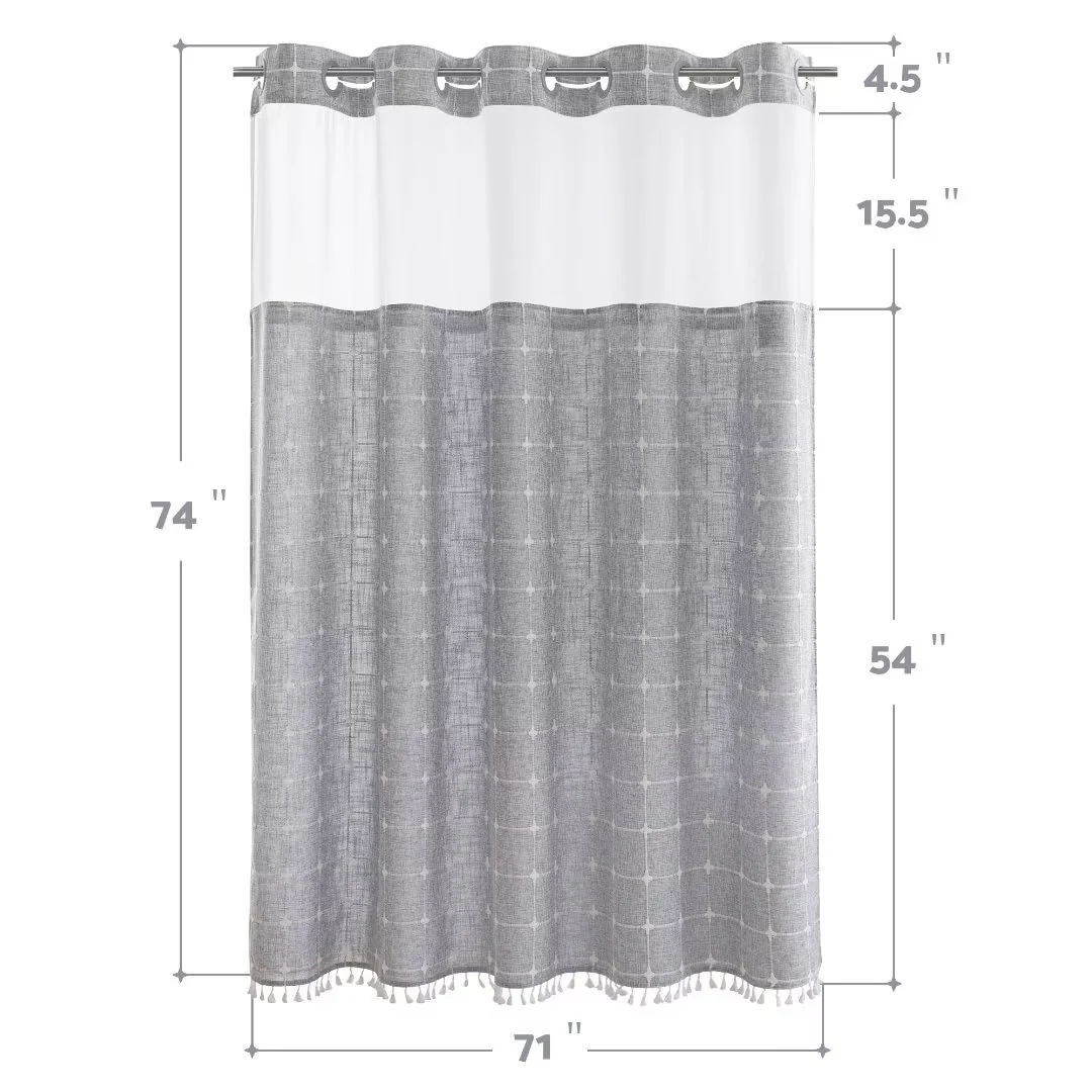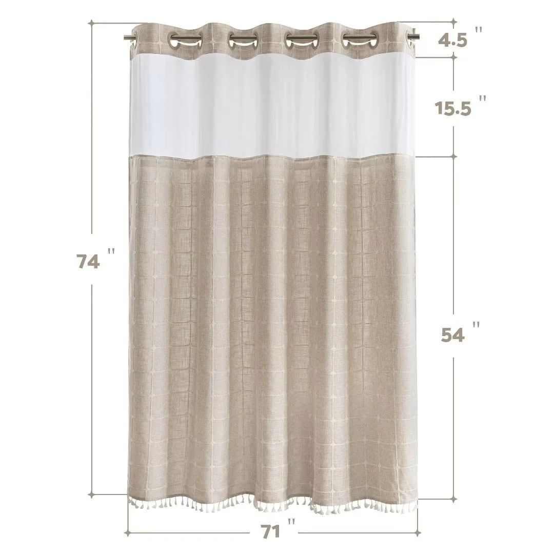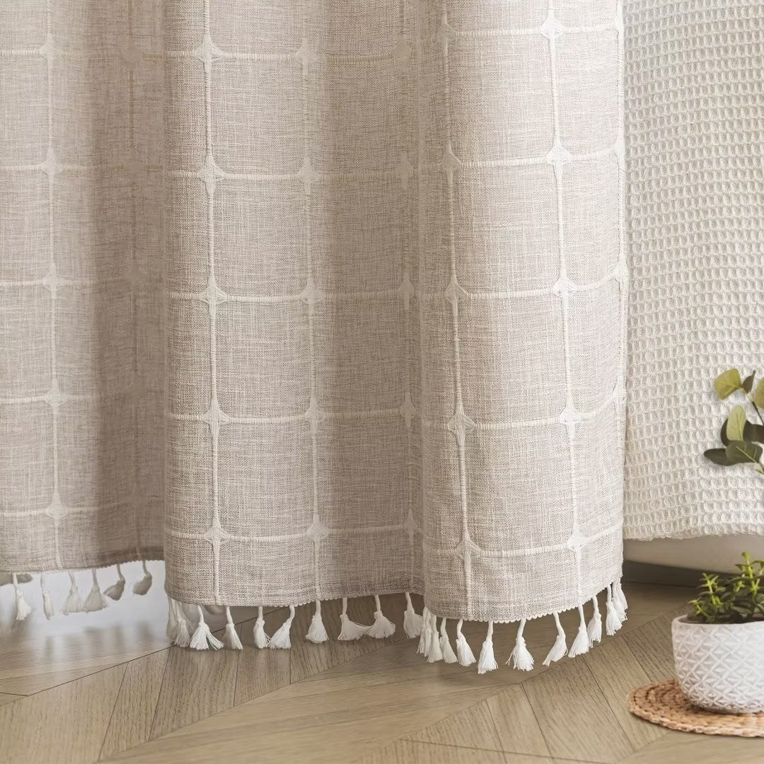Introducing the Modern Farmhouse Geometric Tassel Shower Curtain, a luxurious addition to any bathroom that combines sophisticated design with practical functionality. Perfect for those who appreciate fine details and unique touches. Featured with captivating 3D embroidery geometric design and charming tassels at the bottom, this shower curtain effortlessly transforms your bathroom into a stylish retreat. Built-in split rings makes it easy for installment, no additional hooks needed, simply slide onto your shower rod for an instant upgrade. Top sheer window allows light and air to flow into and brightens your bath space. The detachable liner is easy to snap on/off for cleaning or replacing.