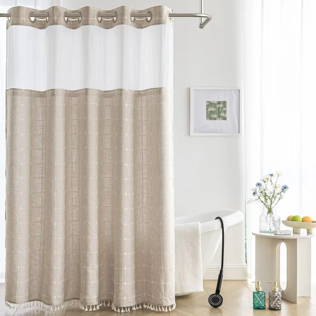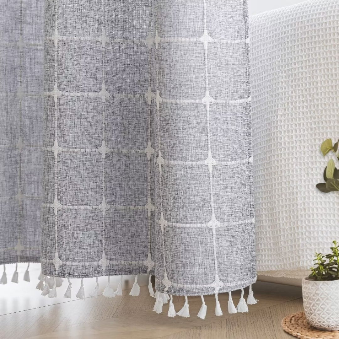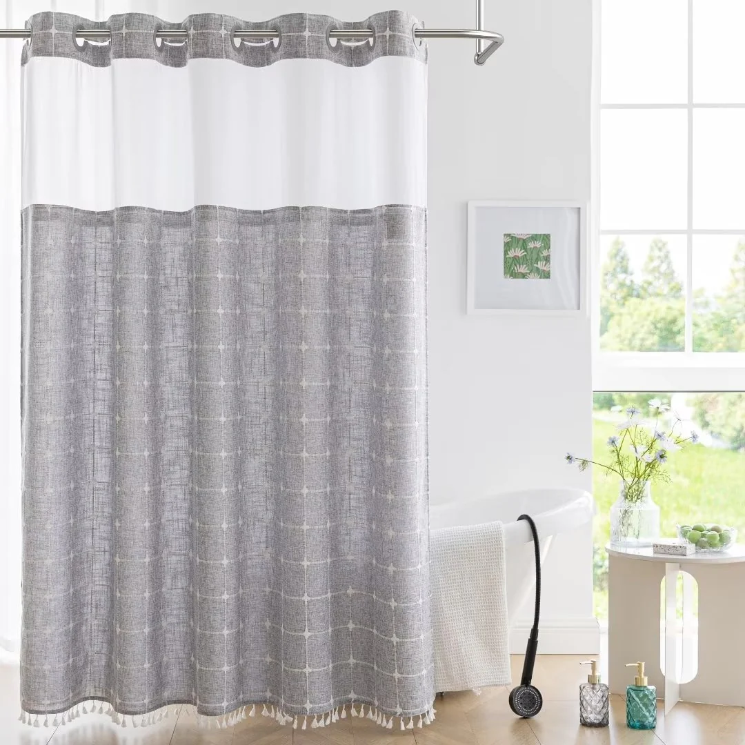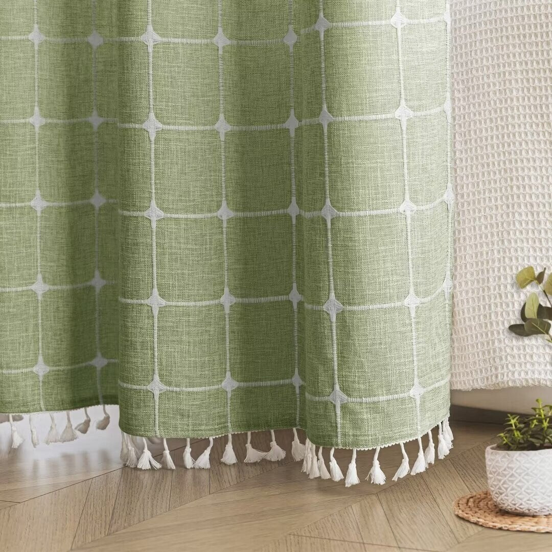 Introducing the Modern Farmhouse Geometric Tassel Shower Curtain, a luxurious addition to any bathroom that combines sophisticated design with practical functionality. Perfect for those who appreciate fine details and unique touches. Featured with captivating 3D embroidery geometric design and charming tassels at the bottom, this shower curtain effortlessly transforms your bathroom into a stylish retreat. Built-in split rings makes it easy for installment, no additional hooks needed, simply slide onto your shower rod for an instant upgrade. Top sheer window allows light and air to flow into and brightens your bath space. The detachable liner is easy to snap on/off for cleaning or replacing.