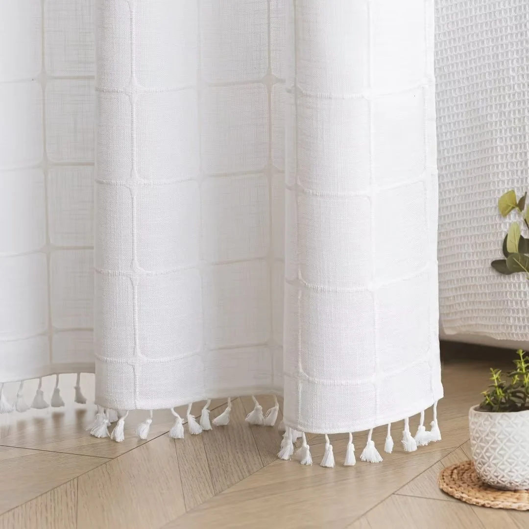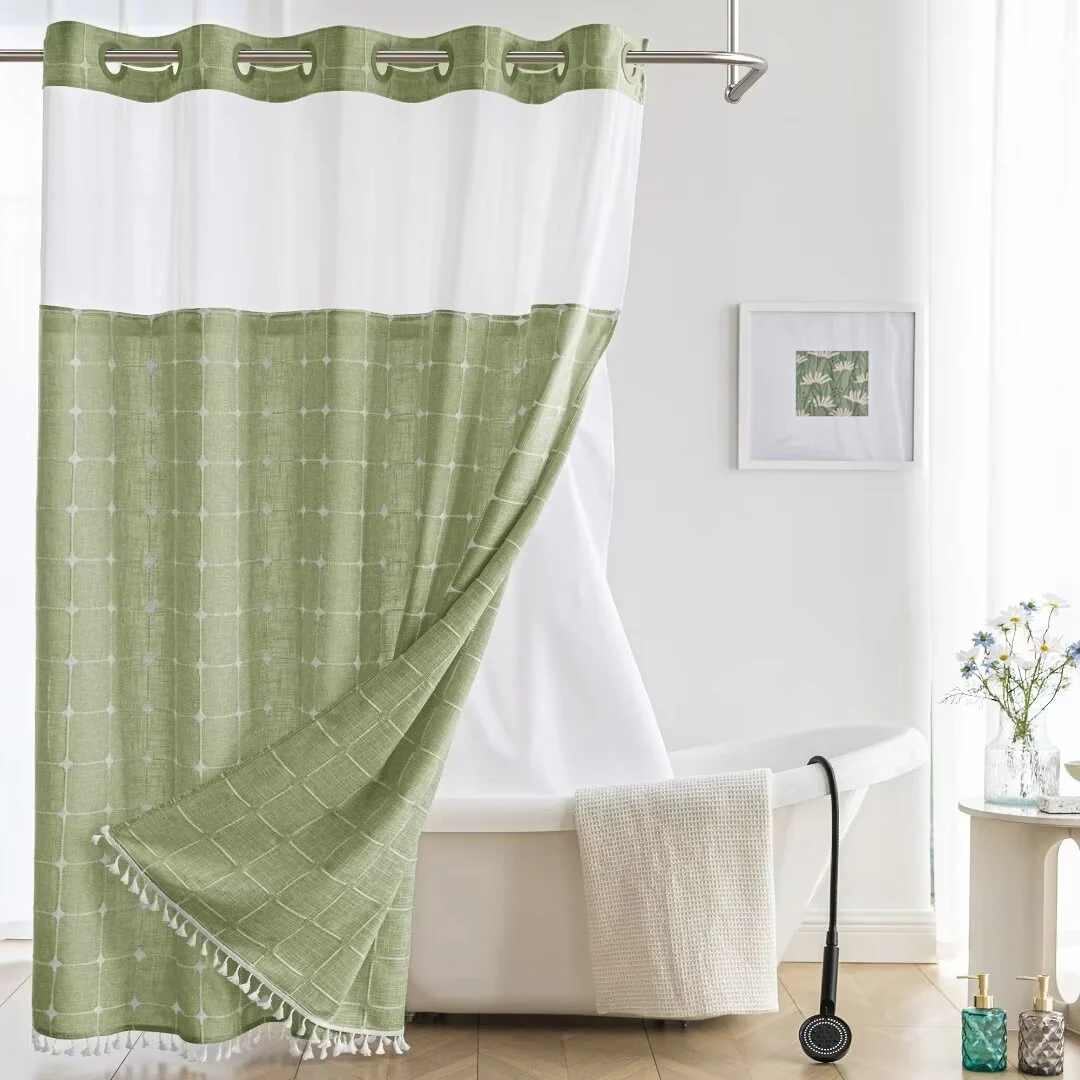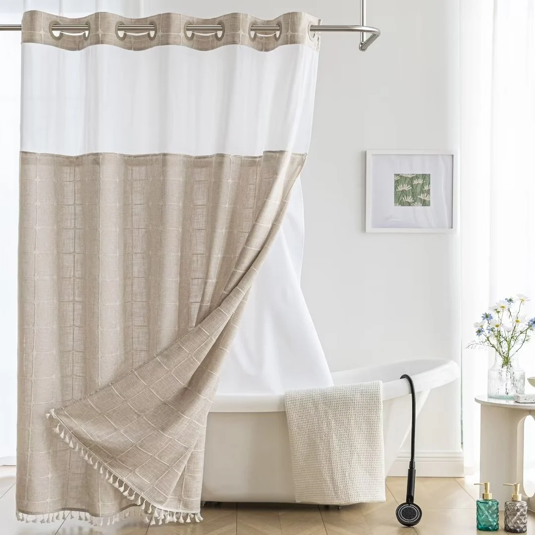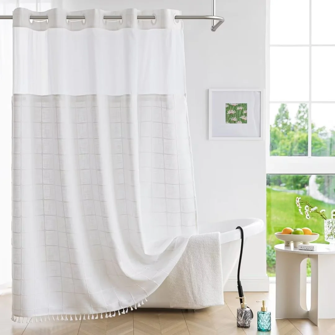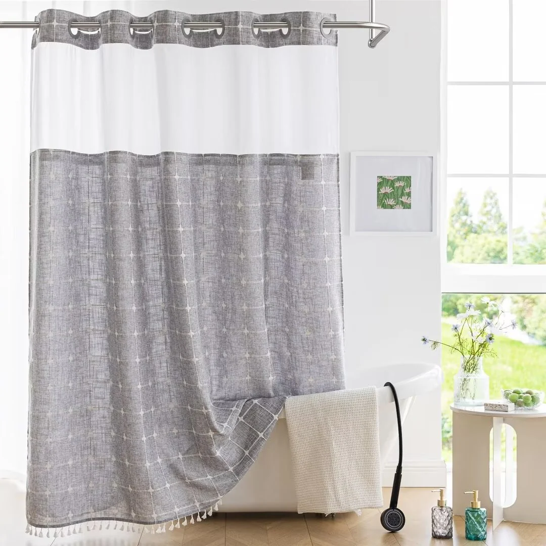 Introducing the Modern Farmhouse Geometric Tassel Shower Curtain, a luxurious addition to any bathroom that combines sophisticated design with practical functionality. Perfect for those who appreciate fine details and unique touches. Featured with captivating 3D embroidery geometric design and charming tassels at the bottom, this shower curtain effortlessly transforms your bathroom into a stylish retreat. Built-in split rings makes it easy for installment, no additional hooks needed, simply slide onto your shower rod for an instant upgrade. Top sheer window allows light and air to flow into and brightens your bath space. The detachable liner is easy to snap on/off for cleaning or replacing.