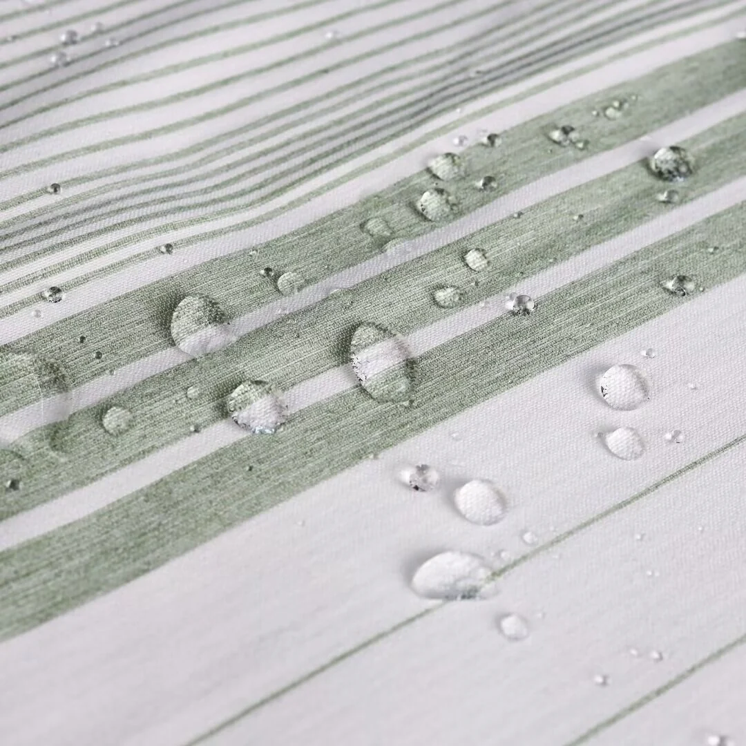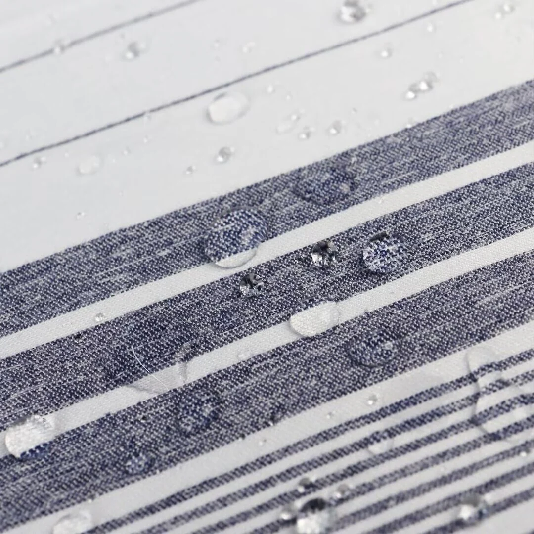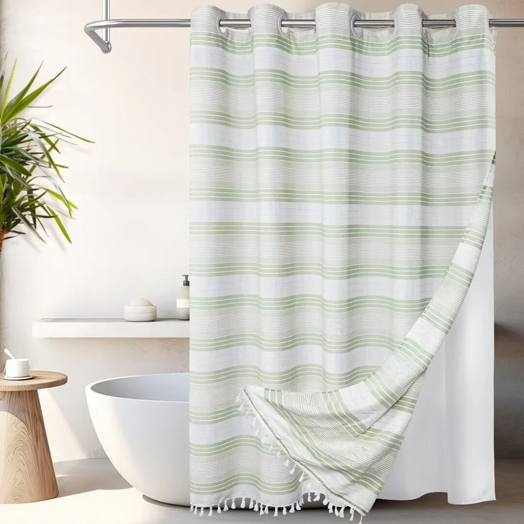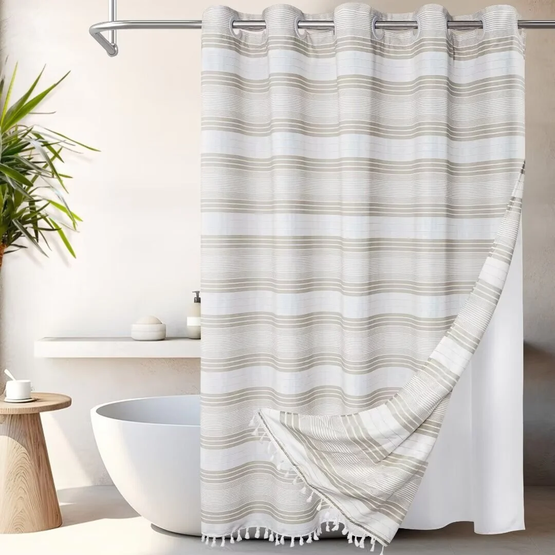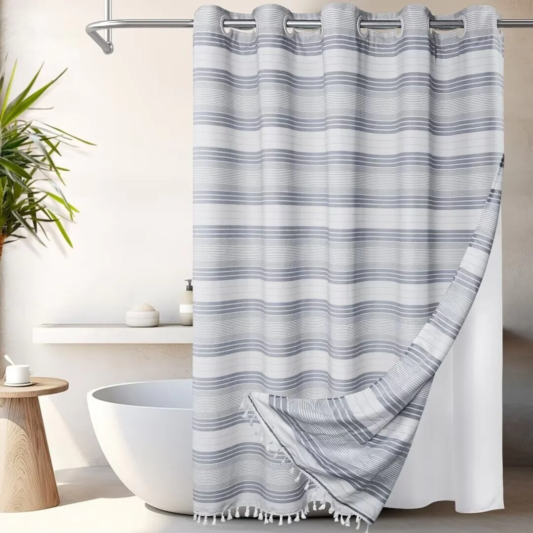 The vibrant beach stripe design brings a refreshing coastal vibe to your bathroom. Its breezy, summery colors evoke the feeling of being by sea, making your space feel more relaxed and inviting. The bottom tassels add bohemian touch, enhancing the overall aesthetic appeal of the shower curtain. The no hook design makes setup quick and hassle-free, no additional hooks needed. Featuring the snap-in water repellent liner, it helps to prevent the water from splashing out and keeping your bathroom dry, while protecting your outer shower curtain. Perfect for various bathroom styles.