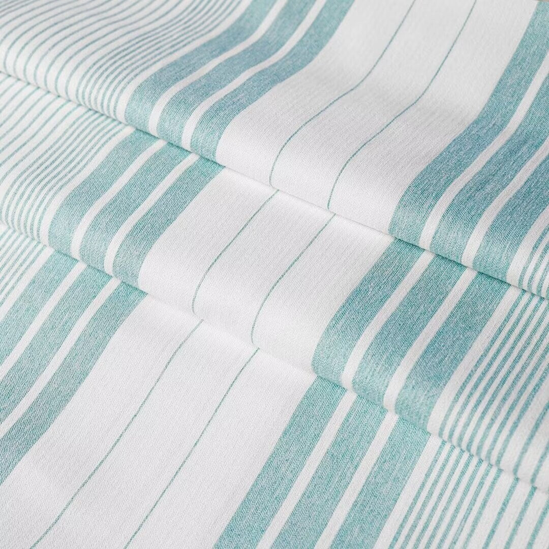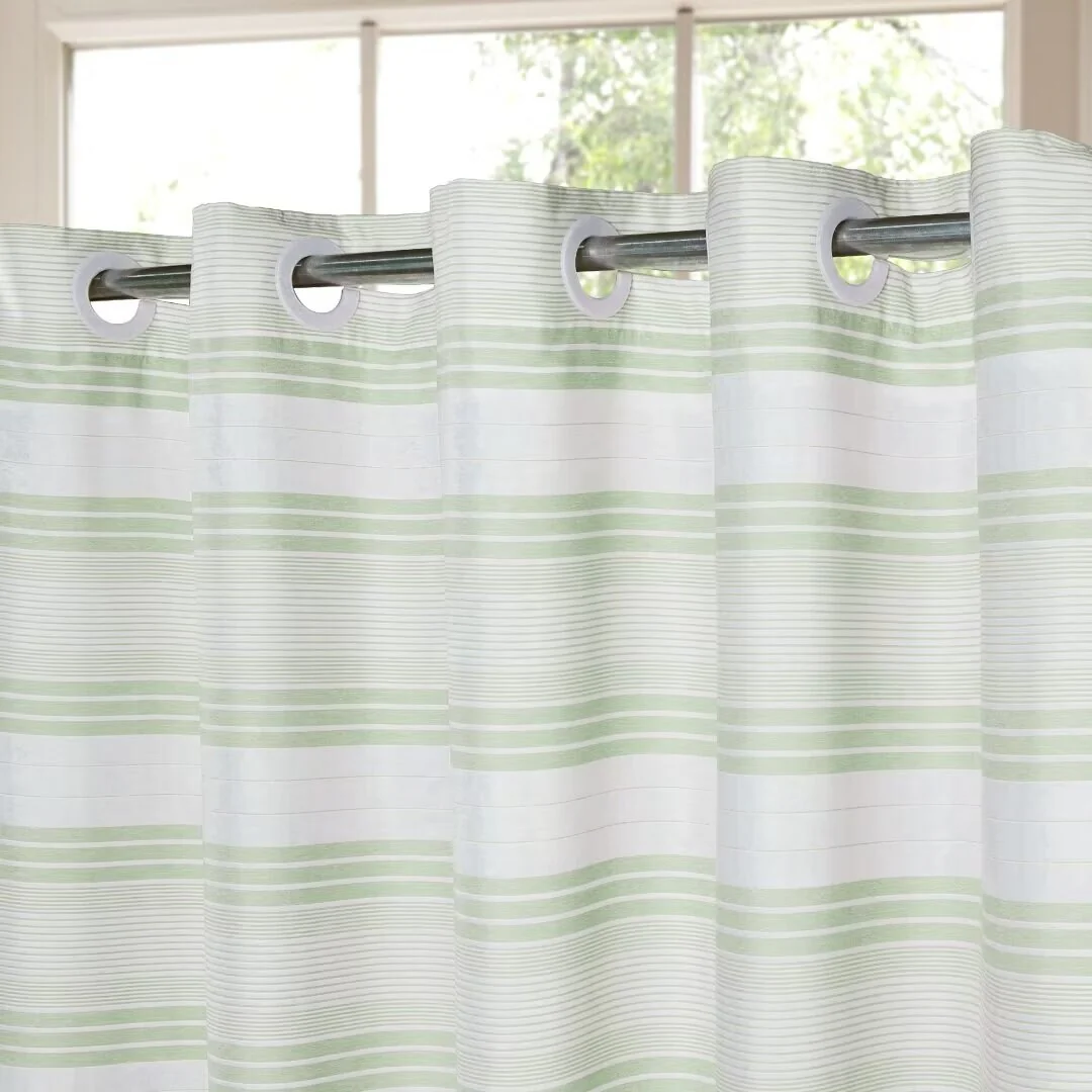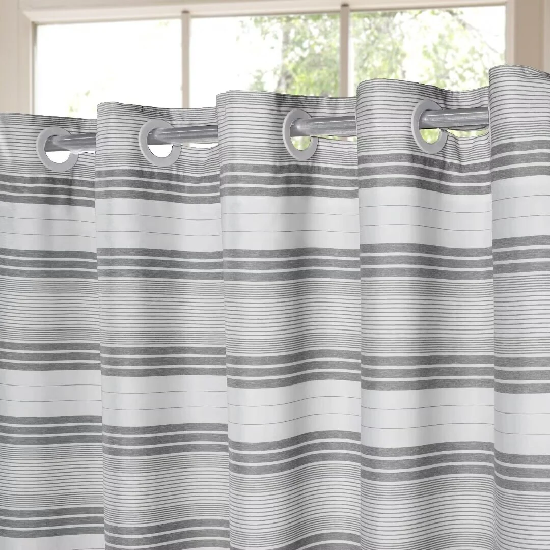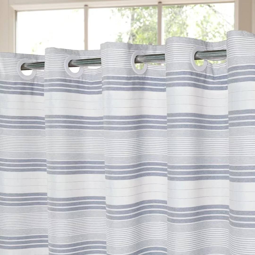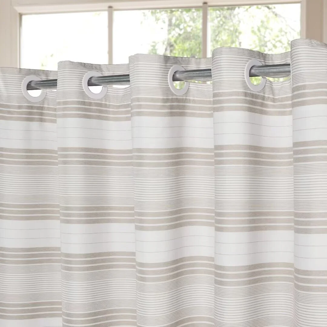 The vibrant beach stripe design brings a refreshing coastal vibe to your bathroom. Its breezy, summery colors evoke the feeling of being by sea, making your space feel more relaxed and inviting. The bottom tassels add bohemian touch, enhancing the overall aesthetic appeal of the shower curtain. The no hook design makes setup quick and hassle-free, no additional hooks needed. Featuring the snap-in water repellent liner, it helps to prevent the water from splashing out and keeping your bathroom dry, while protecting your outer shower curtain. Perfect for various bathroom styles.