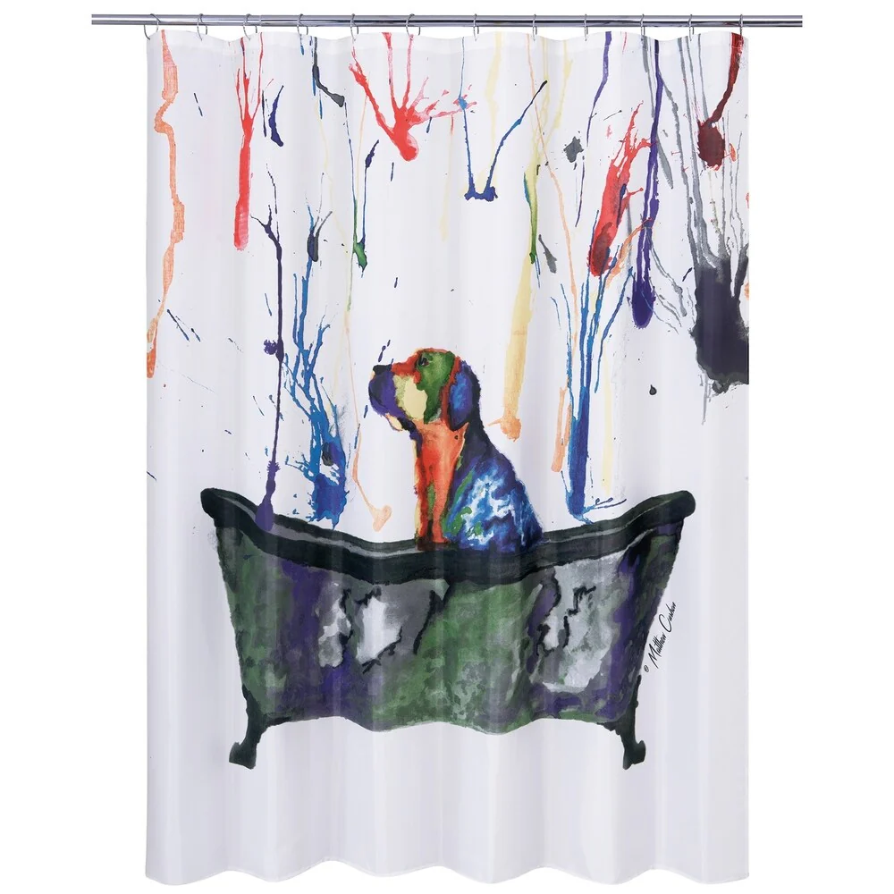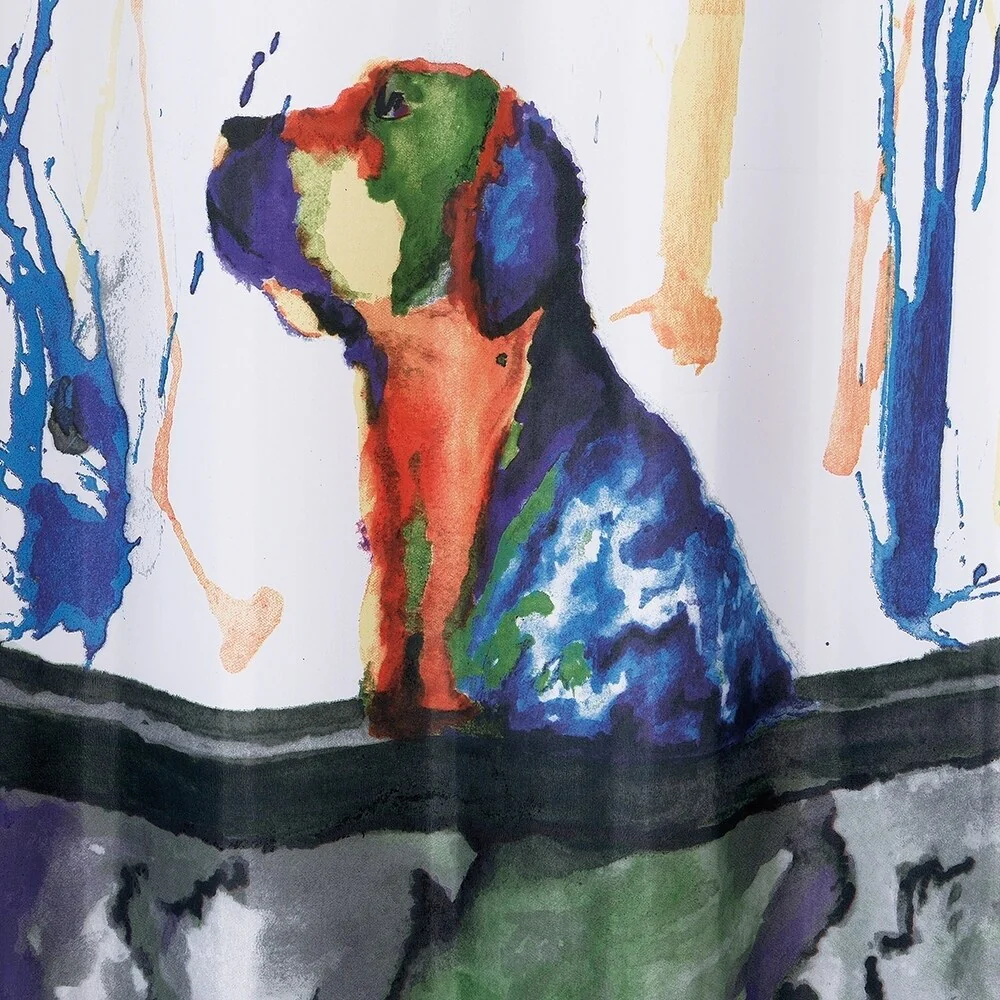 Add a modern and colorful touch to your bathroom with the Fleischner Tub Dog shower curtain from Porch & Den. The abstract design showcases a dog sitting inside a tub with splashes of bright colors, adding a charming and playful vibe to your space. Crafted from polyester, this machine washable shower curtain features a simple white background and a buttonhole top for easy installation.