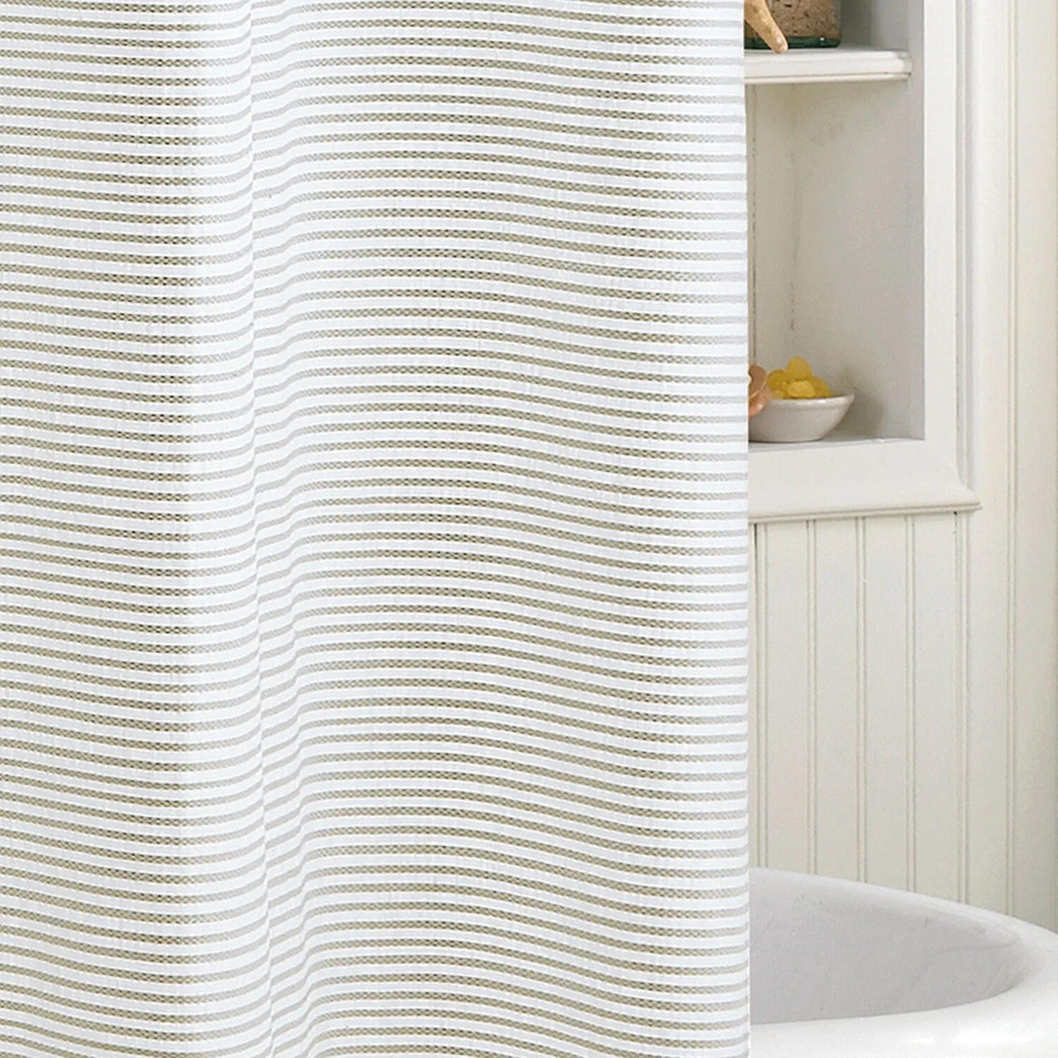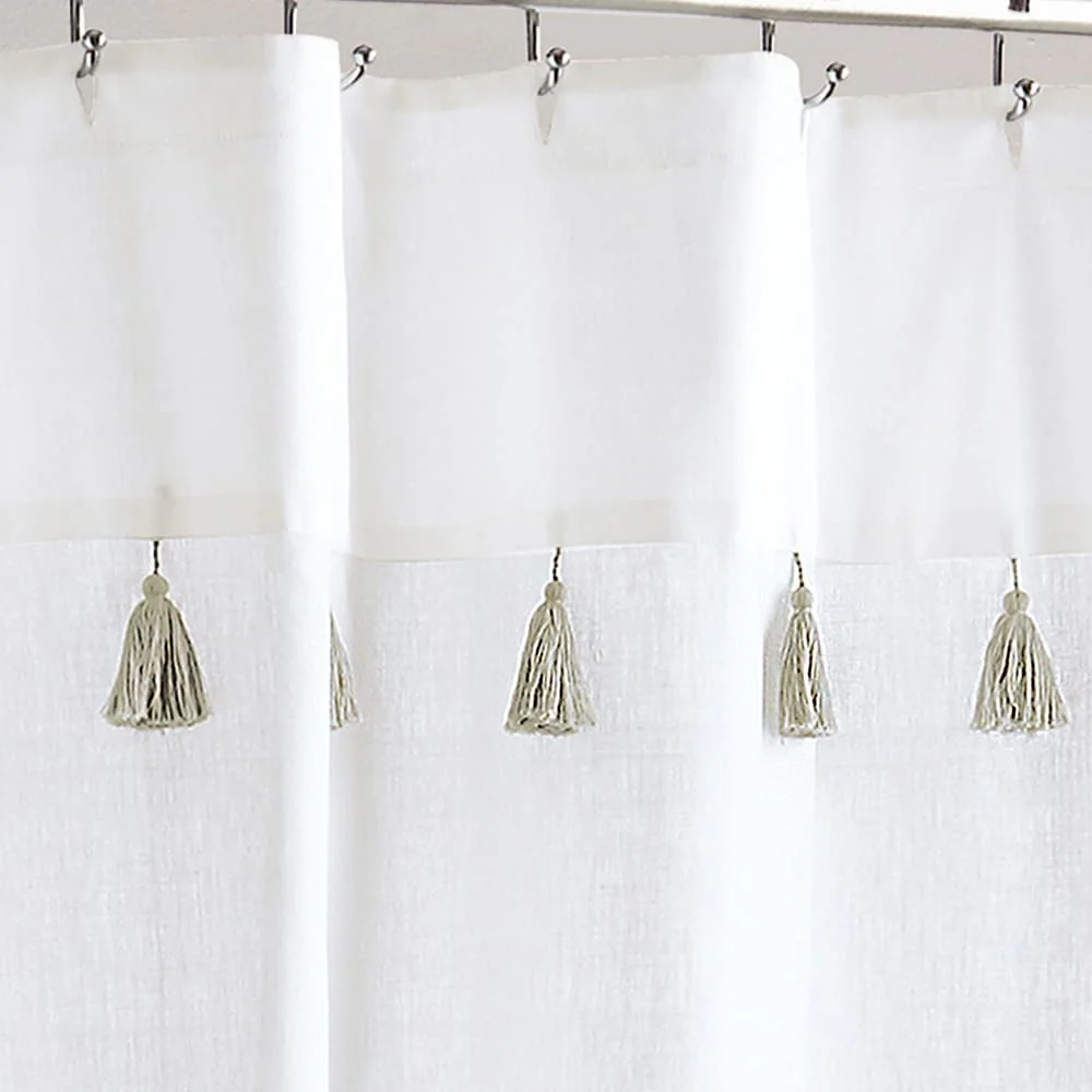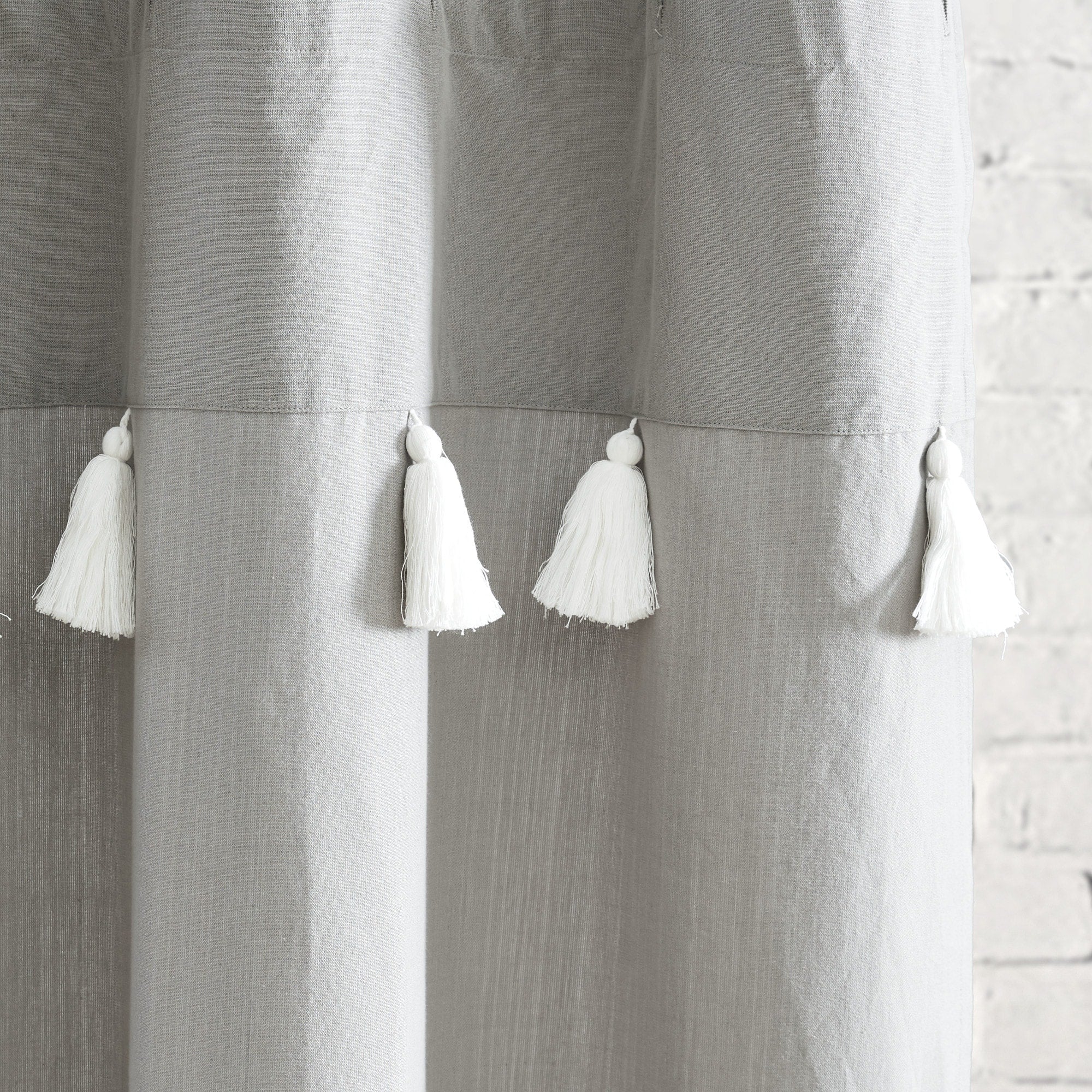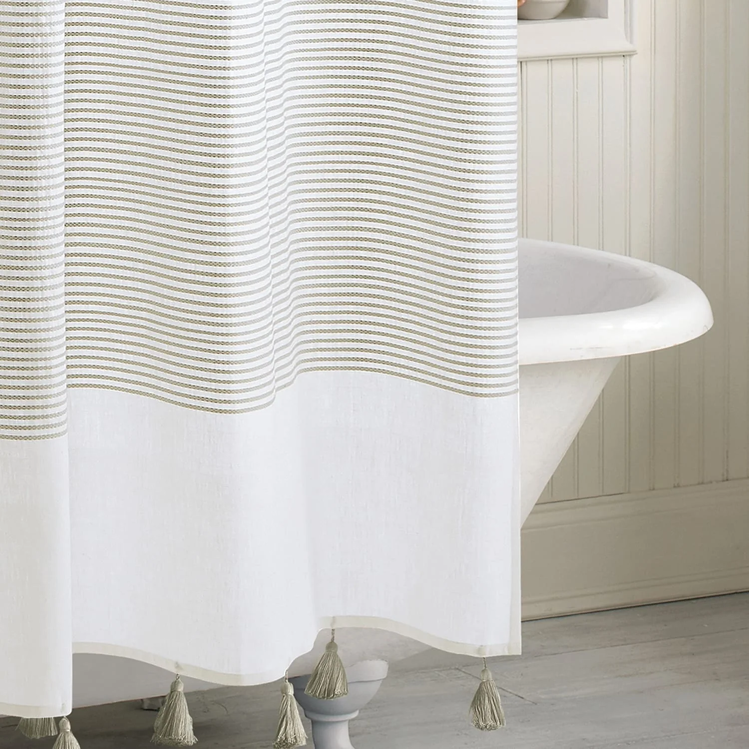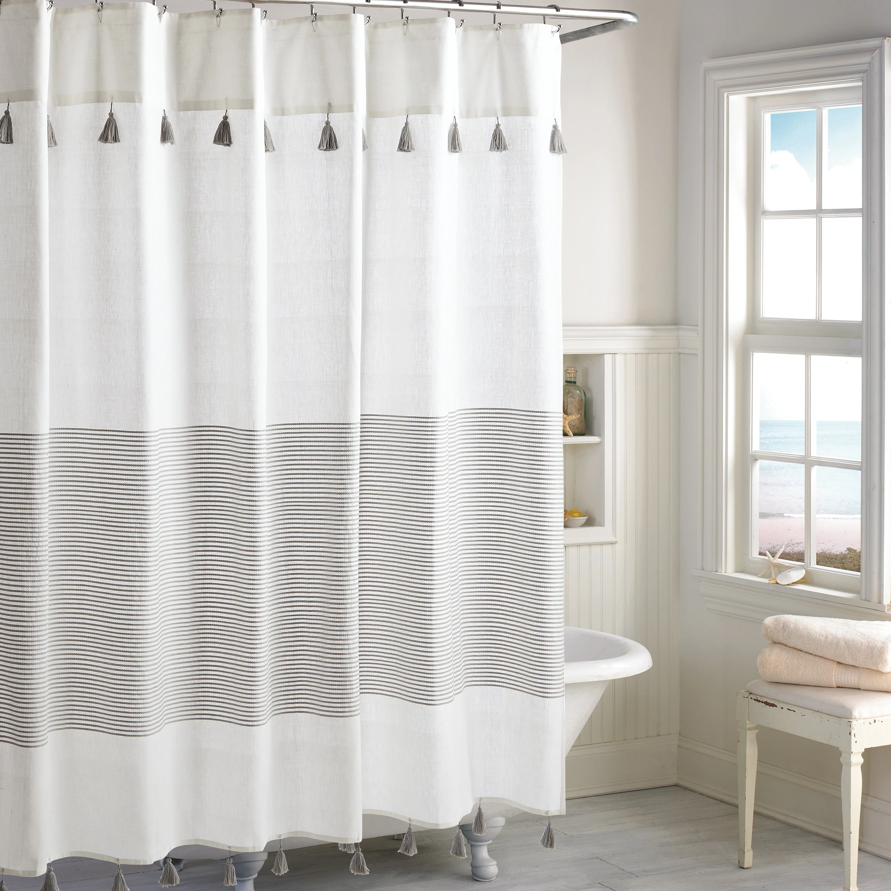Elevate your bathroom's modern style with the Onassis shower curtain from Porch & Den. Made of 100% cotton, this curtain features a striped pattern with charming tassels that add a playful touch to your bathroom decor. With four color schemes to choose from, you can effortlessly match it with your modern bathroom style.