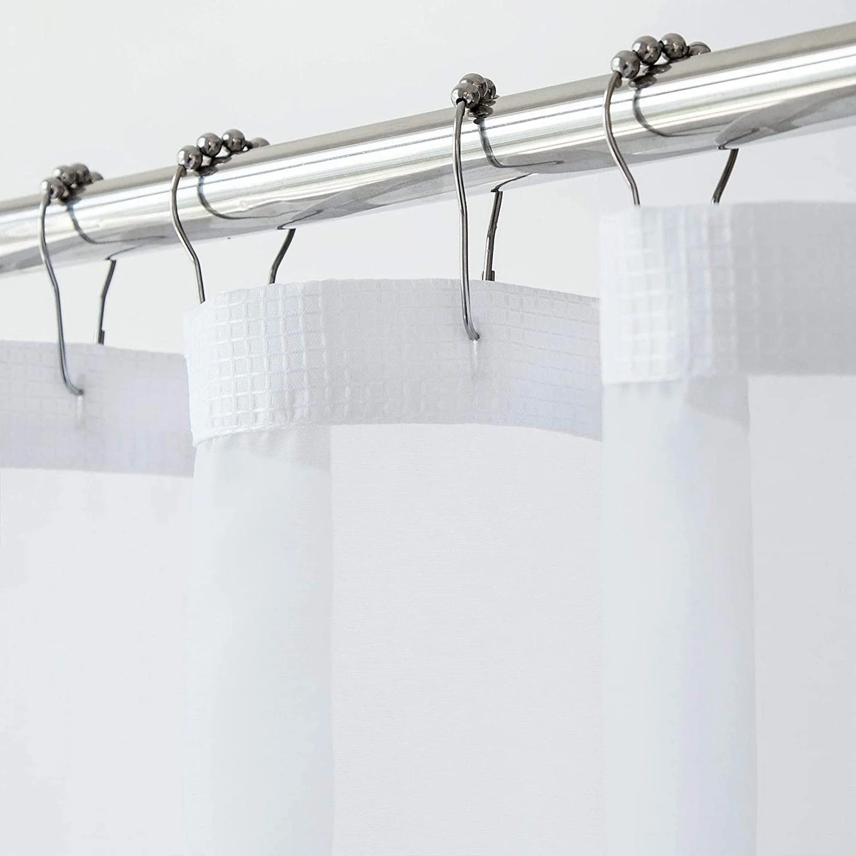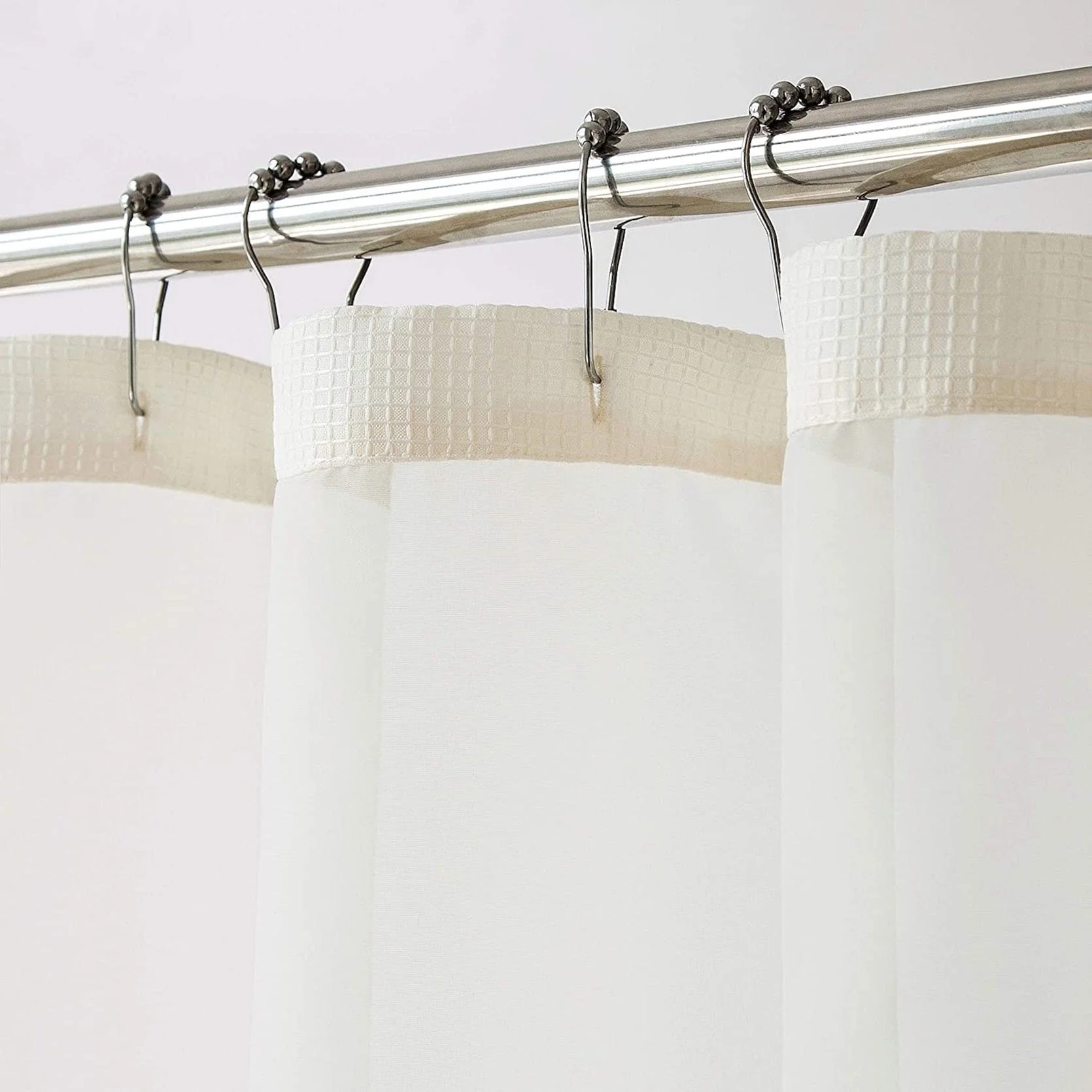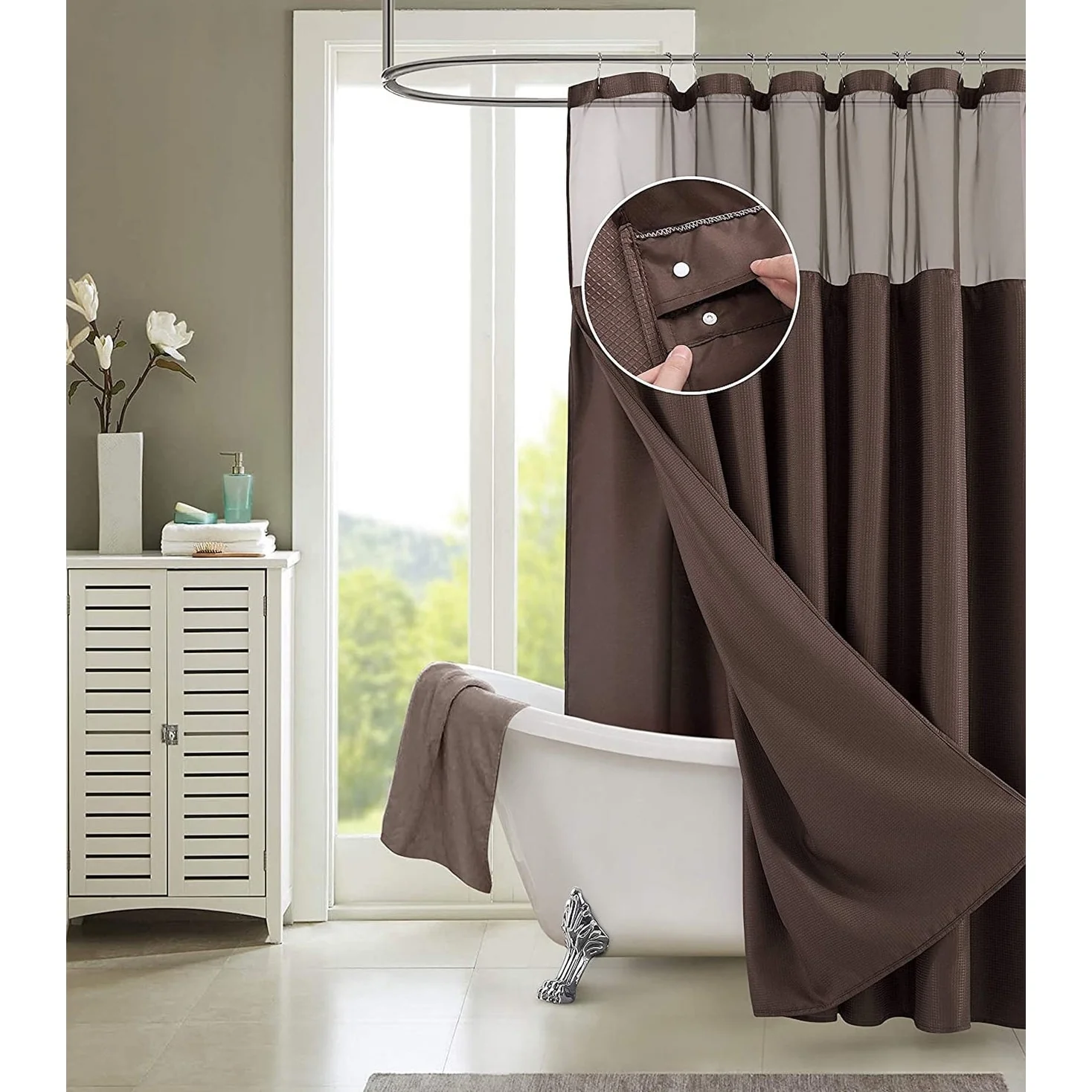 Transform any bathroom décor with this premium waffle weave fabric shower curtain with a snap-on liner by Porch & Den. The 2 in 1 shower curtain collection offers a beautiful woven waffle weave fabric curtain with an easy-to-use detachable fabric liner. These luxurious high-end hotel-inspired waffle-weave shower curtains provide the perfect combination of fashion, function, and design for the home. Constructed from heavy-weight fabric to ensure durability and long-lasting style, Hotel Collection shower curtains feature a visually pleasing, woven texture that makes you feel like you're on vacation at a tropical resort in your own home. The beautiful waffle weave fabric transforms an ordinary bathroom into a spa-like retreat. Soft to the touch, waffle weave shower curtains take your bathroom décor to a new design and comfort level. Porch & Den shower curtains offer style and decorating solutions for all bathrooms.