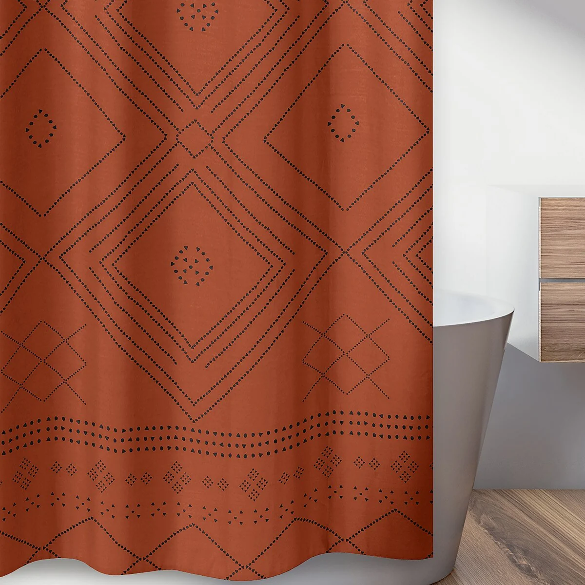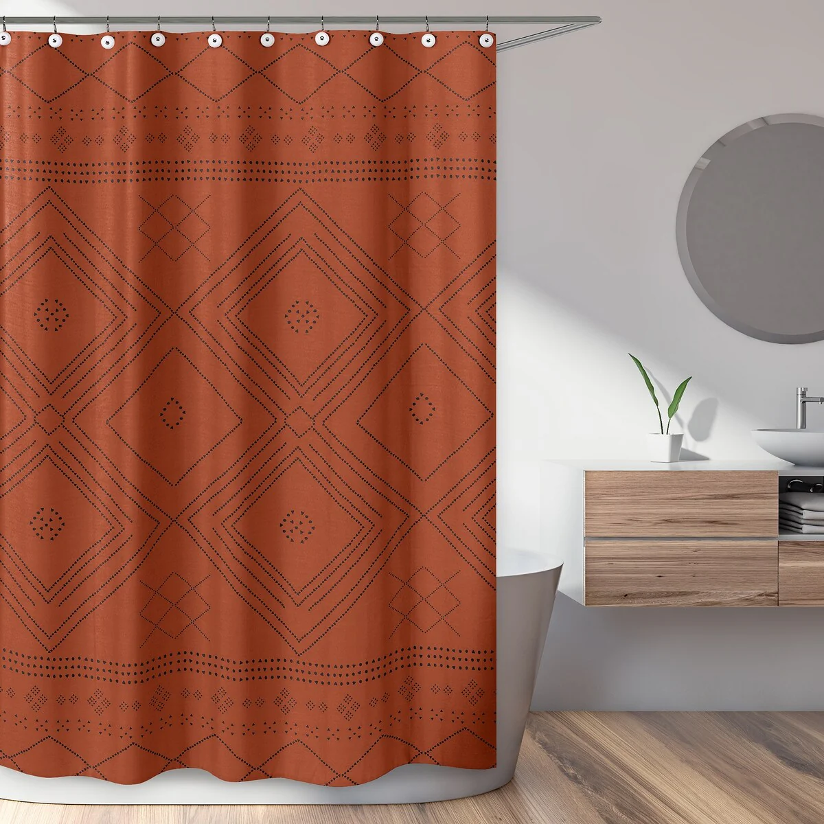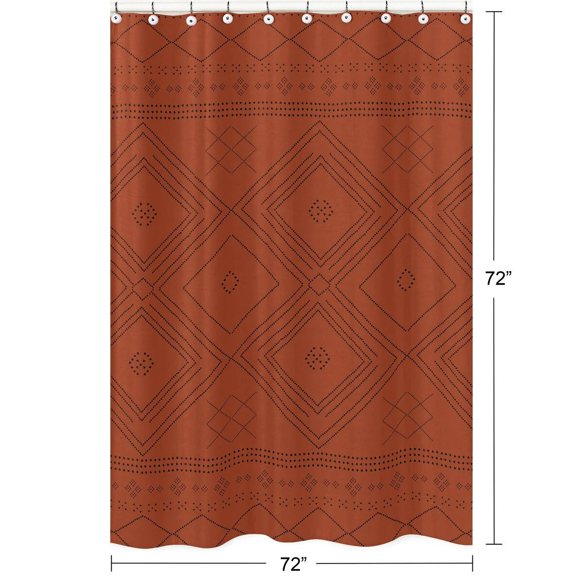 This Sweet Jojo Designs Black and Orange bohemian geometric tribal aztec Fabric Bathroom Shower Curtain will create a southwestern rustic look that will complement any room. This shower curtain combines an exclusive mix of dotted diamond patterns and boho design, featuring an detailed tribal pattern. It uses the gorgeous color palette of burnt orange rust and black. This unique shower curtain will add an urban feel to your bathroom. This trendy shower curtain uses soft and wrinkle resistant brushed microfiber fabrics for long lasting wear and luxurious feel. This Sweet Jojo Designs luxury decorative shower curtain is machine washable for simple care. What a great and inexpensive way to get that instant makeover for your bathroom. Design: Bohemian tribal rust orange and black dotted pattern creates a rustic and southwestern look. This aztec urban design will compliment any bathroom in your home. Set and Dimensions: (1) Shower Curtain (72 in x 72 in) (Does not include liner or shower hooks) Materials and Care: Brushed Microfiber - Extremely soft and wrinkle resistant. Machine washable. Tumble dry low. Features: Buttonhole top makes for easy installation Matching Accessories: We offer coordinating bedding sets, decorative throw pillows, shower curtains, window panels, pouf covers, bed skirts, body pillows and more. Please check our store for these accessories.