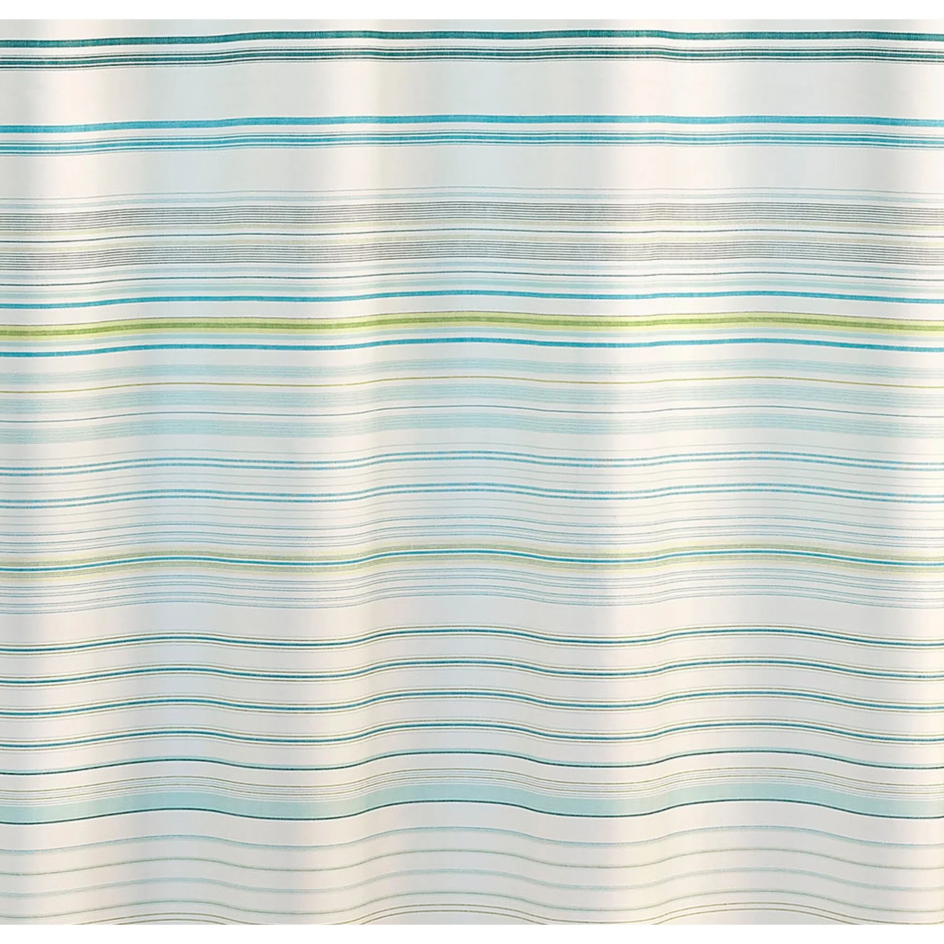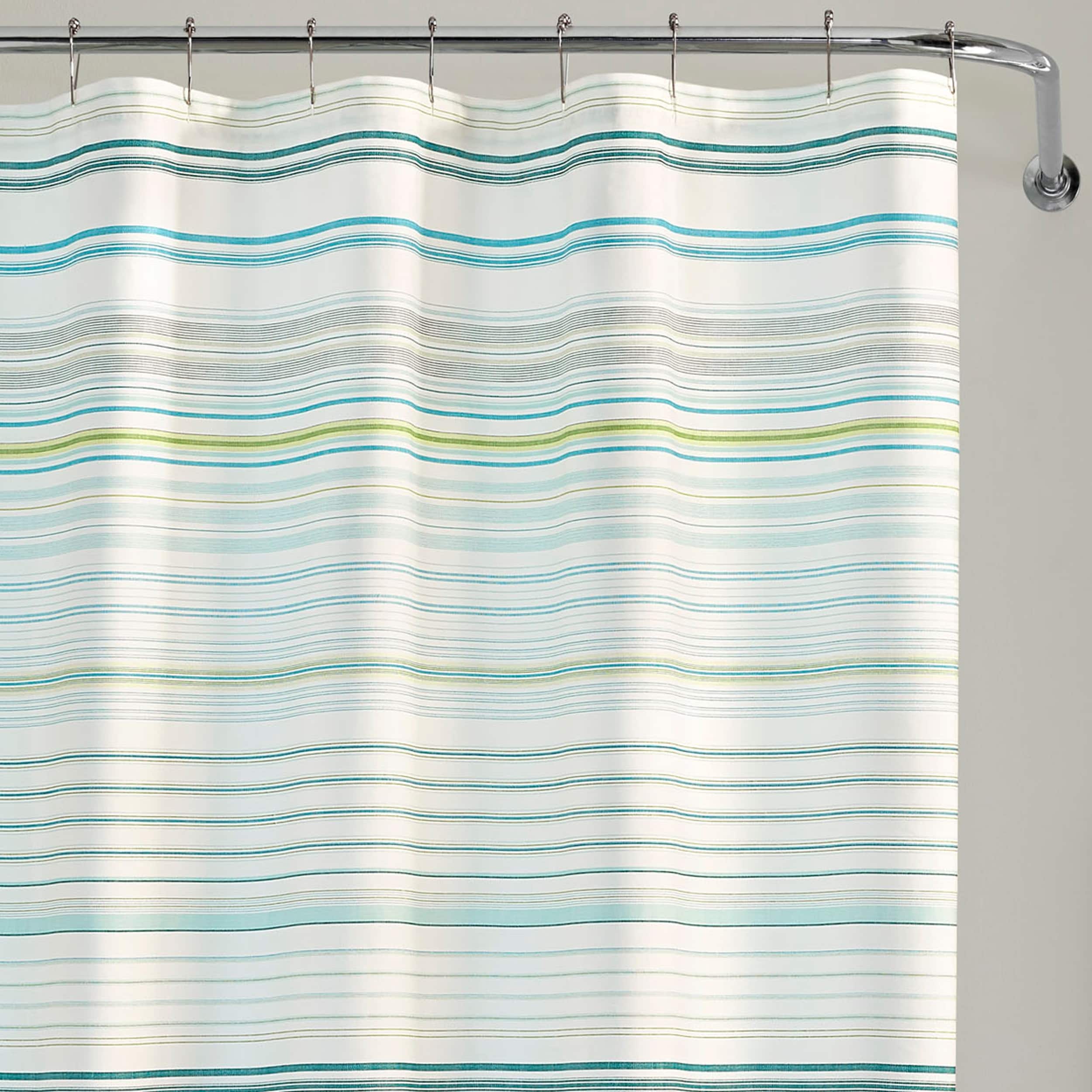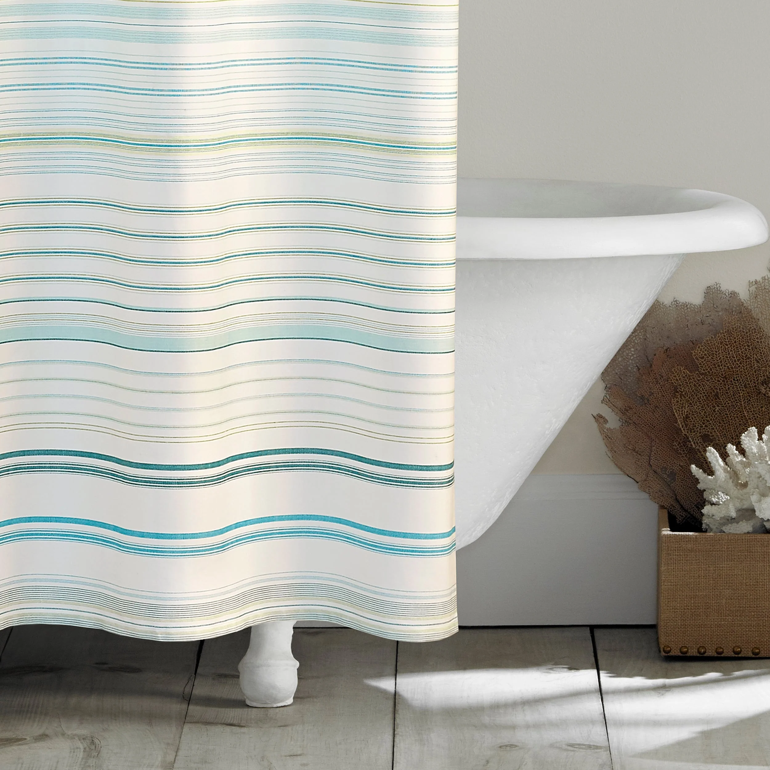 Breathe a tropical vibe into your bathroom with this La Scala Breezer shower curtain from Tommy Bahama. Stripes of ocean blues and palm tree greens exude a beach mood atop the white background for a refreshing feeling, and this cotton shower curtain is machine washable to help keep things crisp and clean.