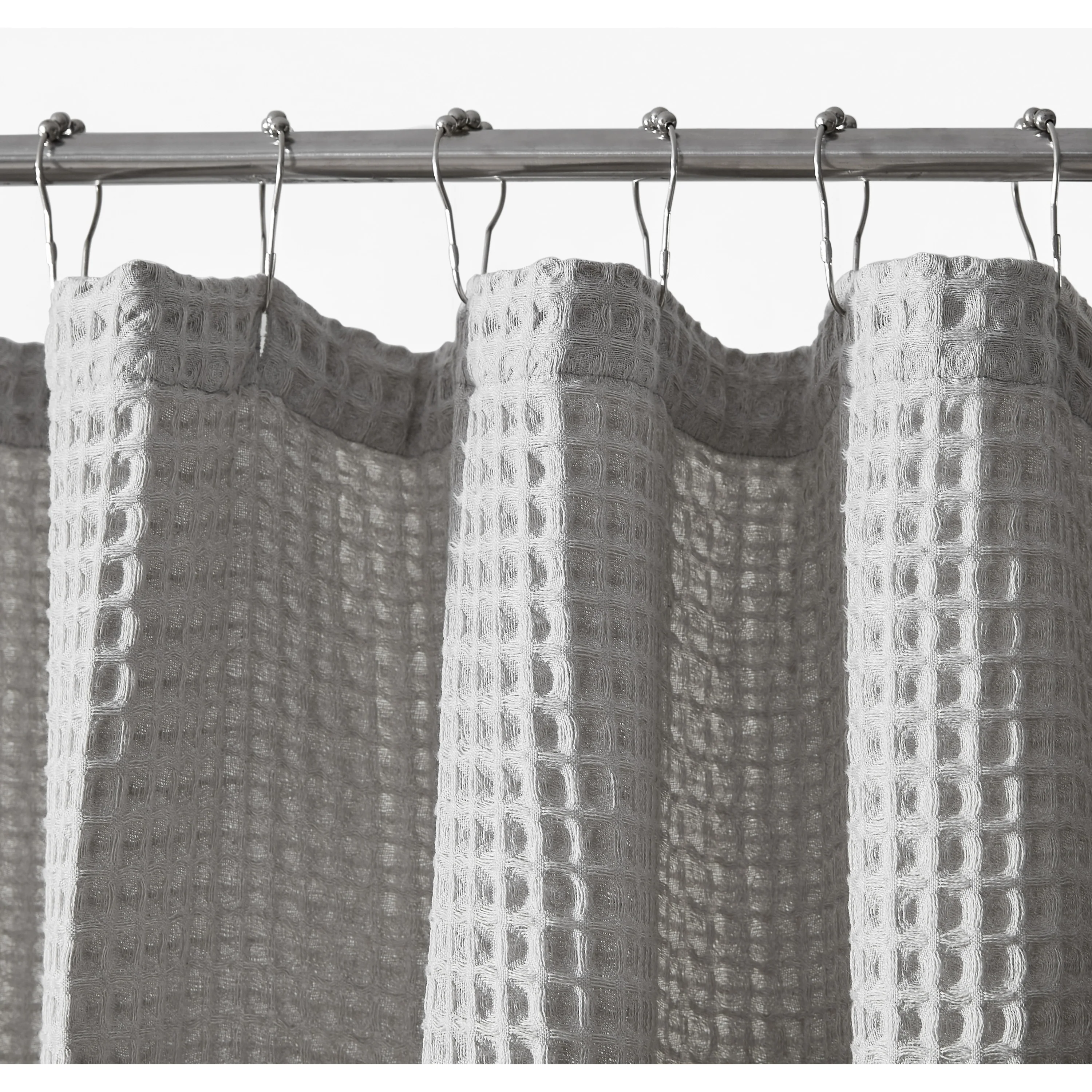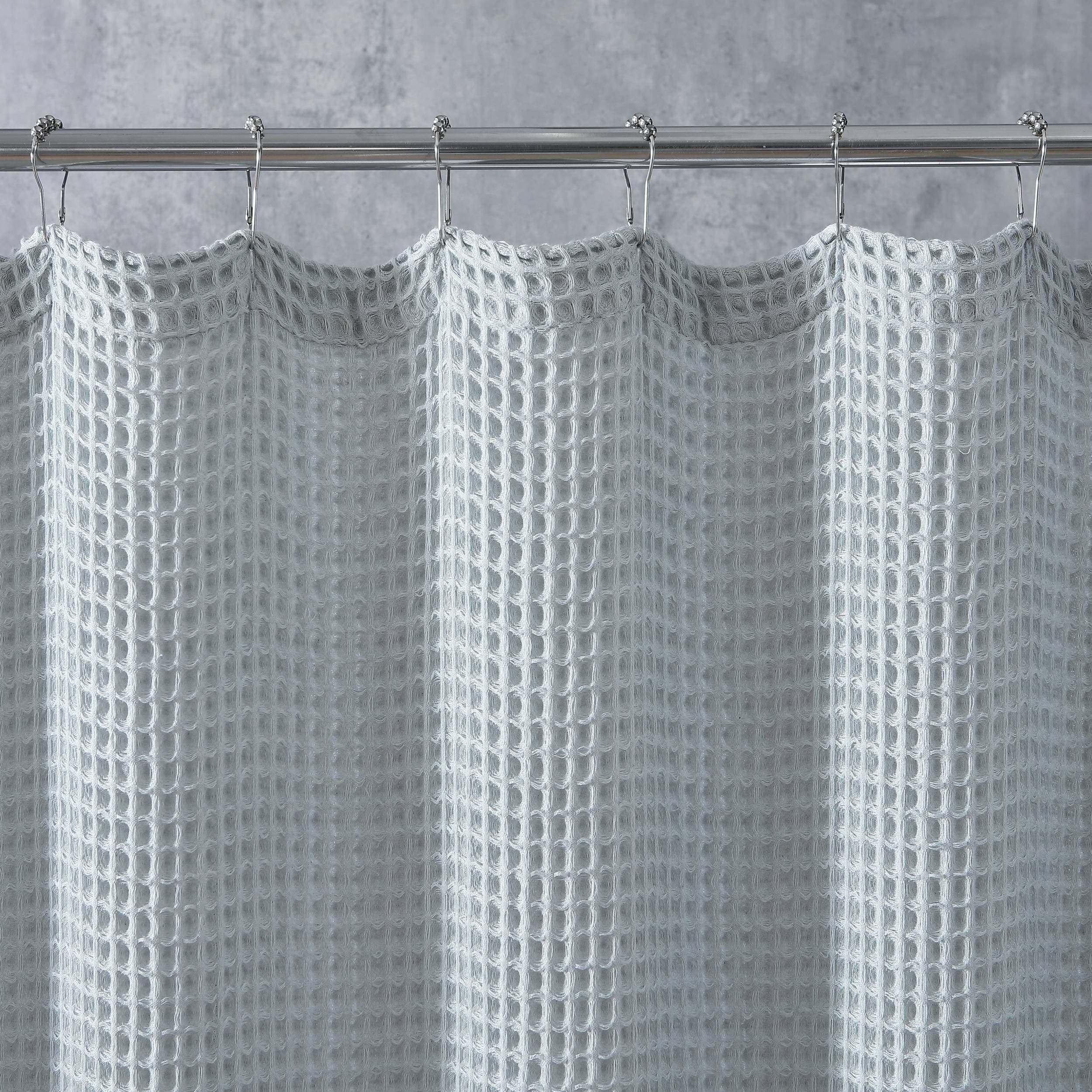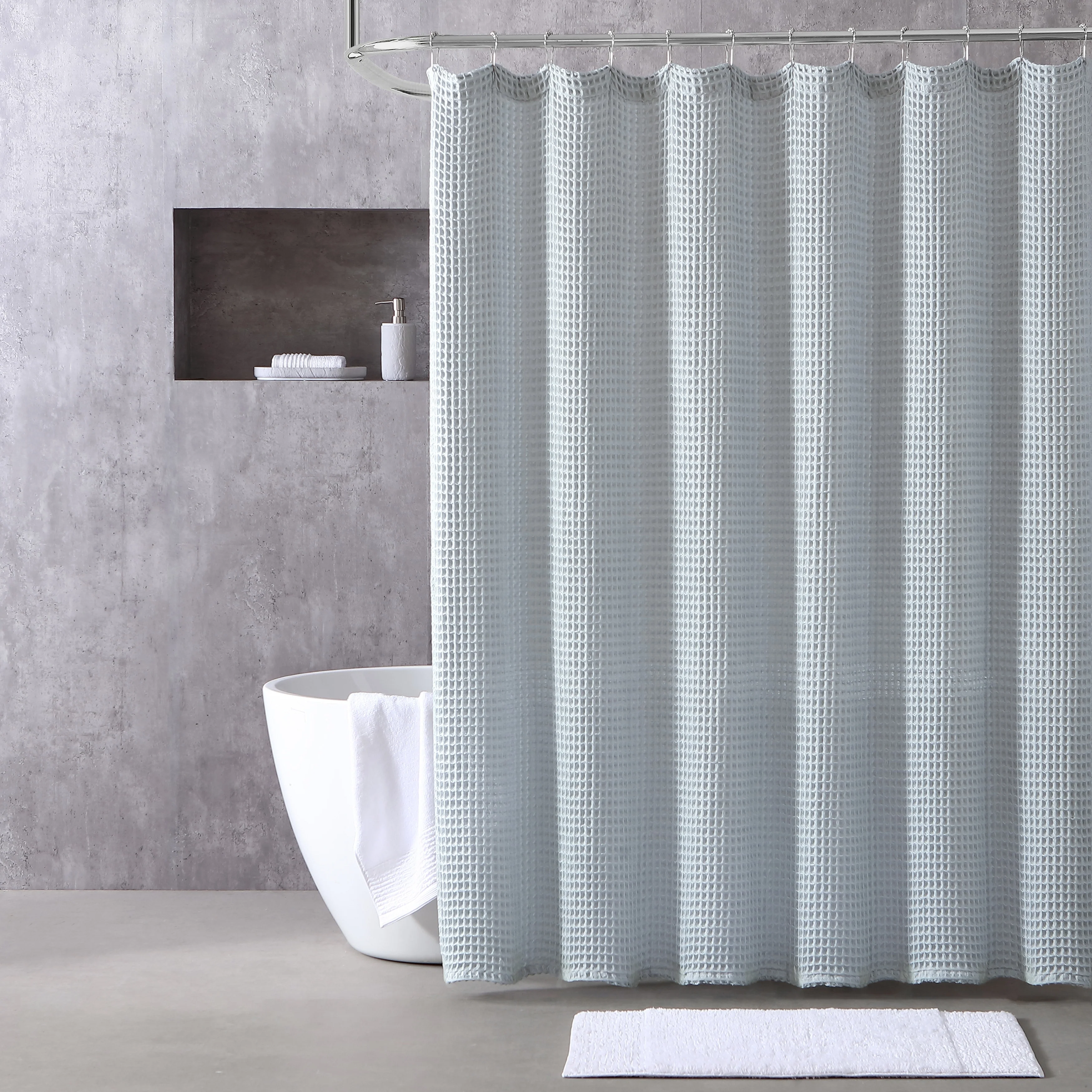 Bring gorgeous modern style to your bathroom decor with the Vera Wang Marled Waffle Shower Curtain. Crafted with a high quality cotton/polyester blend, this shower curtain is extremely durable and has a beautiful drape. Featuring a stunning solid waffle design and available in blue or grey, this shower curtain coordinates beautifully with an array of the Vera Wang towel sets and bath rug collections. Shower curtain features 12-button holes for easy use with curtain rings, sold separately. This shower curtain is machine washable for easy care.