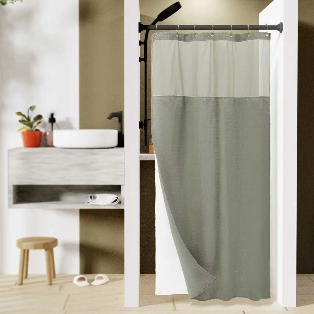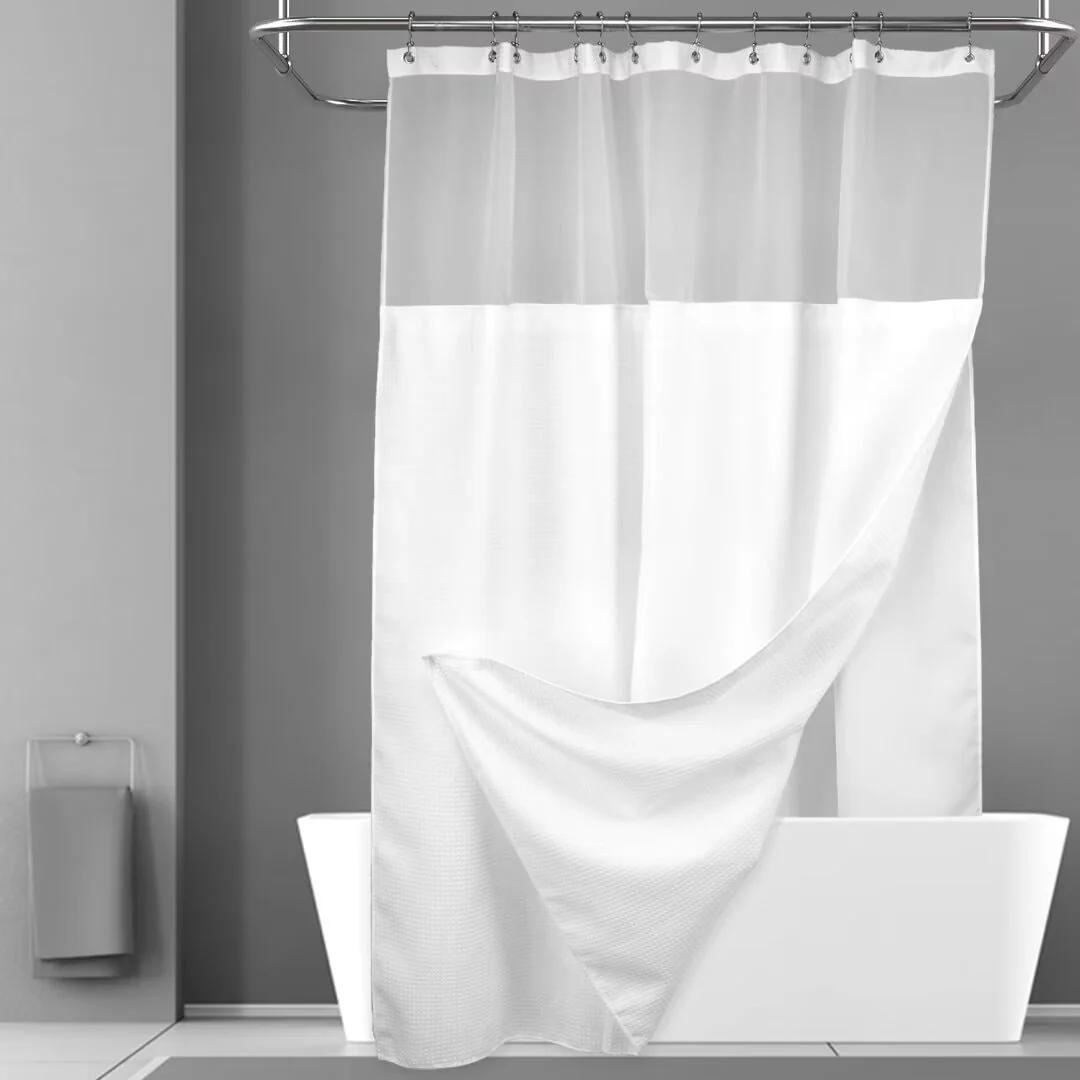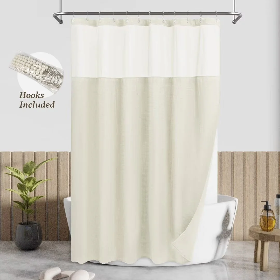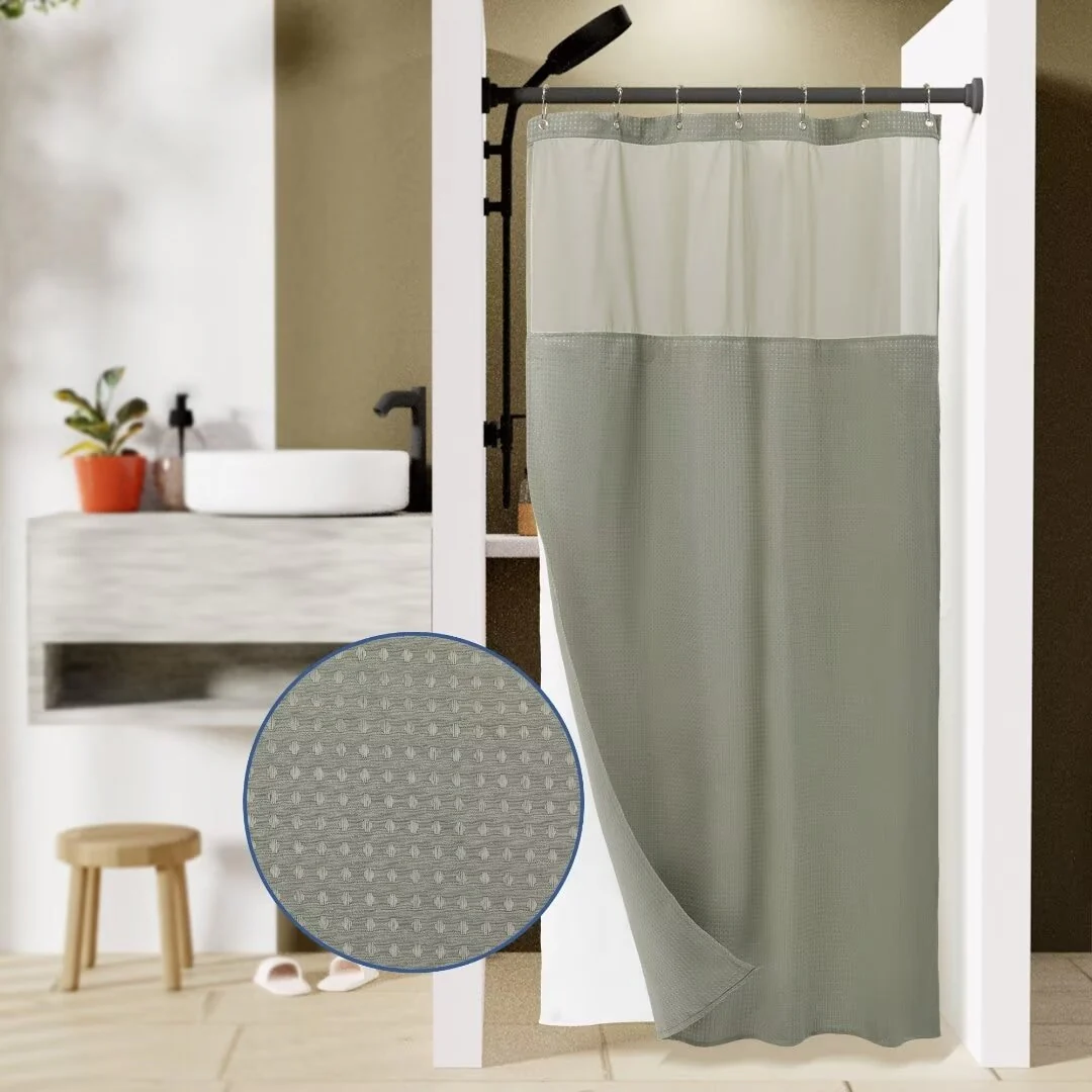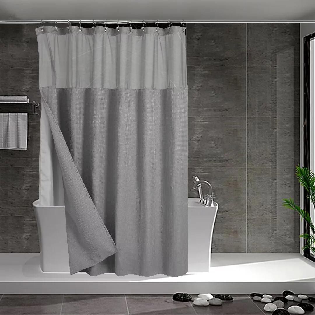Enhance your bathroom decor with this stylish waffle weave shower curtain. The classic waffle weave adds the depth and texture to your space while providing a soft and luxurious feel. Meticulously crafted from 100% high-quality and water resistant polyester, this curtain is designed to withstand daily use and maintain its shape and texture over time. Featuring the detachable snap-in liner, the curtain is easy to remove on/off for cleaning and replacing, ensuring a neat and tidy appearance. The sheer window allows natural light to filter through, enhancing the ambiance of your bathroom and provide a touch of elegance. Package includes 12 hooks.