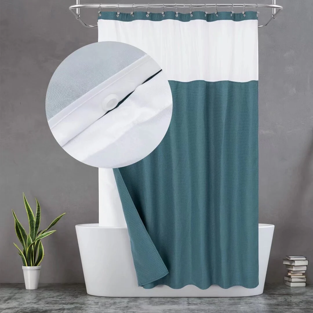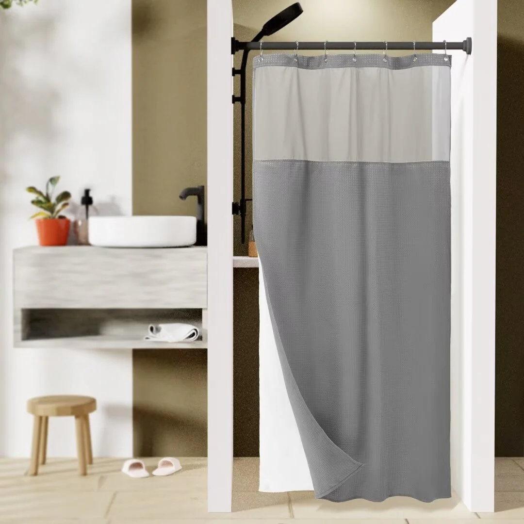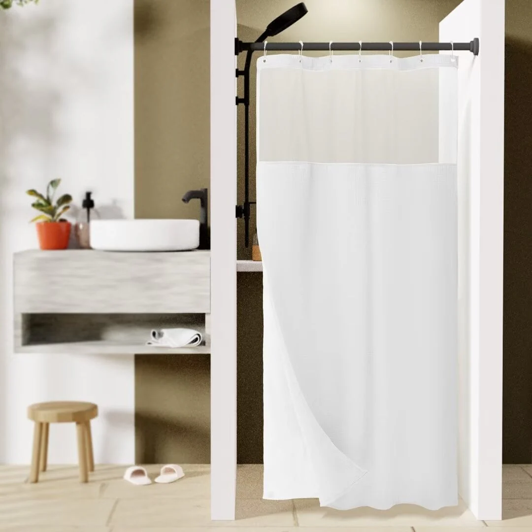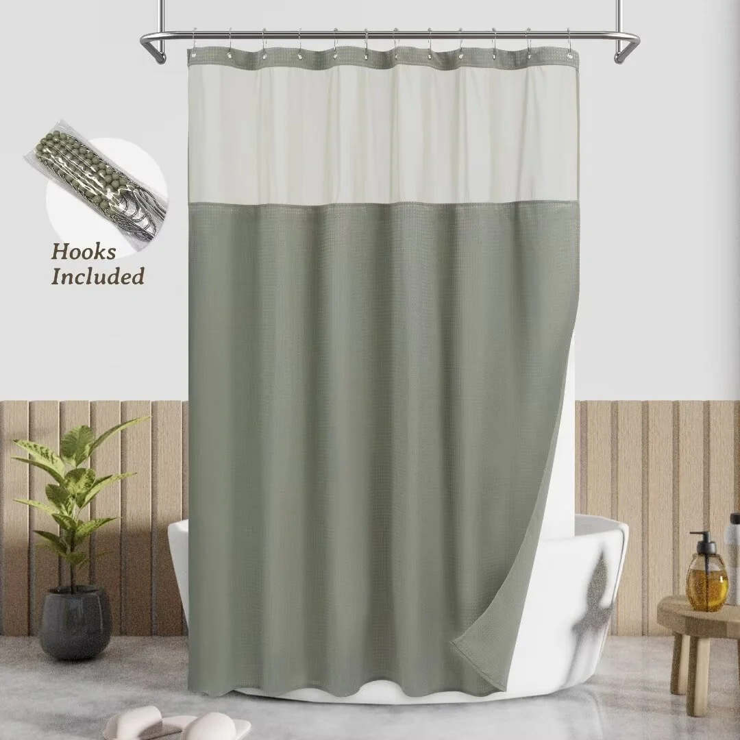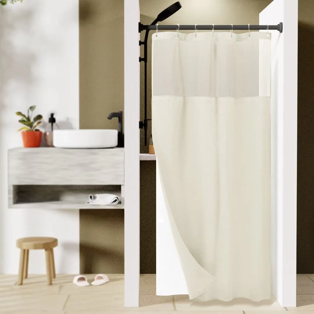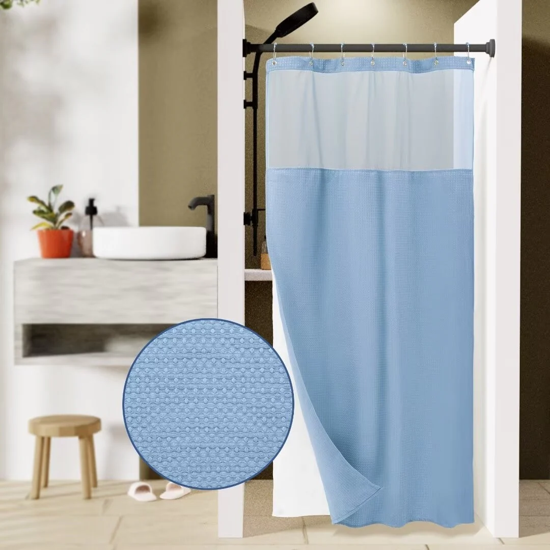 Enhance your bathroom decor with this stylish waffle weave shower curtain. The classic waffle weave adds the depth and texture to your space while providing a soft and luxurious feel. Meticulously crafted from 100% high-quality and water resistant polyester, this curtain is designed to withstand daily use and maintain its shape and texture over time. Featuring the detachable snap-in liner, the curtain is easy to remove on/off for cleaning and replacing, ensuring a neat and tidy appearance. The sheer window allows natural light to filter through, enhancing the ambiance of your bathroom and provide a touch of elegance. Package includes 12 hooks.