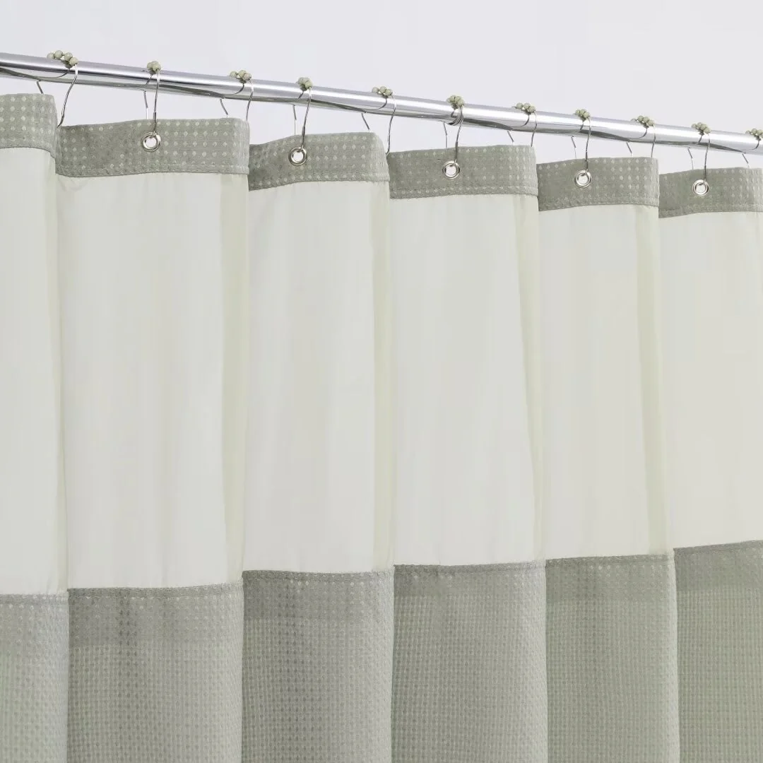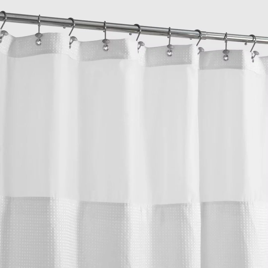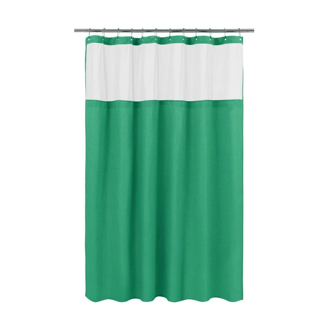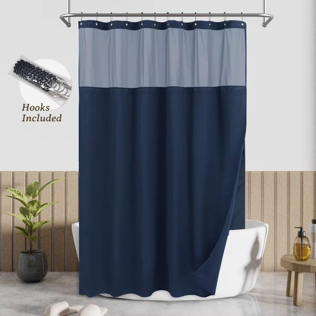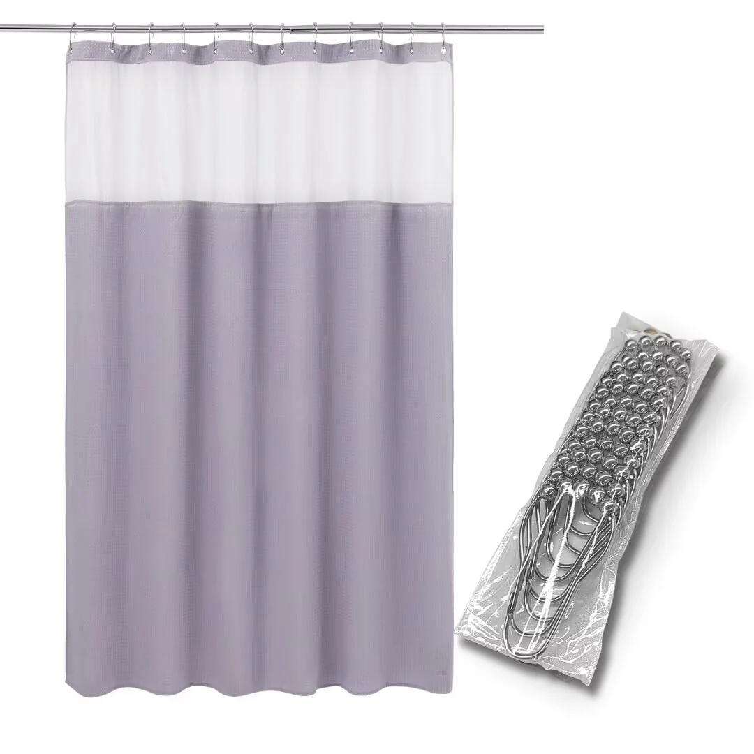 Enhance your bathroom decor with this stylish waffle weave shower curtain. The classic waffle weave adds the depth and texture to your space while providing a soft and luxurious feel. Meticulously crafted from 100% high-quality and water resistant polyester, this curtain is designed to withstand daily use and maintain its shape and texture over time. Featuring the detachable snap-in liner, the curtain is easy to remove on/off for cleaning and replacing, ensuring a neat and tidy appearance. The sheer window allows natural light to filter through, enhancing the ambiance of your bathroom and provide a touch of elegance. Package includes 12 hooks.