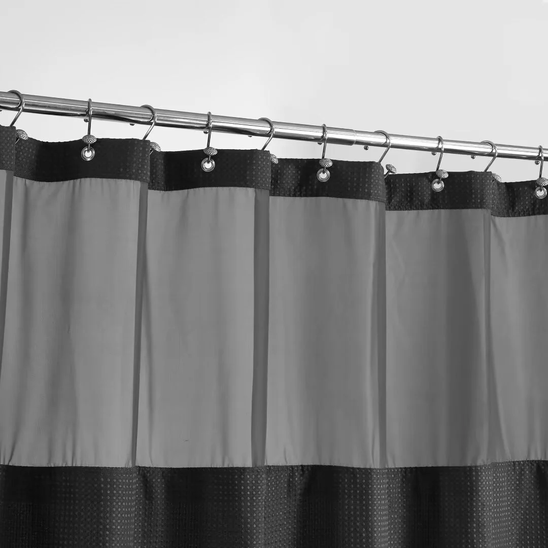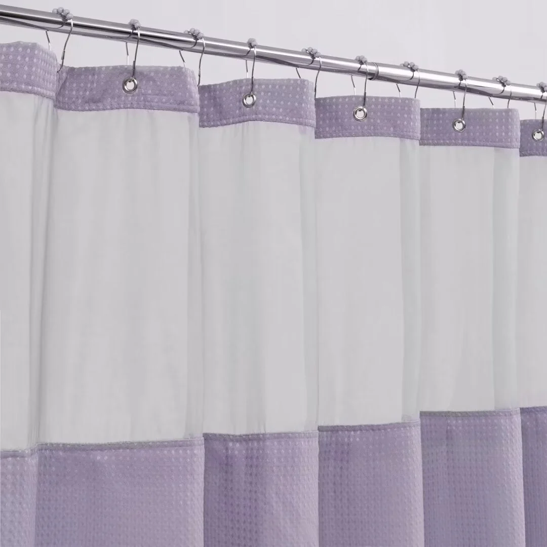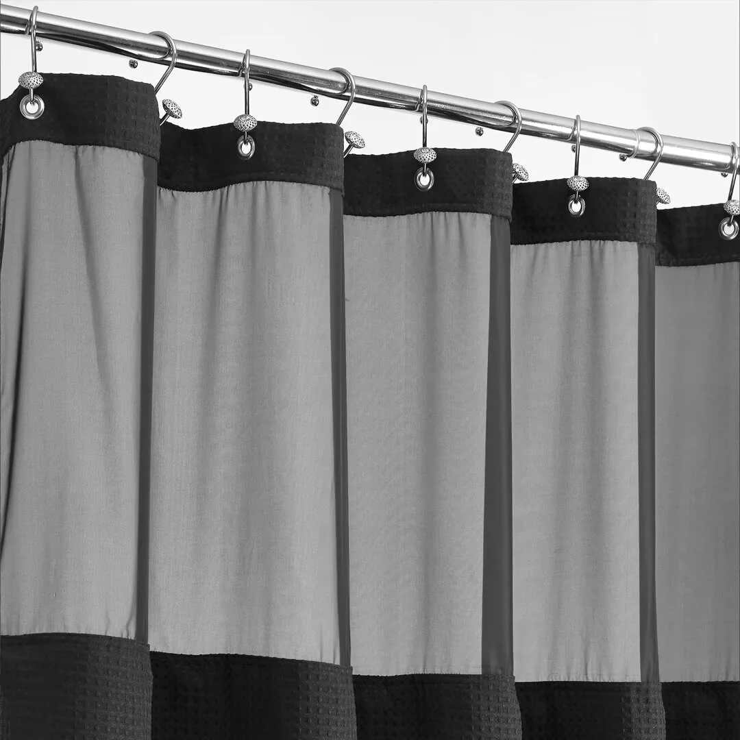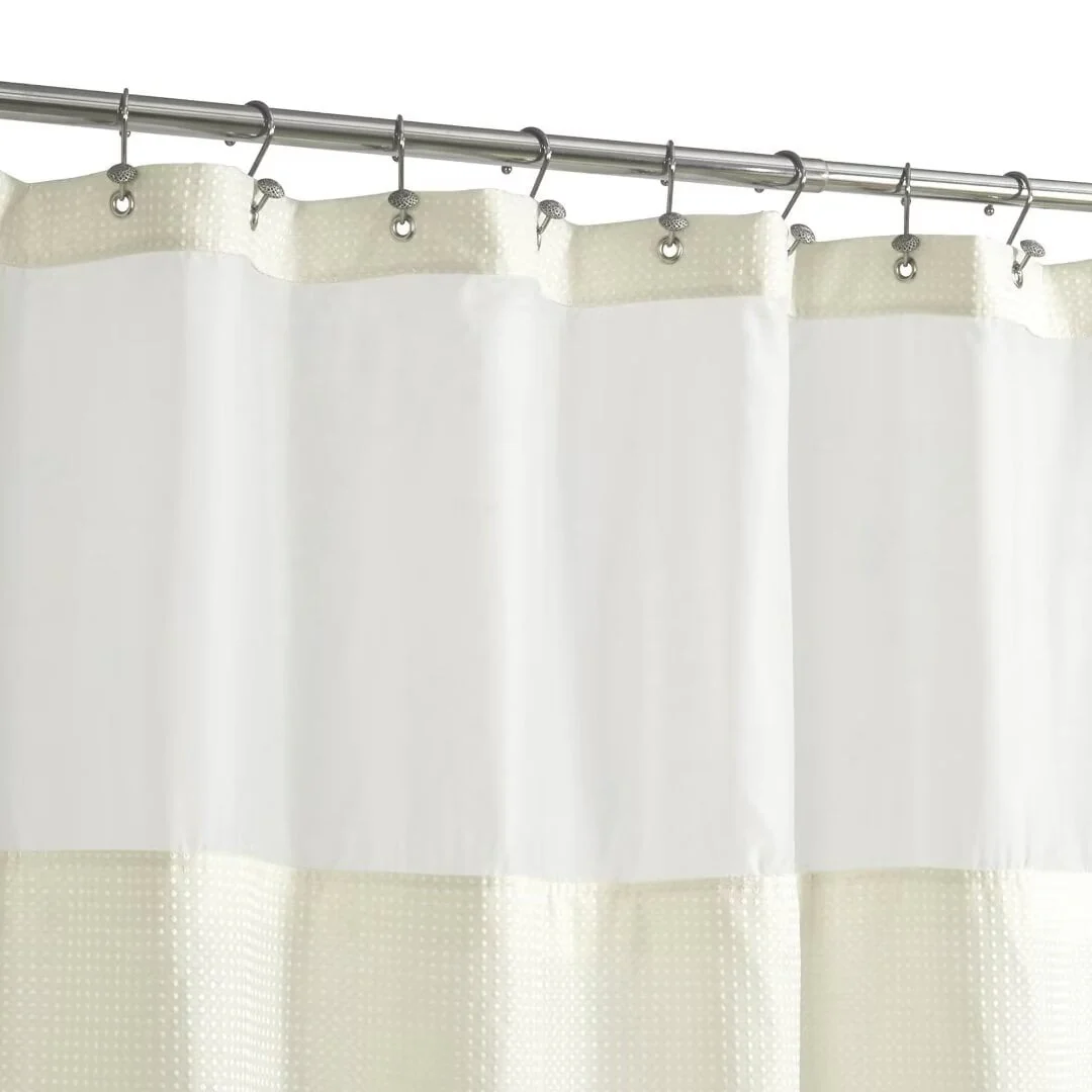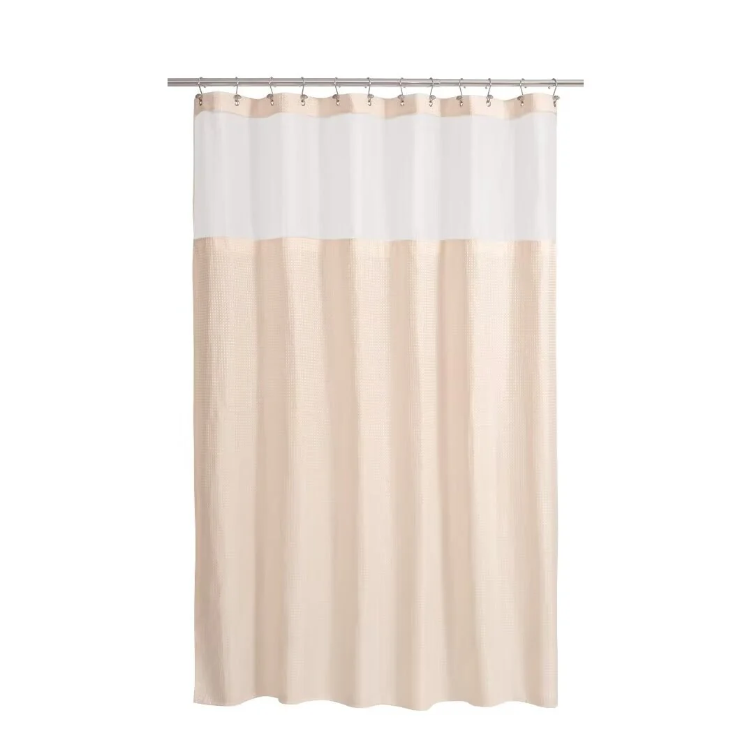 Enhance your bathroom decor with this stylish waffle weave shower curtain. The classic waffle weave adds the depth and texture to your space while providing a soft and luxurious feel. Meticulously crafted from 100% high-quality and water resistant polyester, this curtain is designed to withstand daily use and maintain its shape and texture over time. Featuring the detachable snap-in liner, the curtain is easy to remove on/off for cleaning and replacing, ensuring a neat and tidy appearance. The sheer window allows natural light to filter through, enhancing the ambiance of your bathroom and provide a touch of elegance. Package includes 12 hooks.
