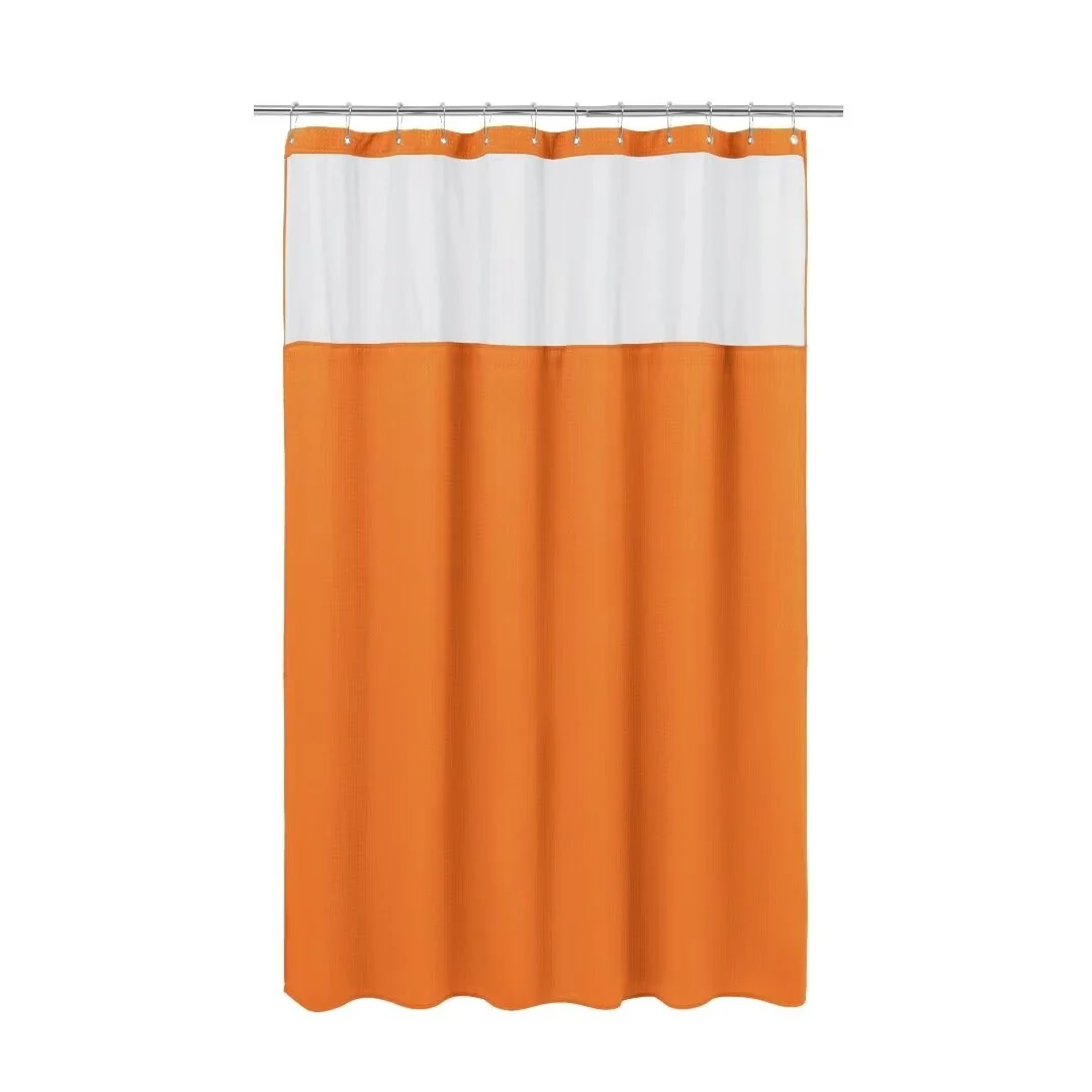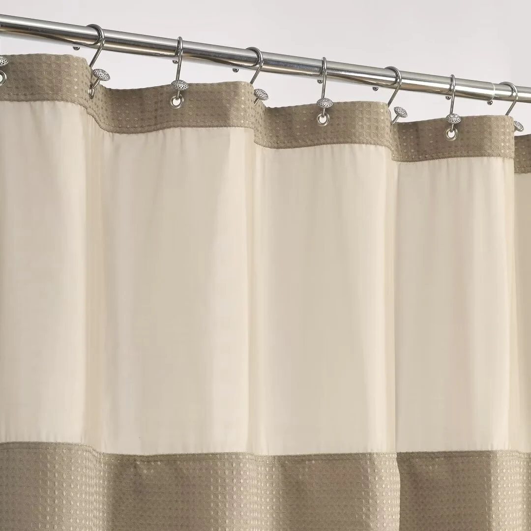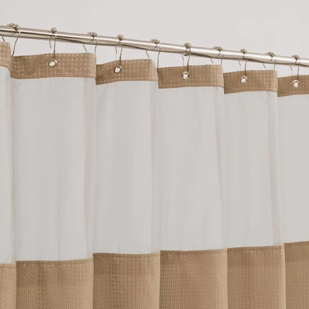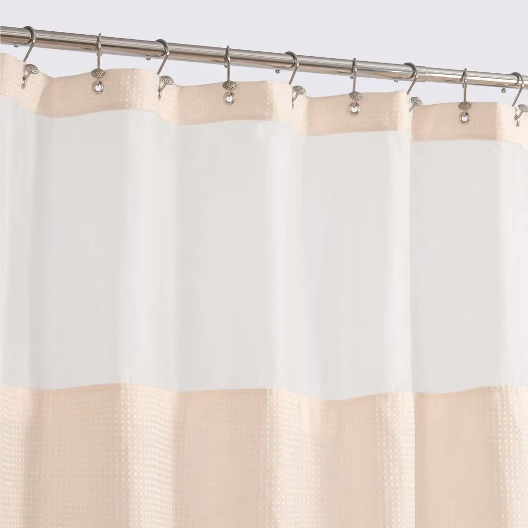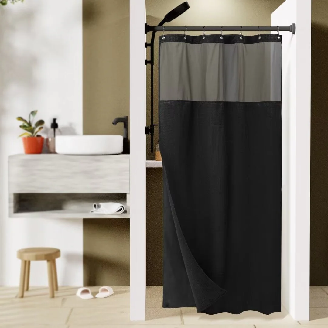 Enhance your bathroom decor with this stylish waffle weave shower curtain. The classic waffle weave adds the depth and texture to your space while providing a soft and luxurious feel. Meticulously crafted from 100% high-quality and water resistant polyester, this curtain is designed to withstand daily use and maintain its shape and texture over time. Featuring the detachable snap-in liner, the curtain is easy to remove on/off for cleaning and replacing, ensuring a neat and tidy appearance. The sheer window allows natural light to filter through, enhancing the ambiance of your bathroom and provide a touch of elegance. Package includes 12 hooks.