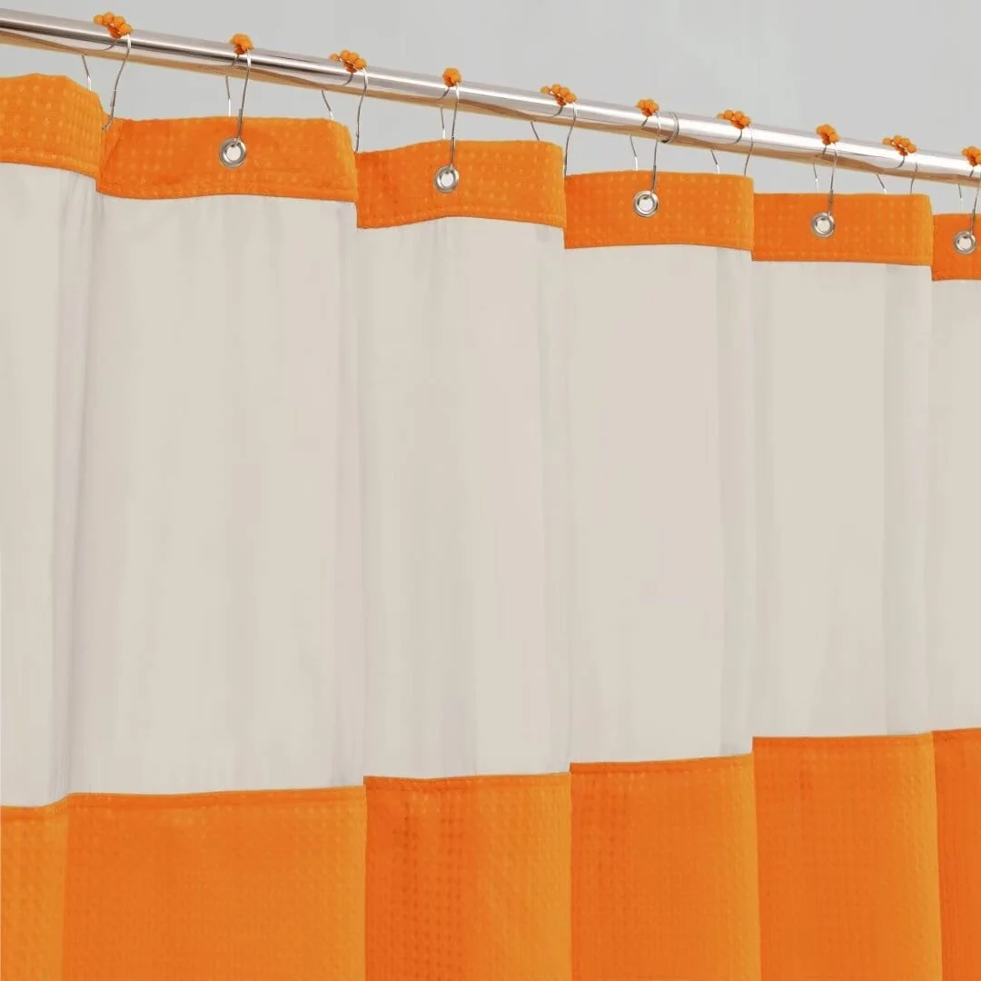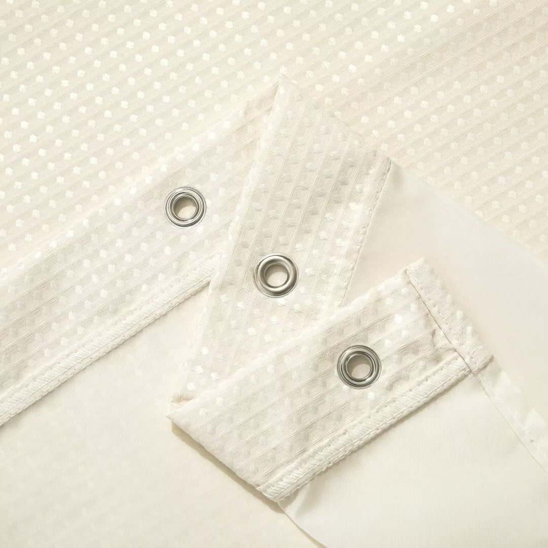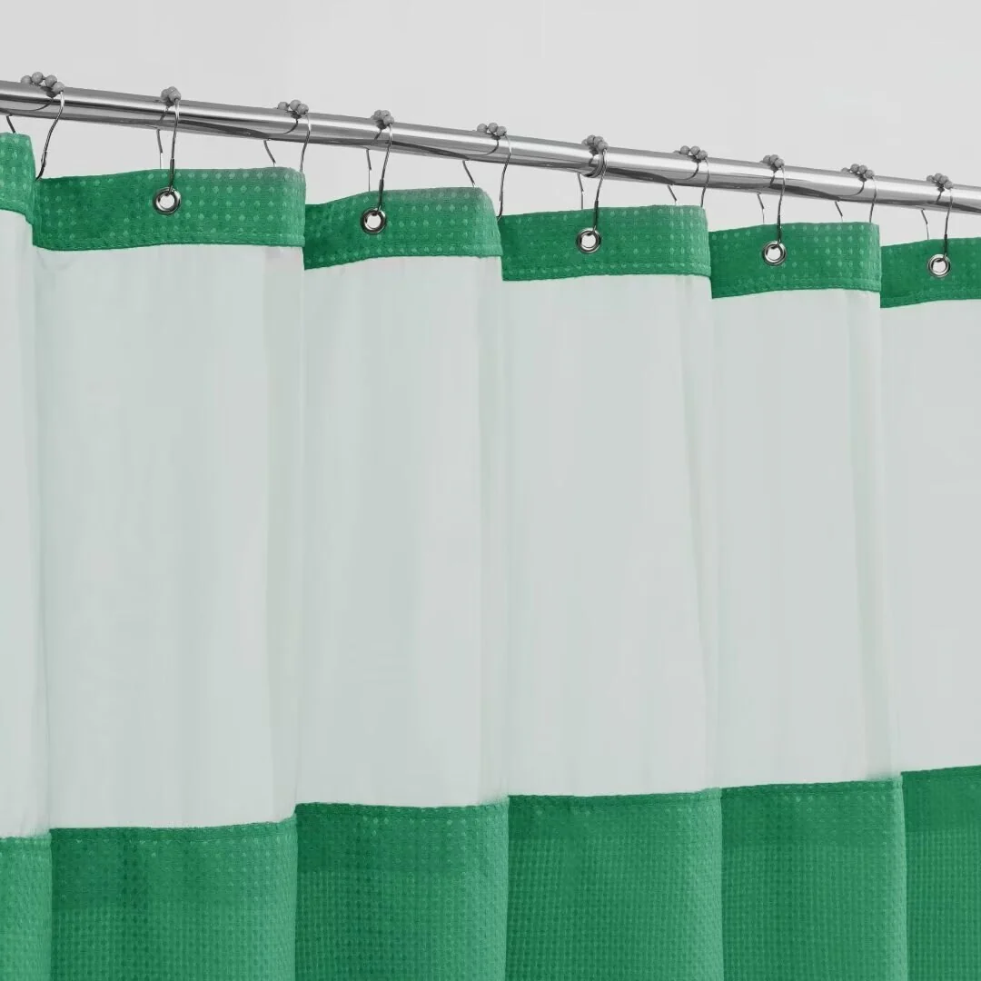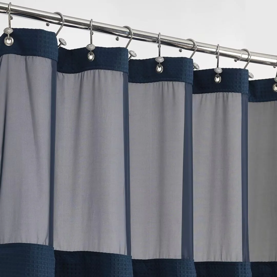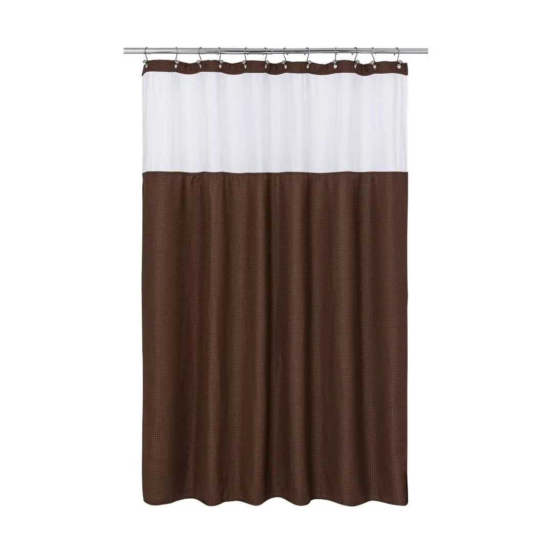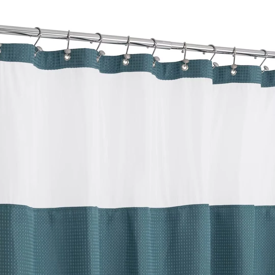 Enhance your bathroom decor with this stylish waffle weave shower curtain. The classic waffle weave adds the depth and texture to your space while providing a soft and luxurious feel. Meticulously crafted from 100% high-quality and water resistant polyester, this curtain is designed to withstand daily use and maintain its shape and texture over time. Featuring the detachable snap-in liner, the curtain is easy to remove on/off for cleaning and replacing, ensuring a neat and tidy appearance. The sheer window allows natural light to filter through, enhancing the ambiance of your bathroom and provide a touch of elegance. Package includes 12 hooks.