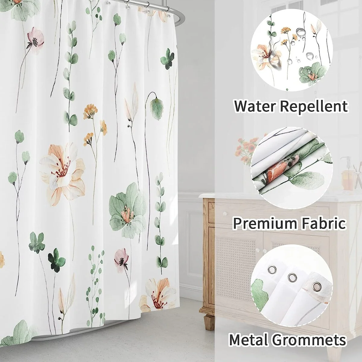 【PREMIUM QUALITY】- Made of 100% polyester fabric, it is soft and comfortable to touch, not easy to wear and tear. The watercolor floral shower curtain is composed of enchanting flowers, delicate branches and leaves. Drapes beautifully for a fresh, new look in your bathroom. 【HD DIGITAL PRINTING】- Use state-of-the-art digital printing technology that allows vibrant colors and clear images to be preserved, no smell, no fading. Complete any RV, camper, gym, spa, condo, hotel, home or dorm shower with this versatile shower curtain. 【WATERPROOF DESIGN】- Adopting rolling ball type waterproof technology, which can promote the formation of water droplets, causing water to roll off the surface quickly. It can be used alone or matched with a shower curtain liner. 【EASY TO INSTALL】- Decorated with metal grommets on top to prevent holes from ripping or tearing, and free 12pcs plastic hook it will not rust. Installation is as effortless as attaching the grommets to the shower rod. 【EASY CARE】- Machine wash separately in cold water, gentle cycle, do not bleach it, dry flat, iron at low setting as needed. It'll be quick dry after washing and easy care. Mesh laundry bags are recommended.