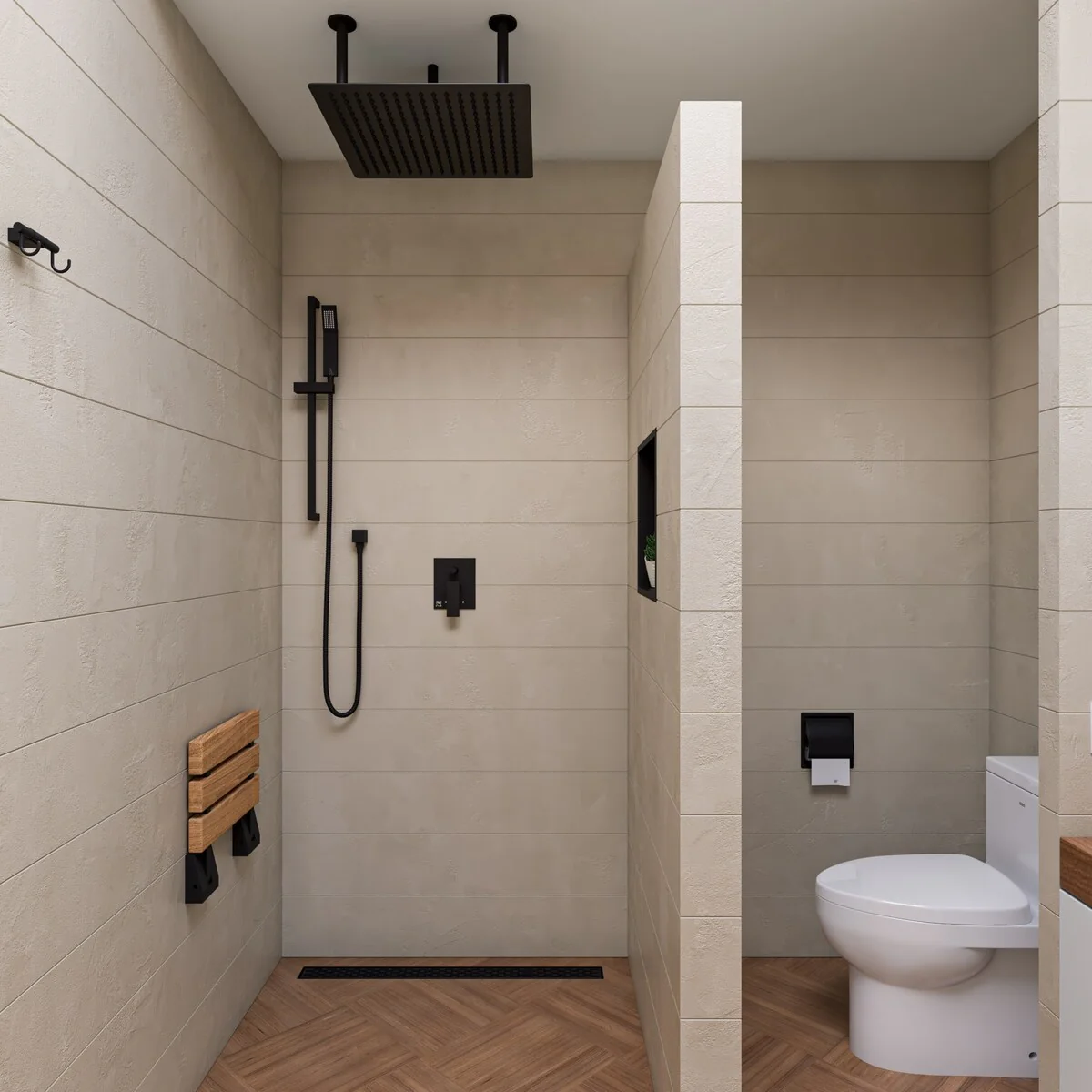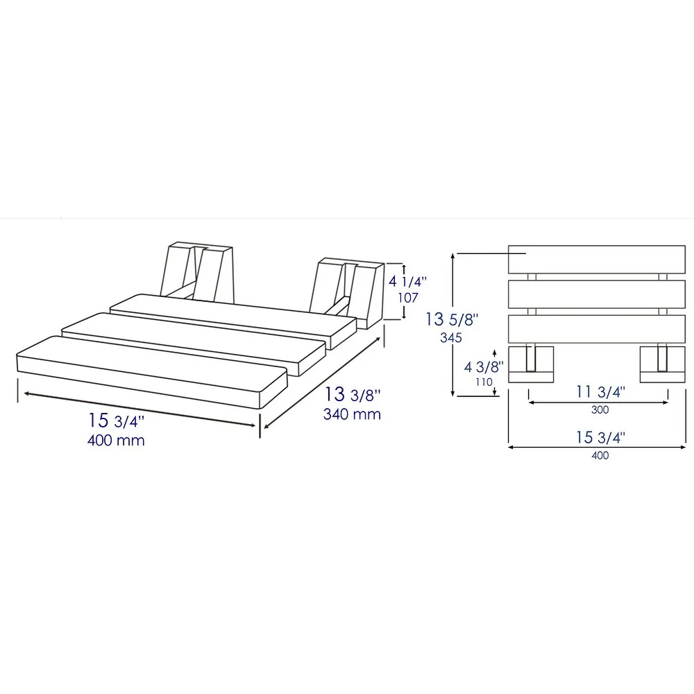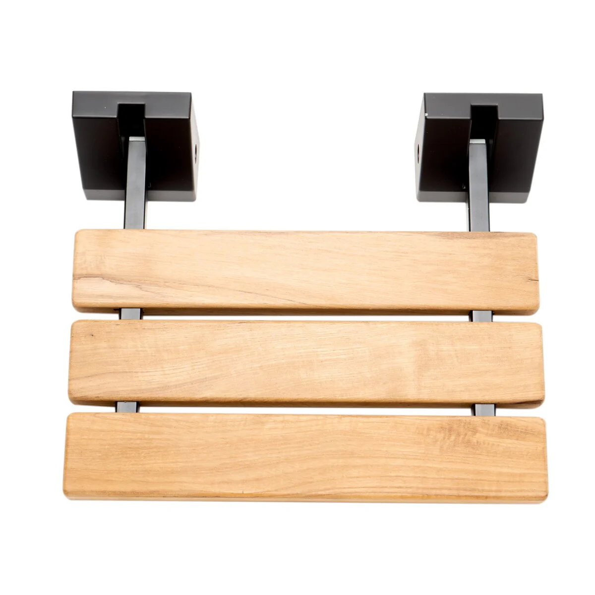 Features natural unstained wood - leaving you to decide if you like the apperance of natural teak wood or prefer to stain or oil the wood to match your style.When properly installed, the maximum safe loading weight on this seat is 300 lbs.ADA Compliant as long as it's installed at the correct comfortable height for Americans with Disabilities.Durable construction - made of natural solid teak wood with alumnium mounting bracket and brass seat bars.Requires installation onto a solid surface such as wooden studs or concrete wall - not just on drywall.Seat folds up/down for efficient use of space. Can be left in the up or down position.Includes all hardware needed for secure installation.When folded the seat sticks out from the wall by 2 1/4' at its widest point.The two cover plates which conceal the part that mounts to the wall are made of durable ABS plastic and coated with a matching finish.