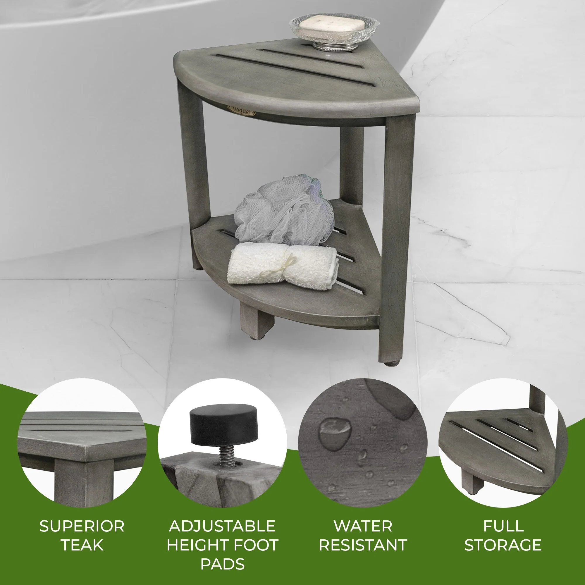 CoastalVogue teak wood shower shelf is 17 inches across. The included foot leveling pads provide adjustments due to any minor slope in shower floors, promoting extra safety and stability. The two-tier corner shelf provides additional storage and easy access to your toiletries, towels, or other essential items. The water-resistant teak ensures long-lasting durability. This sturdy teak bench provides comfort and convenience in your shower or bathroom. The natural teak finish makes it perfect for any room inside or outside of your home.