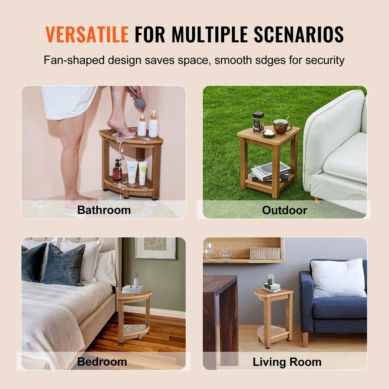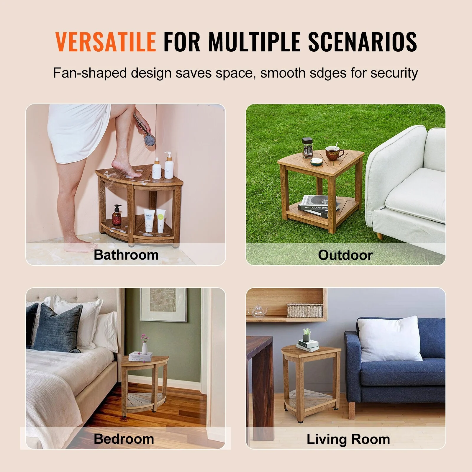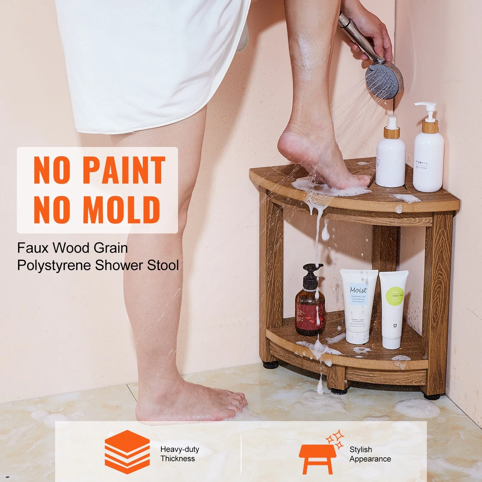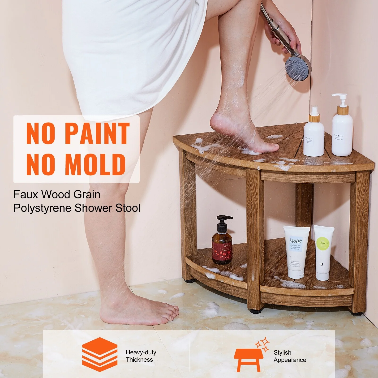 - Versatile: Double-layered design increases storage space, suitable for storing towels, shower gel, and other items, serving as a footrest or storage stool for convenient foot care and showering. Fan-shaped design fits snugly against walls, making efficient use of corner space. Suitable for use in bathrooms, outdoors, bedrooms, living rooms, and more.