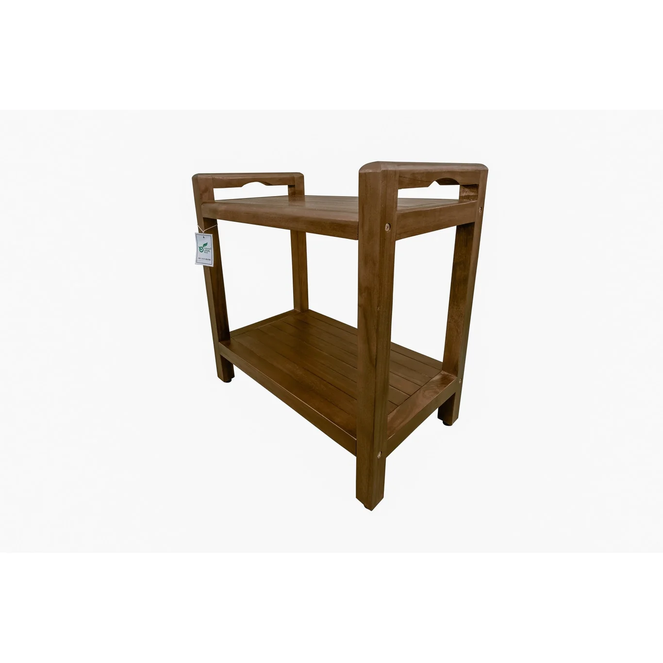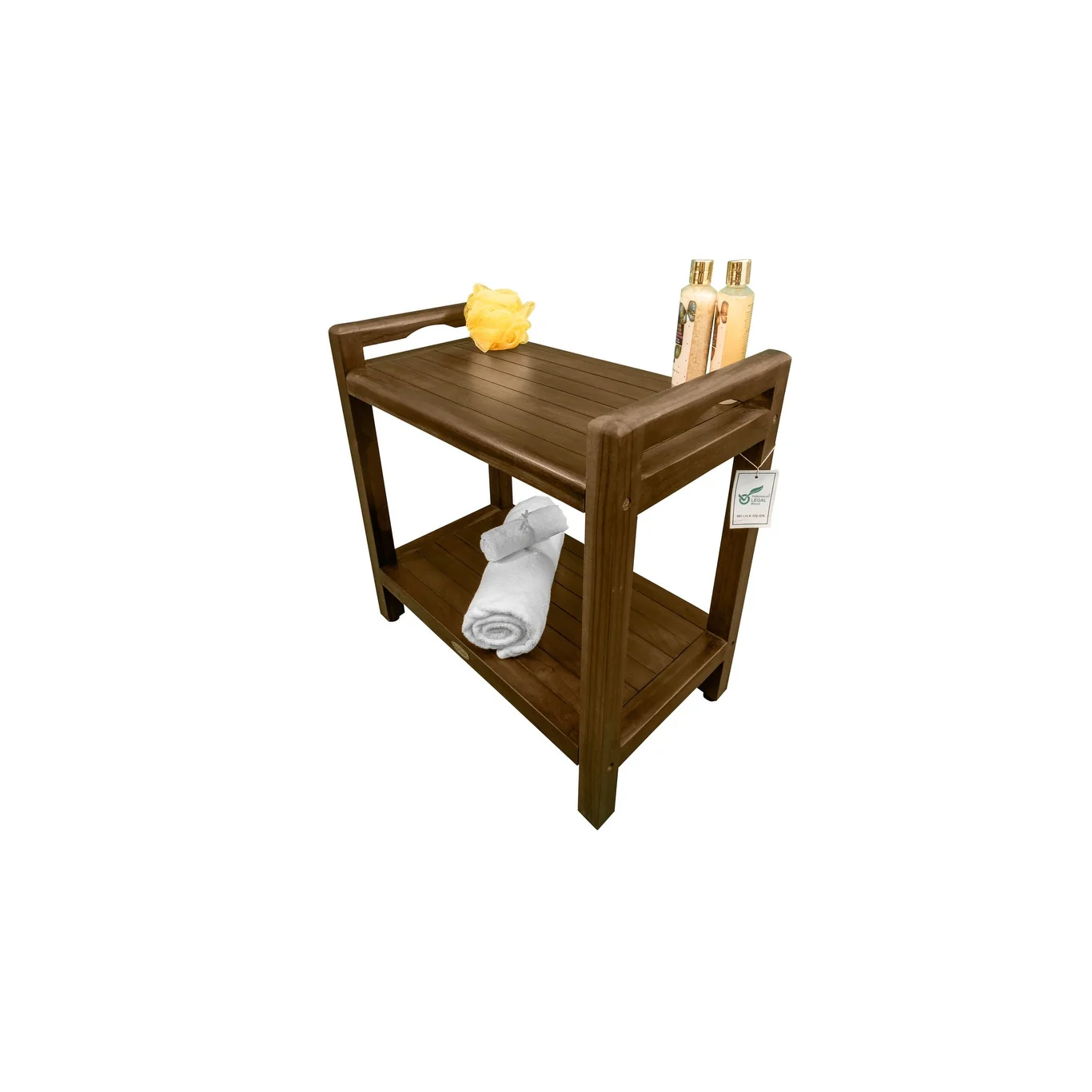 Our DecoTeak LiftAide Eleganto 24 inch wide teak shower bench within integrated storage shelf.